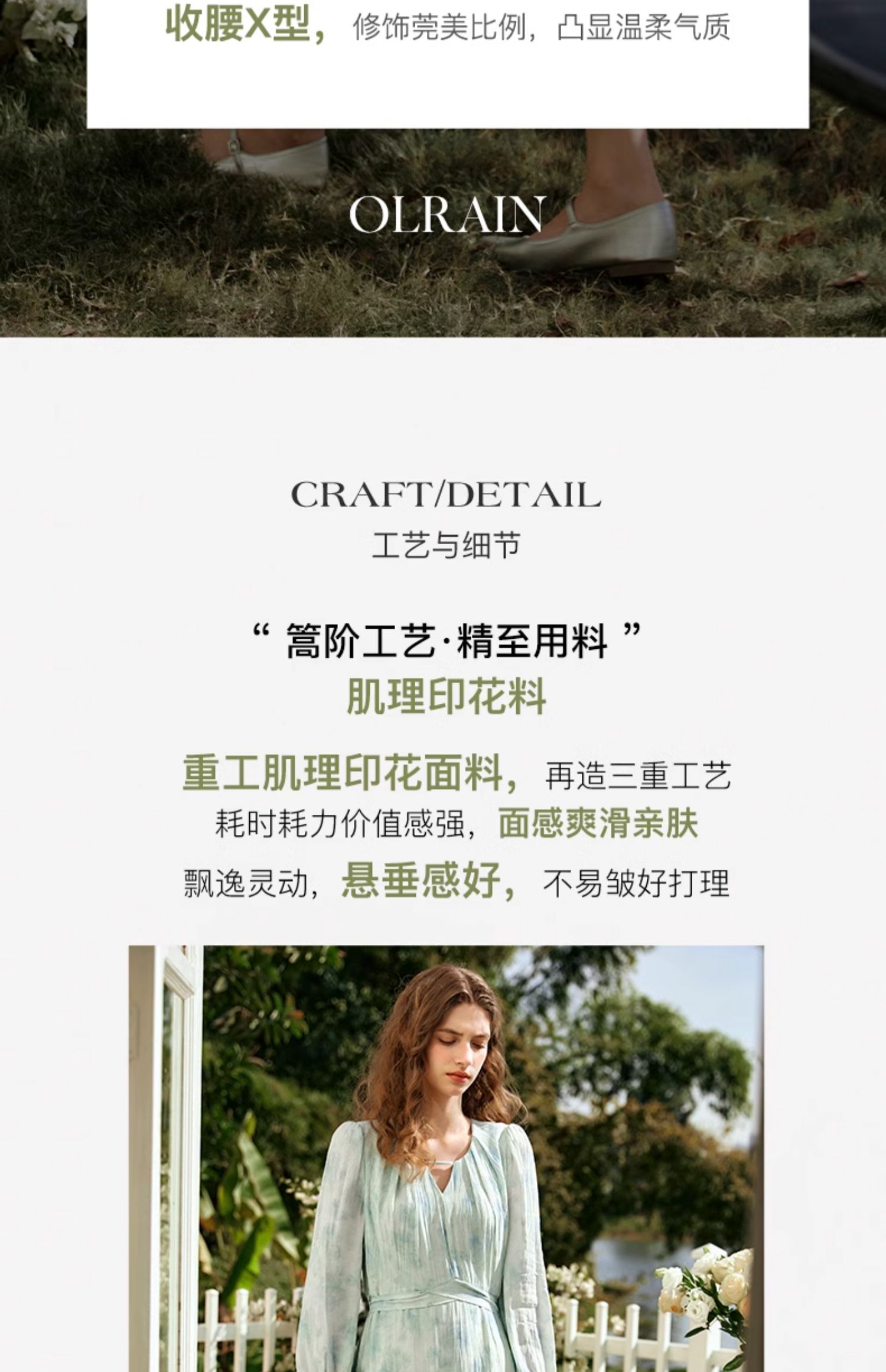 - “精致”是欧芮儿olrain品牌文化的核心,欧芮儿认为,精致的女人,不但要外在动人,更要内在迷人,内外兼修,有魅力、有气质、有内涵,自信而不自傲,优雅而不矫揉,自有万种风情而不轻浮,更不故作矜持。