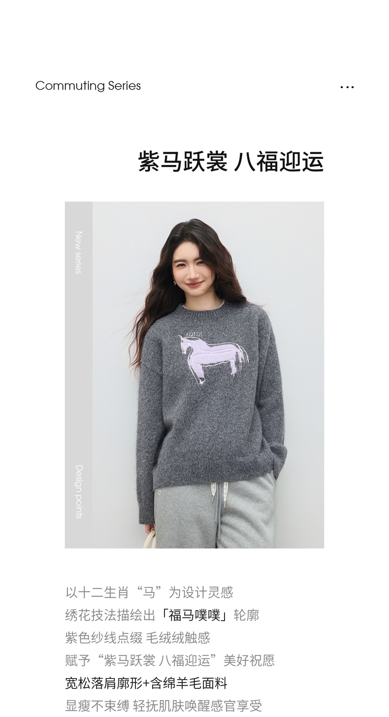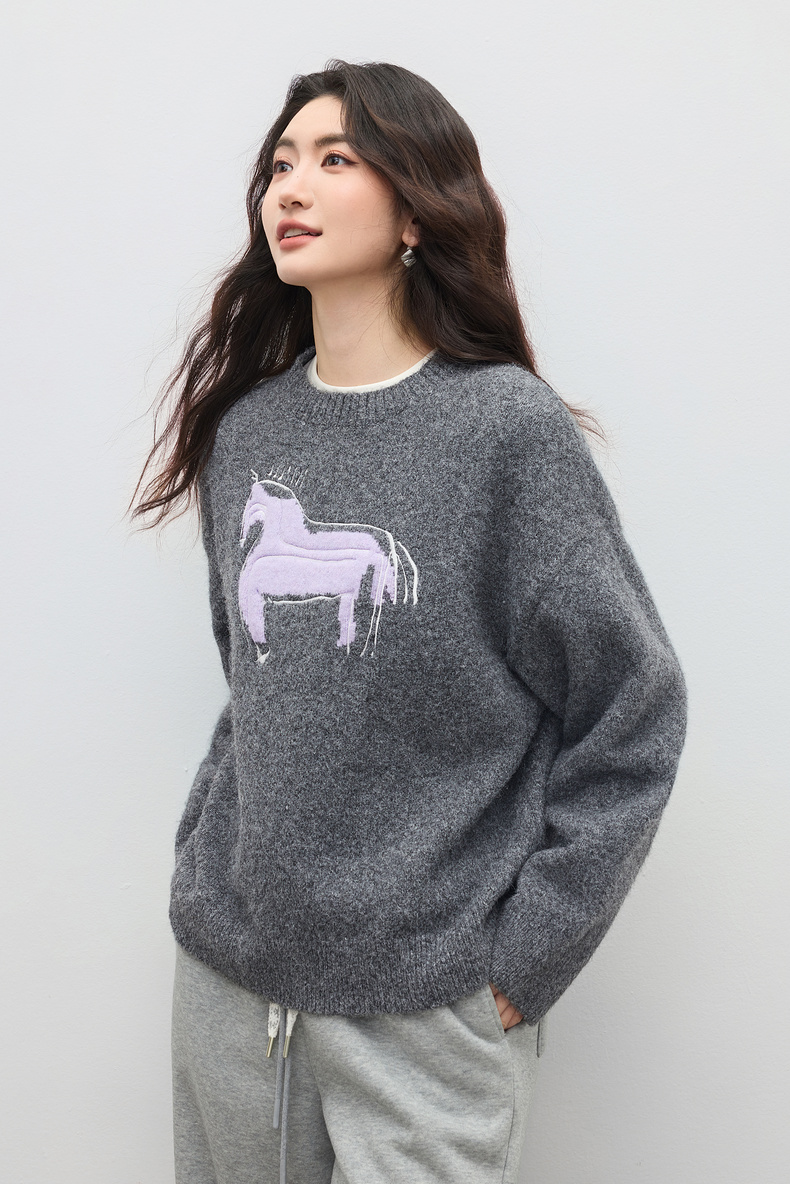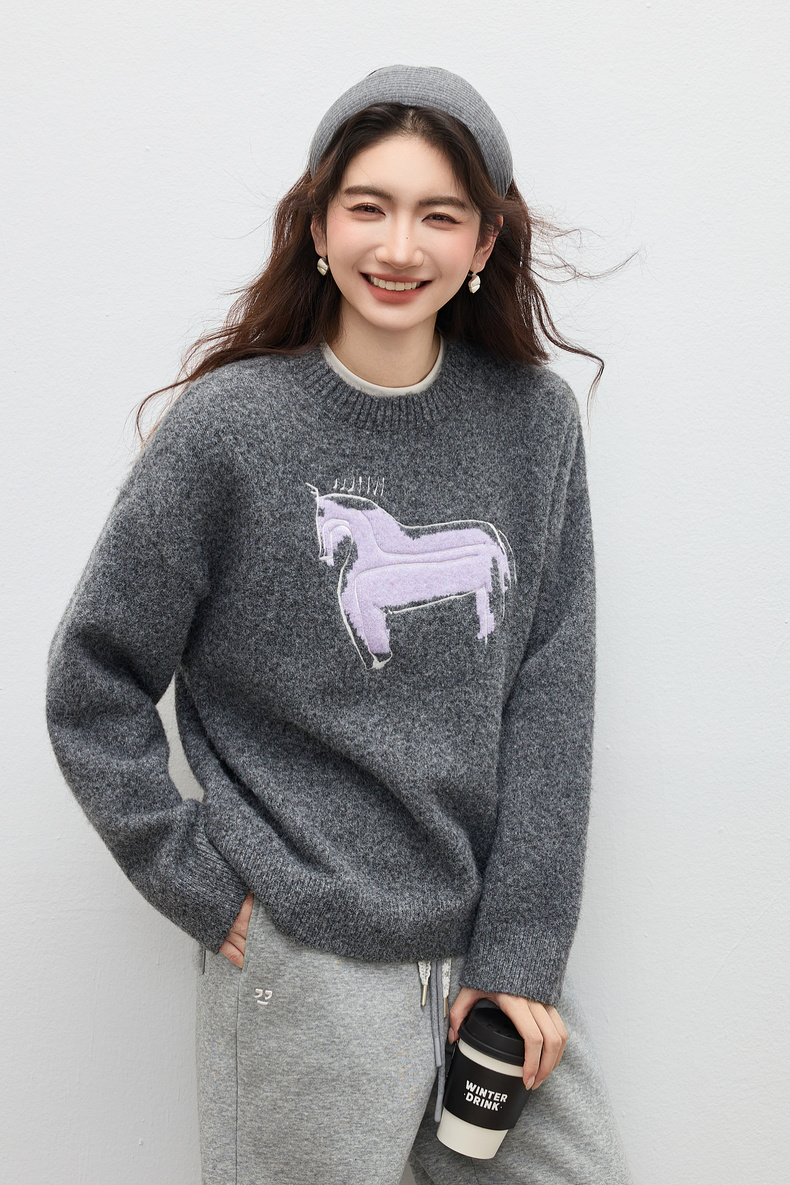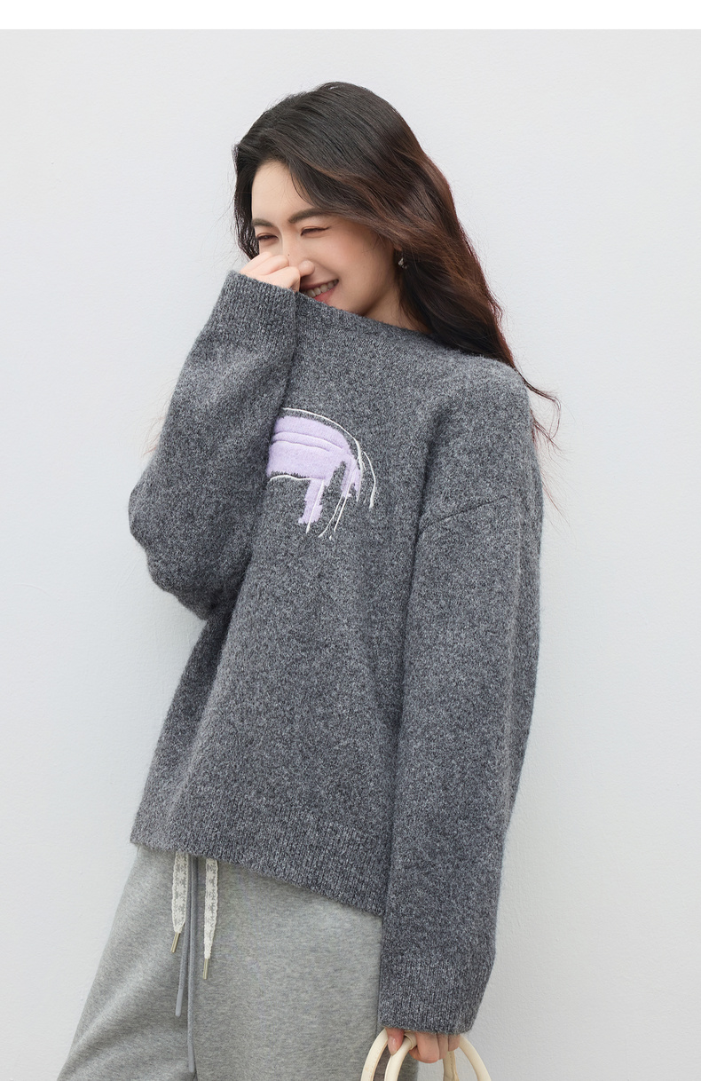 【内购】【福马噗噗】设计感撞色绣花圆领宽松落肩显瘦含绵羊毛弹力毛衣-W54EE4104