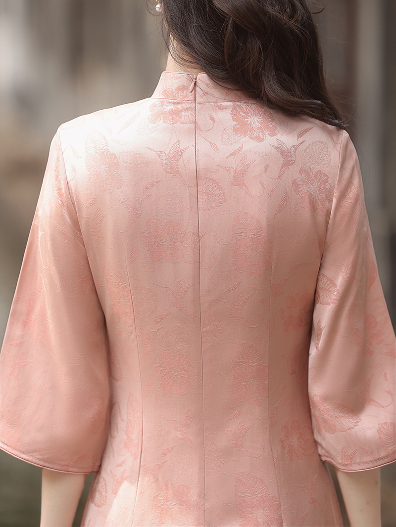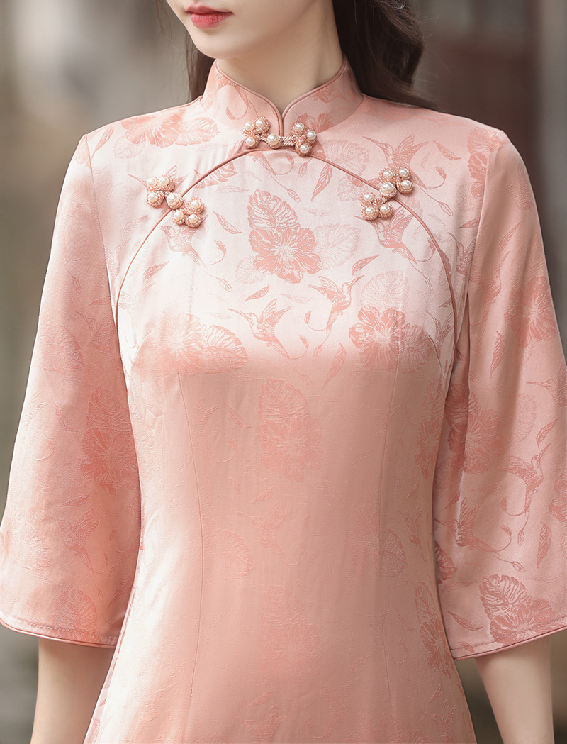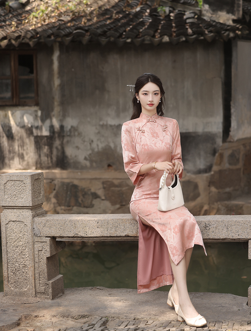 秋冬新款,粉色日常年轻款长款提花淑女订婚服连衣裙旗袍XL-23276