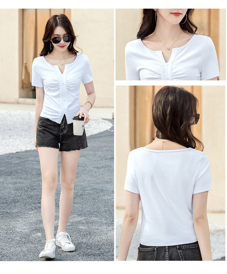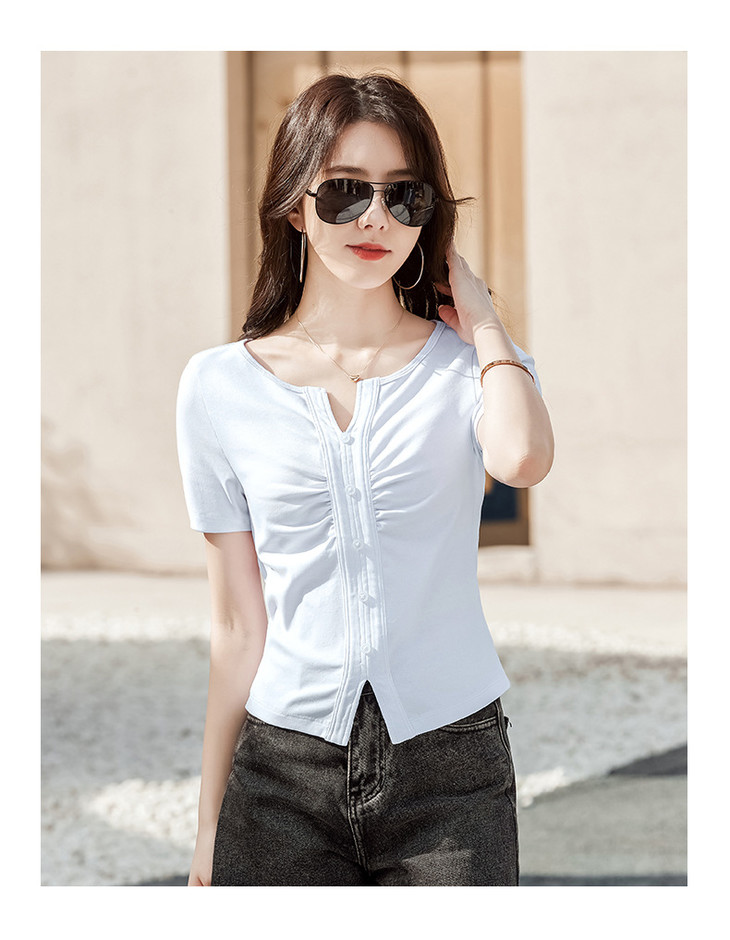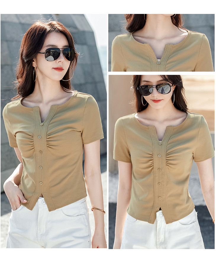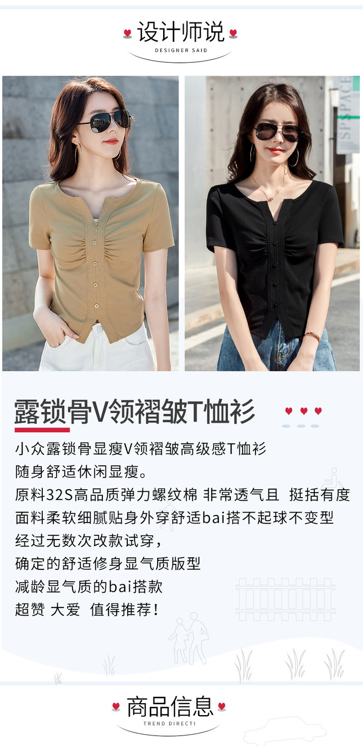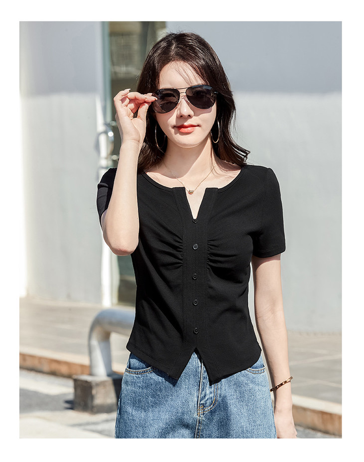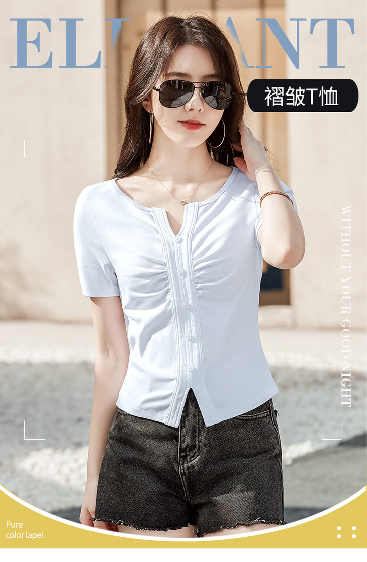 棉质纯欲风V领纽扣高级感褶皱高腰T恤ZS232