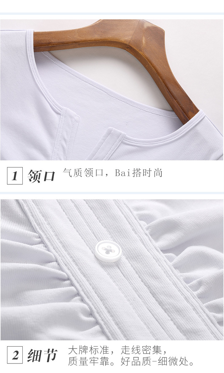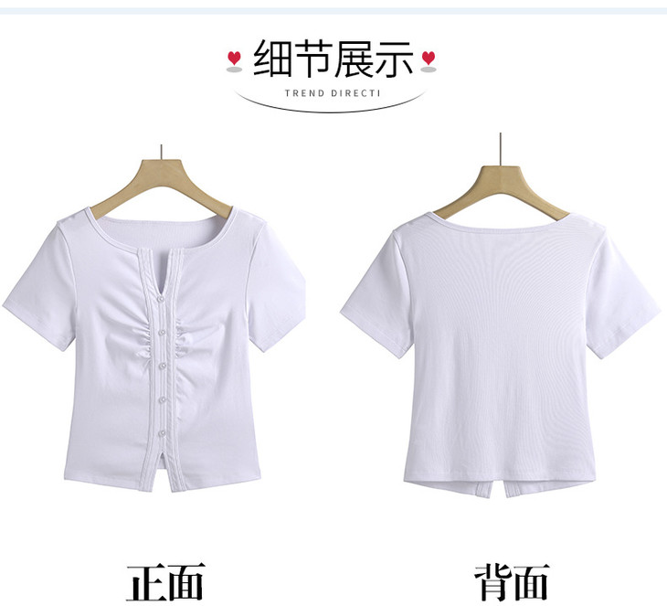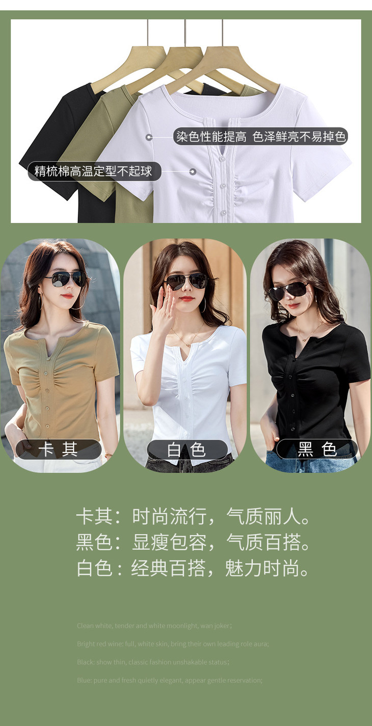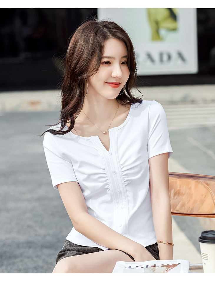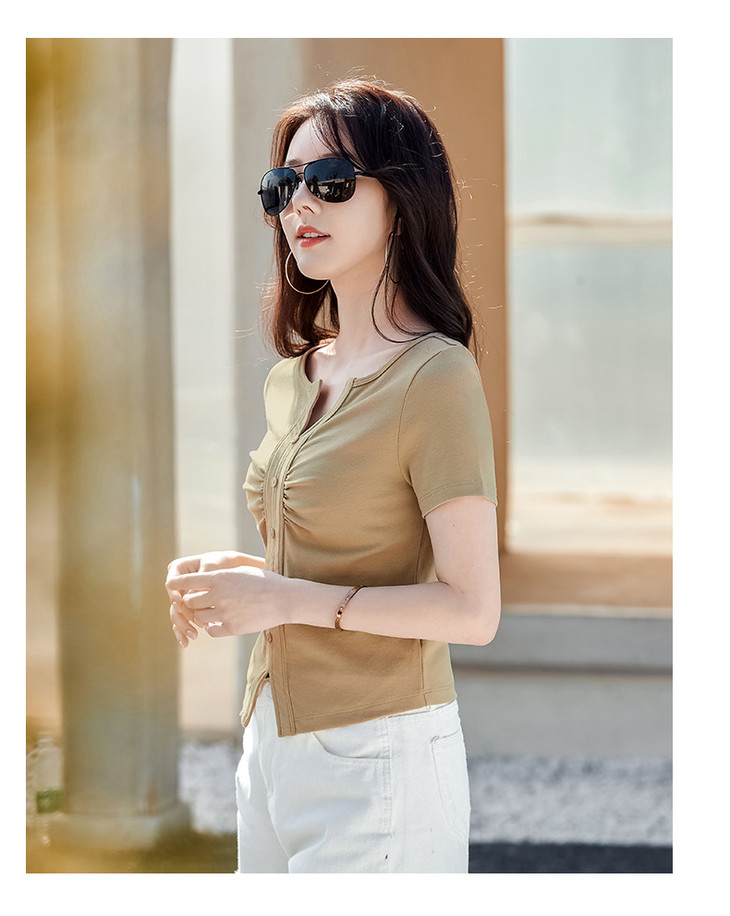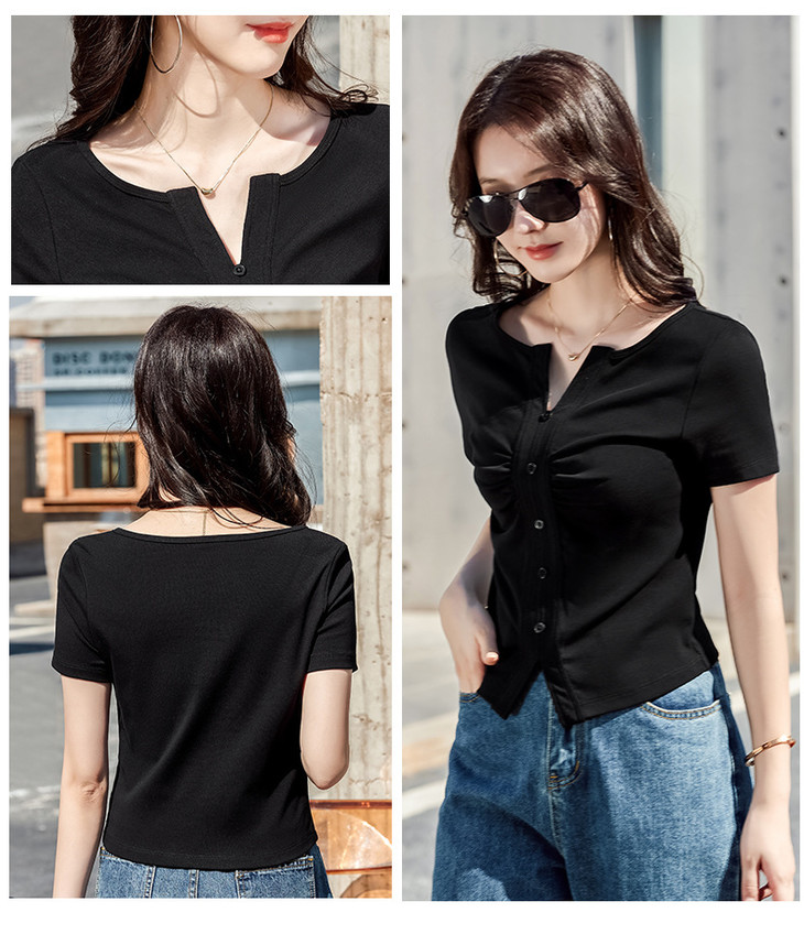 棉质纯欲风V领纽扣高级感褶皱高腰T恤ZS232