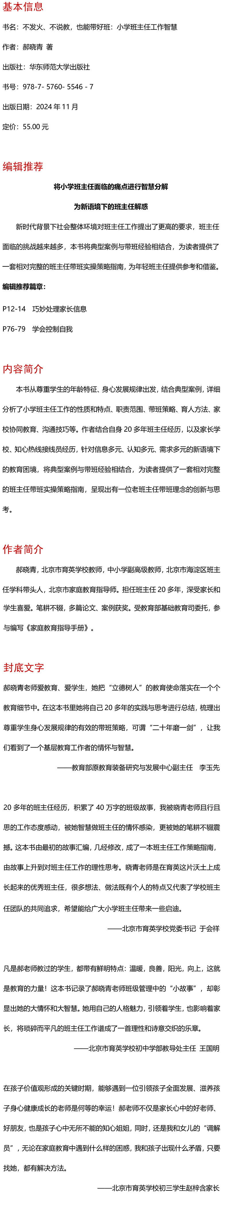 本书从尊重学生的年龄特征、身心发展规律出发,结合典型案例,详细分析了小学班主任工作的性质和特点、职责范围、带班策略、育人方法、家校协同教育、沟通技巧等。作者结合自身20多年班主任经历,以及家长学校、知心热线接线员经历,针对信息多元、认知多元、需求多元的新语境下的教育困境,将典型案例与带班经验相结合,为读者提供了一套相对完整的班主任带班实操策略指南,呈现出有一位老班主任带班理念的创新与思考。