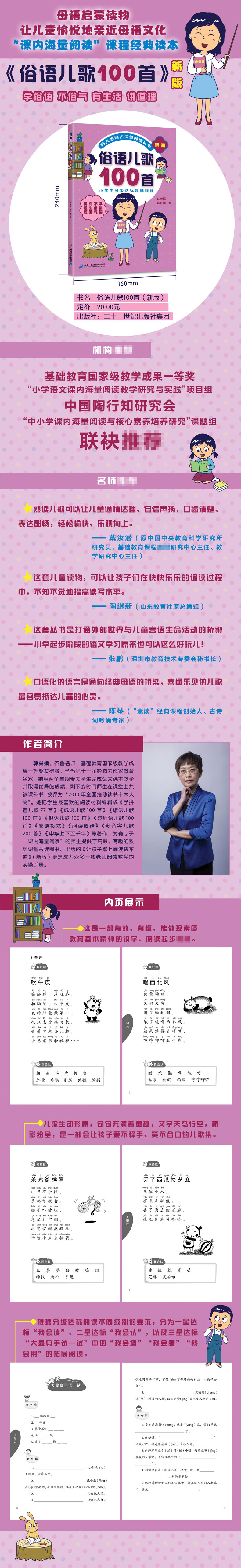 《俗语儿歌100首》是一本针对小学低年级孩子的母语启蒙的起步读物。中华民族俗语源远流长,内容丰富多彩、包罗万象,是广大人民群众的智慧之花,能给我们许多有益的启示;而儿歌是外部世界与儿童语言生命活动连接起来的桥梁,活泼、有趣,能给孩子带来无穷的乐趣。作者将二者完美的结合,100首儿歌,生动形象地诠释了孩子日常生活、习文写作中常用的俗语,让他们知晓俗语的意思和用法。口语化的语言是通向经典母语的桥梁,喜闻乐见的儿歌最容易抵达儿童的心灵,用儿歌诠释俗语,给孩子接地气的精神启蒙,亲近母语文化,不仅可以使孩子们增强口语表达和书面写作的生动性,还具有很强的启迪性,从而懂得许多生活的道理。“海量阅读课程”创始人韩兴娥老师十几年“课内海量阅读课程”的教学经验应用于书中,紧贴小学语文识字内容,为学生设计了不同的分级达标标准:熟读儿歌为一星目标,读准“我会认”中的生字、生词为二星目标,能口述“大显身手试一试”中......