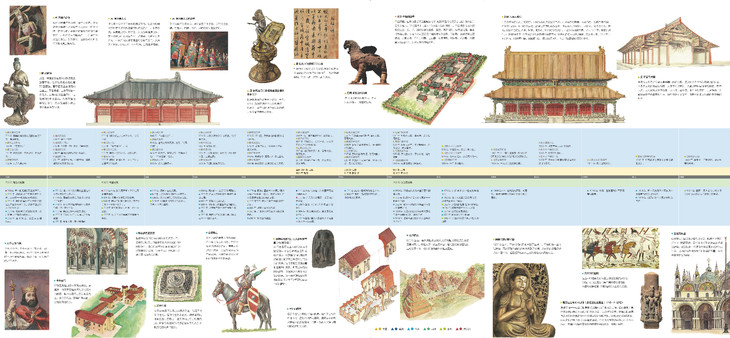 这本书使用“墙书”的形式,也就是一个长卷,可以在一个教室的墙面上展开陈列。当然,为了携带和保存方便,我们做成了可以折叠的书,并且单面印刷,以保留墙书的特点。用文字阐述历史当然可以在条理上描述清晰,但是在具体形象上却难以让人产生印象。以图像解释历史,可以事半功倍,让读者用较少的时间,掌握更多的历史信息。