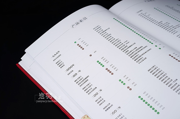 我们按照年份排序;同一年份分为生茶、熟茶、定制茶、红茶;每款产品提供正反面茶品照、产品说明、外包装棉纸照(或外盒照);每款产品的规格、年份、生产日期。
