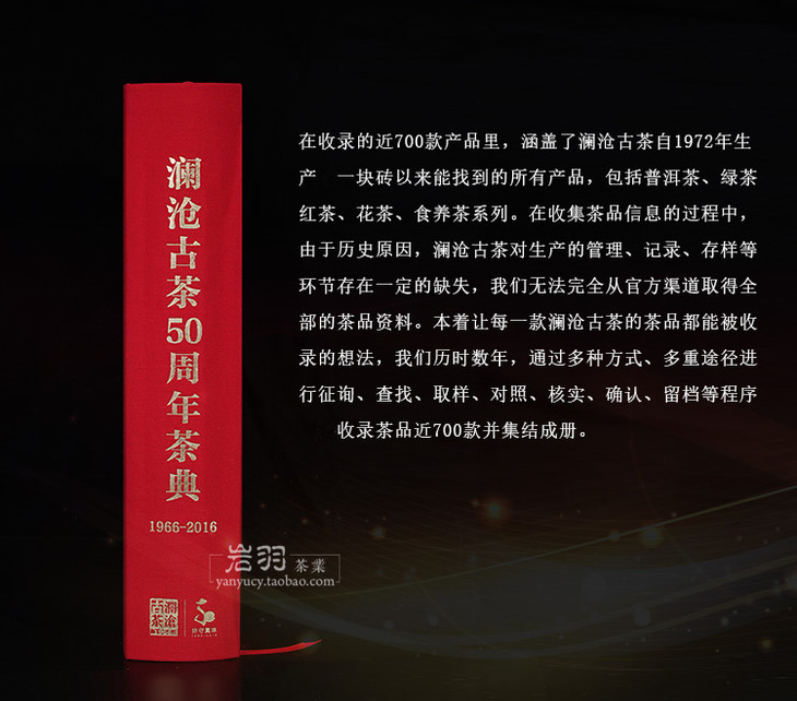 《澜沧古茶50周年茶典》是澜沧古茶有限公司继《香飘45年》后第二本茶品大全集册,为公司茶品品鉴、收藏提供指导和说明,是广大澜沧古茶茶友查询、了解古茶茶品的一本工具书。