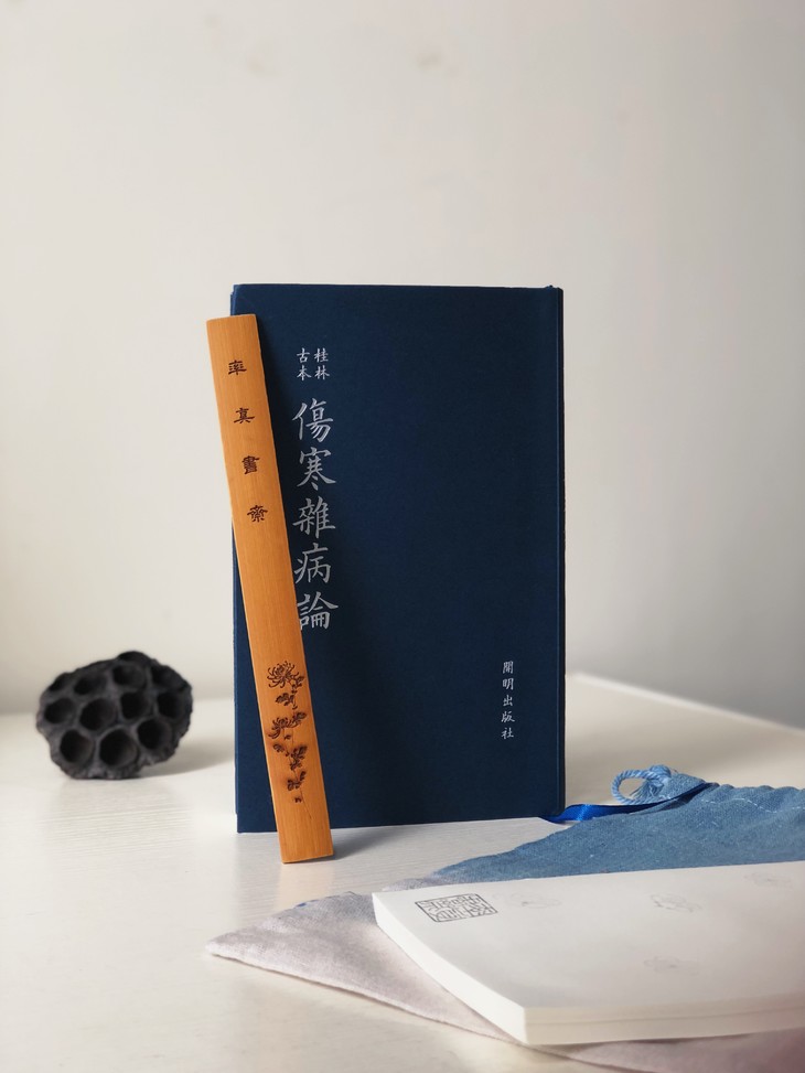 书籍配送:板蓝根手工染麻布书袋一个、平日学习用便签纸一本、伤寒论书一本。