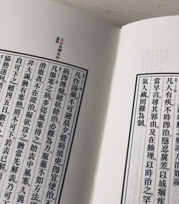 2、排版特色。依循古制。正体竖排。疏朗干净。天头针对条文内容,用红色字体注有版本差异眉批。以起辅助读者阅读之作用。蓝色封面设计,整部书彰显儒雅内敛之气质。