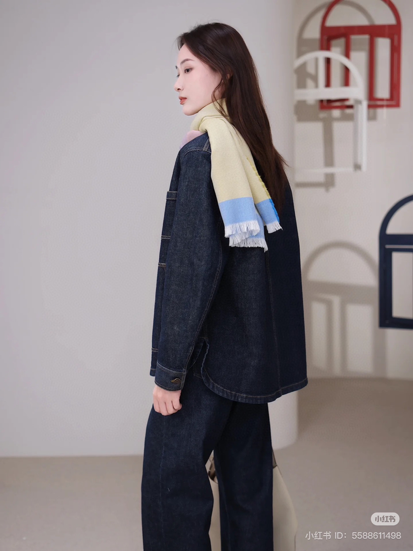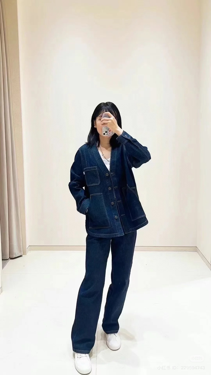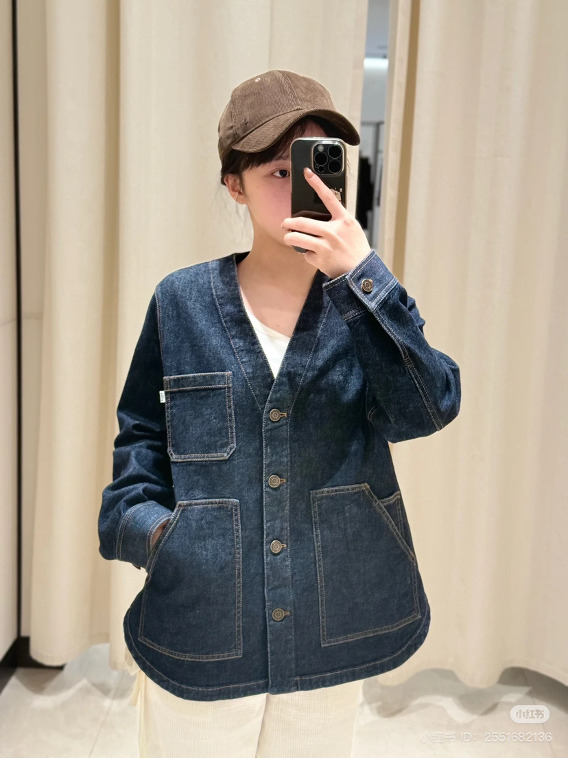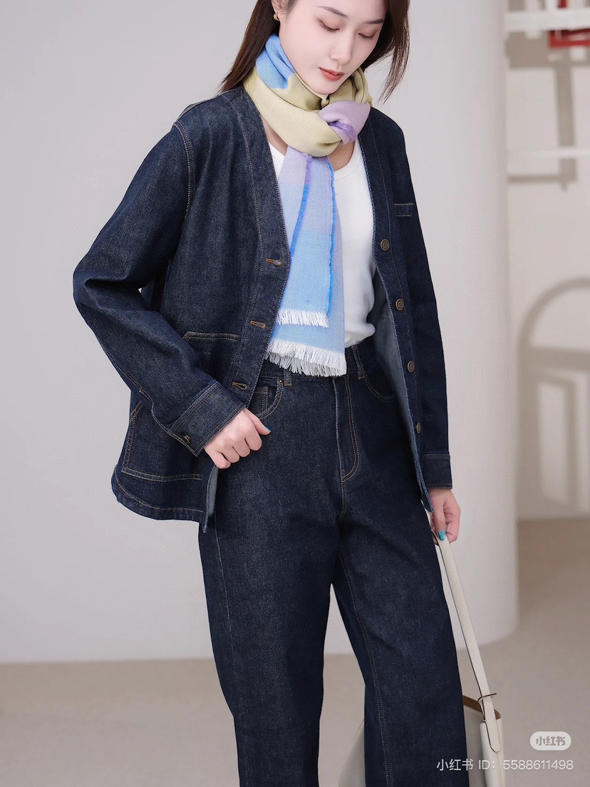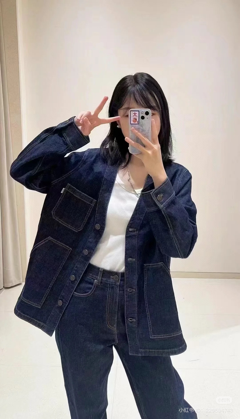 姑娘们,你们现在进柜,店员一定一定是给你主推这套。看着平平无奇,上身就很神器,风很大的无领牛仔外套,偏一点点中式风,25新款版型和口袋都做了改良,恰到好处的宽松,而且插口袋更加方便