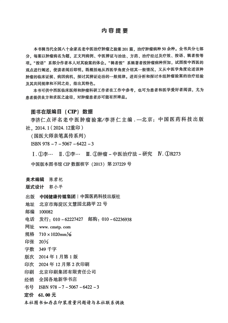 书名:李济仁点评名老中医肿瘤验案(国医大师亲笔真传系列)