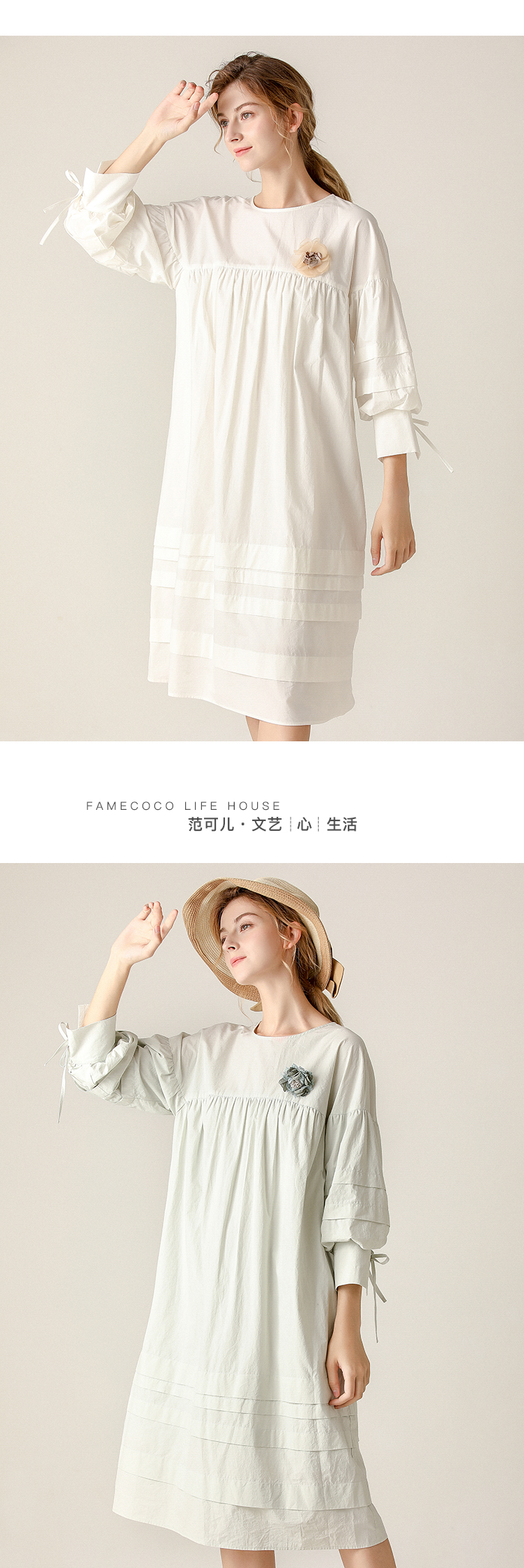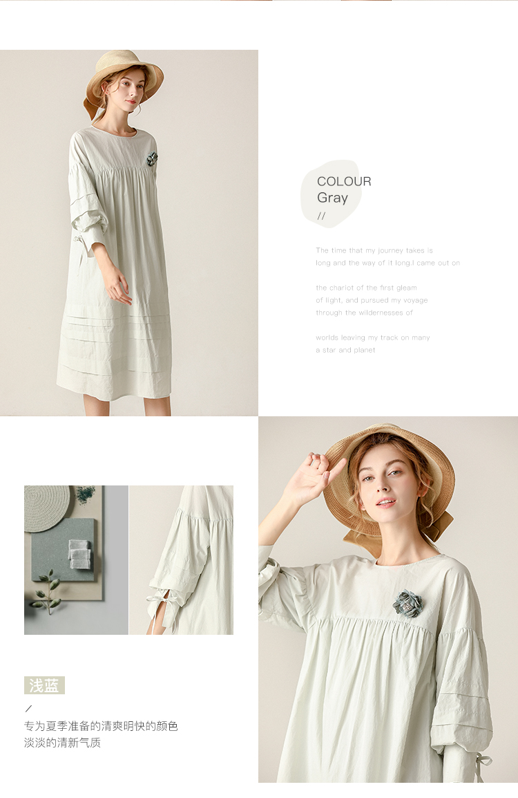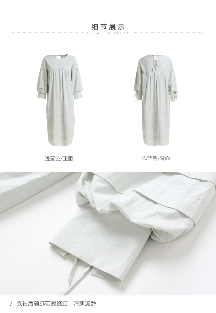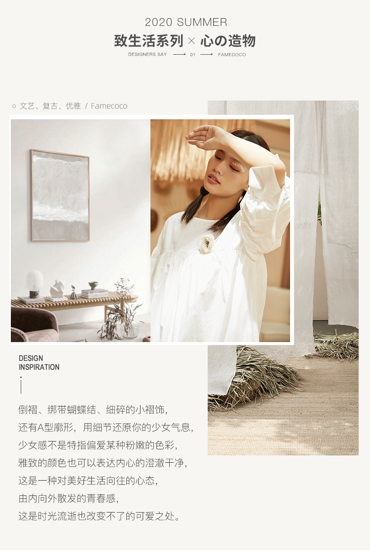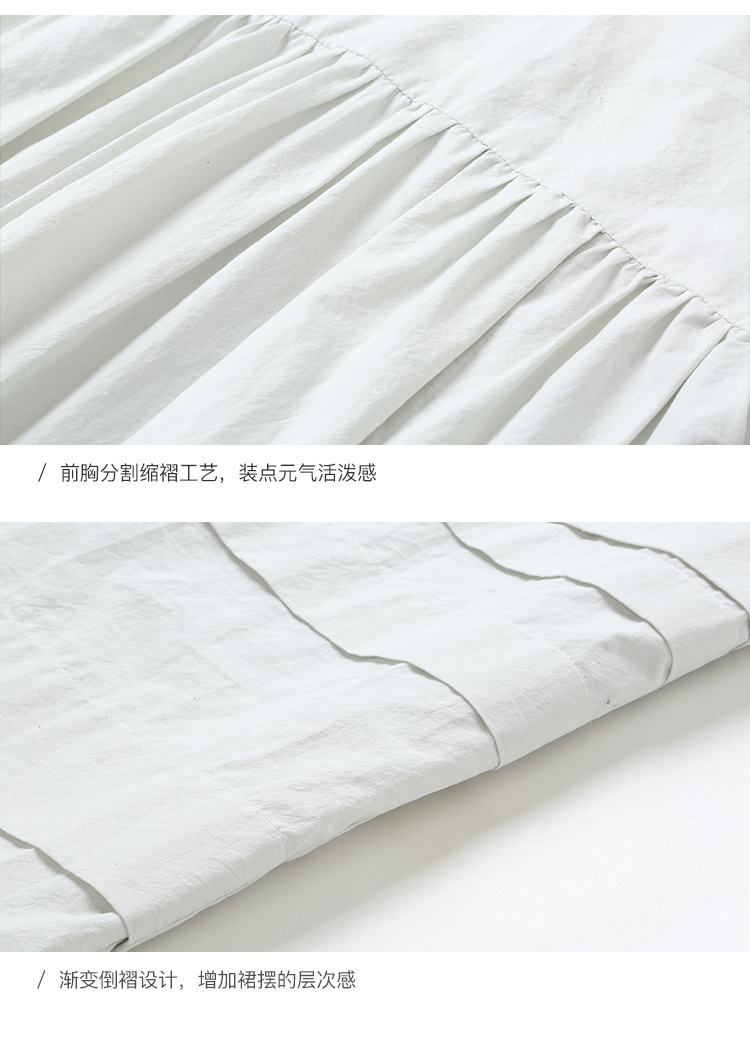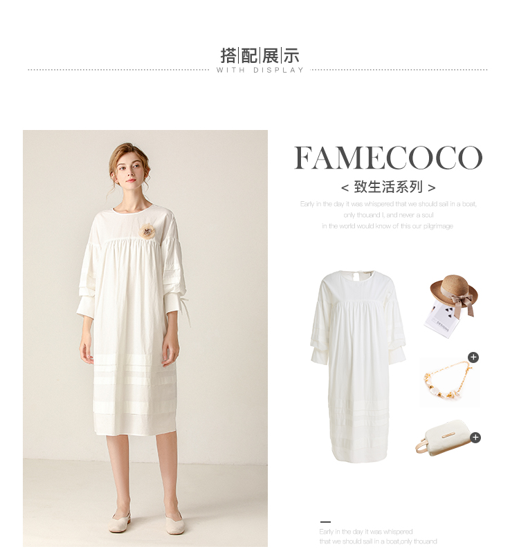 famecoco范可儿直筒娃娃裙新款气质七分袖褶皱纯棉连衣裙F203FA053