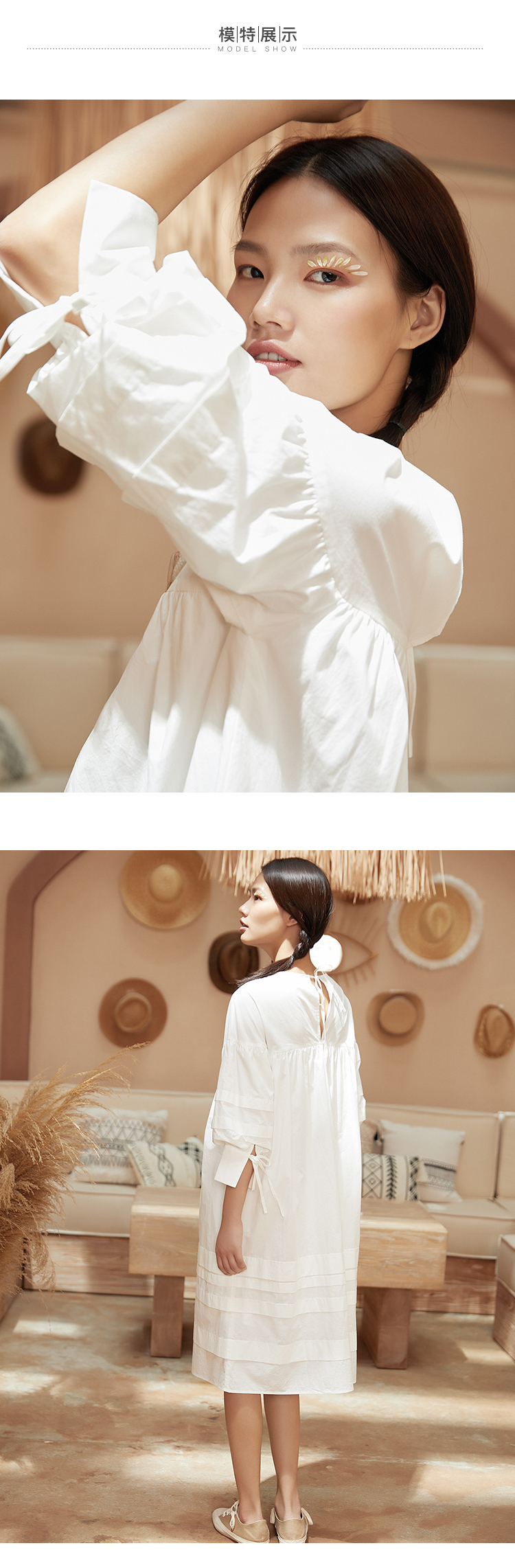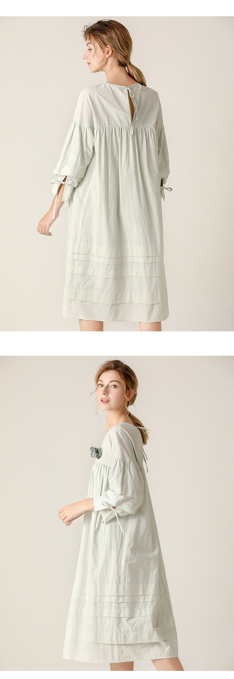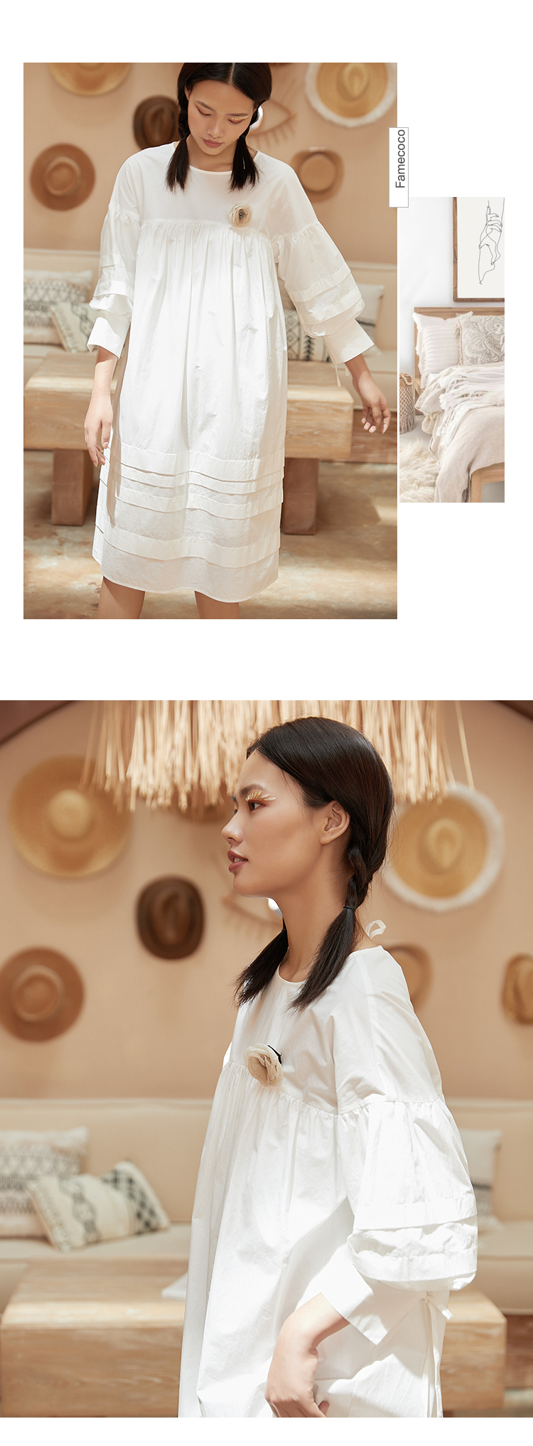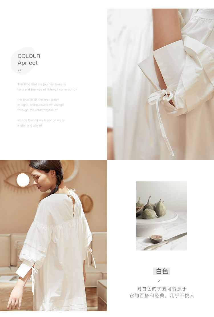 famecoco范可儿直筒娃娃裙新款气质七分袖褶皱纯棉连衣裙F203FA053