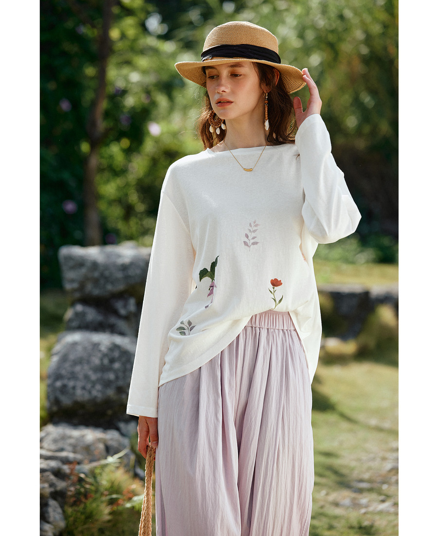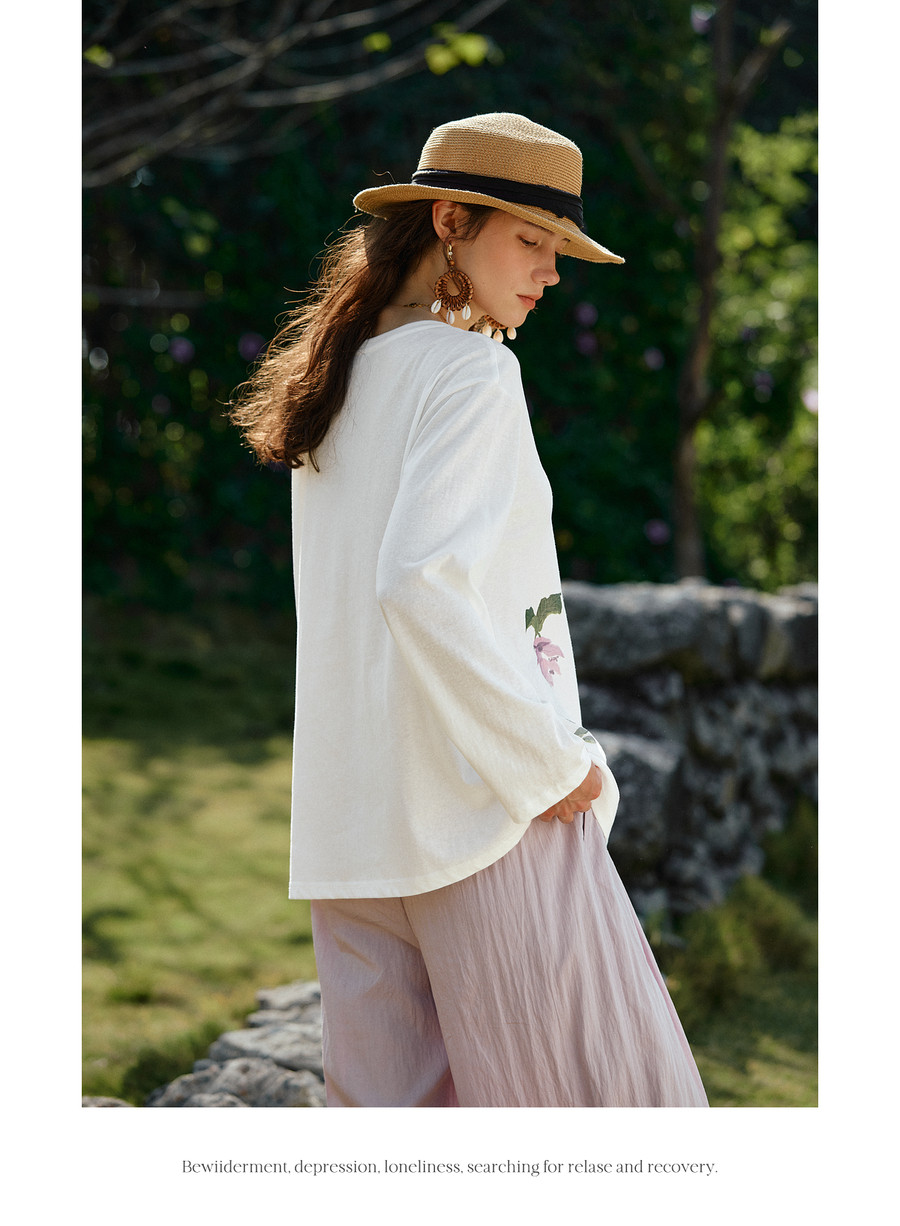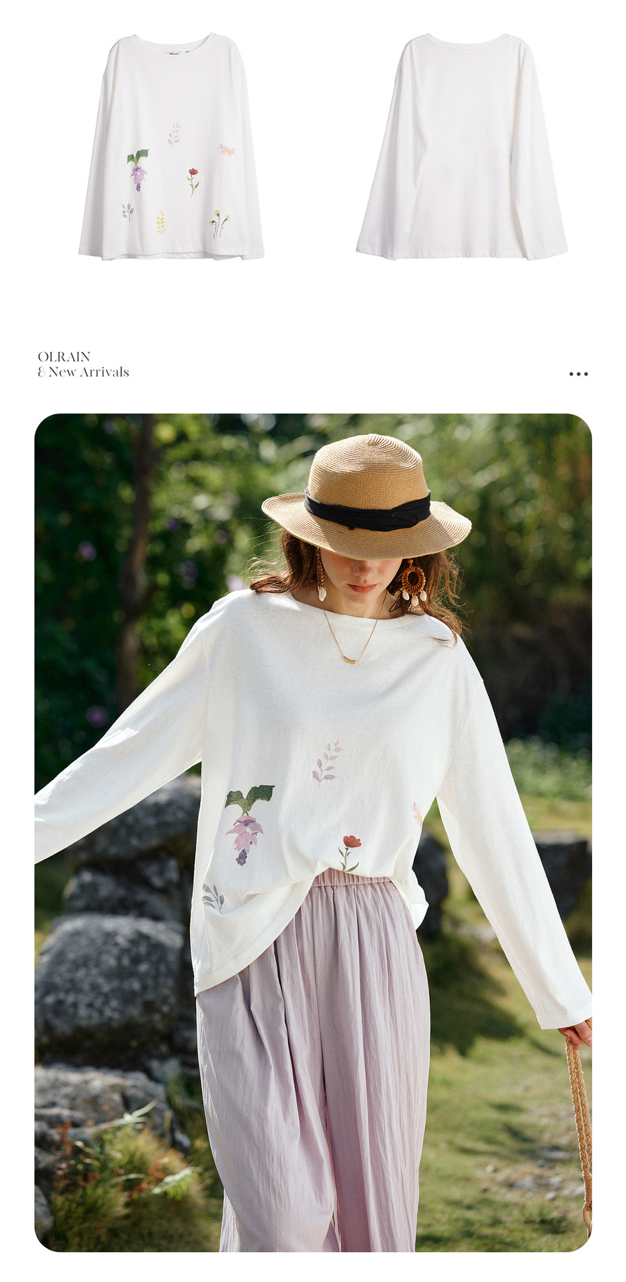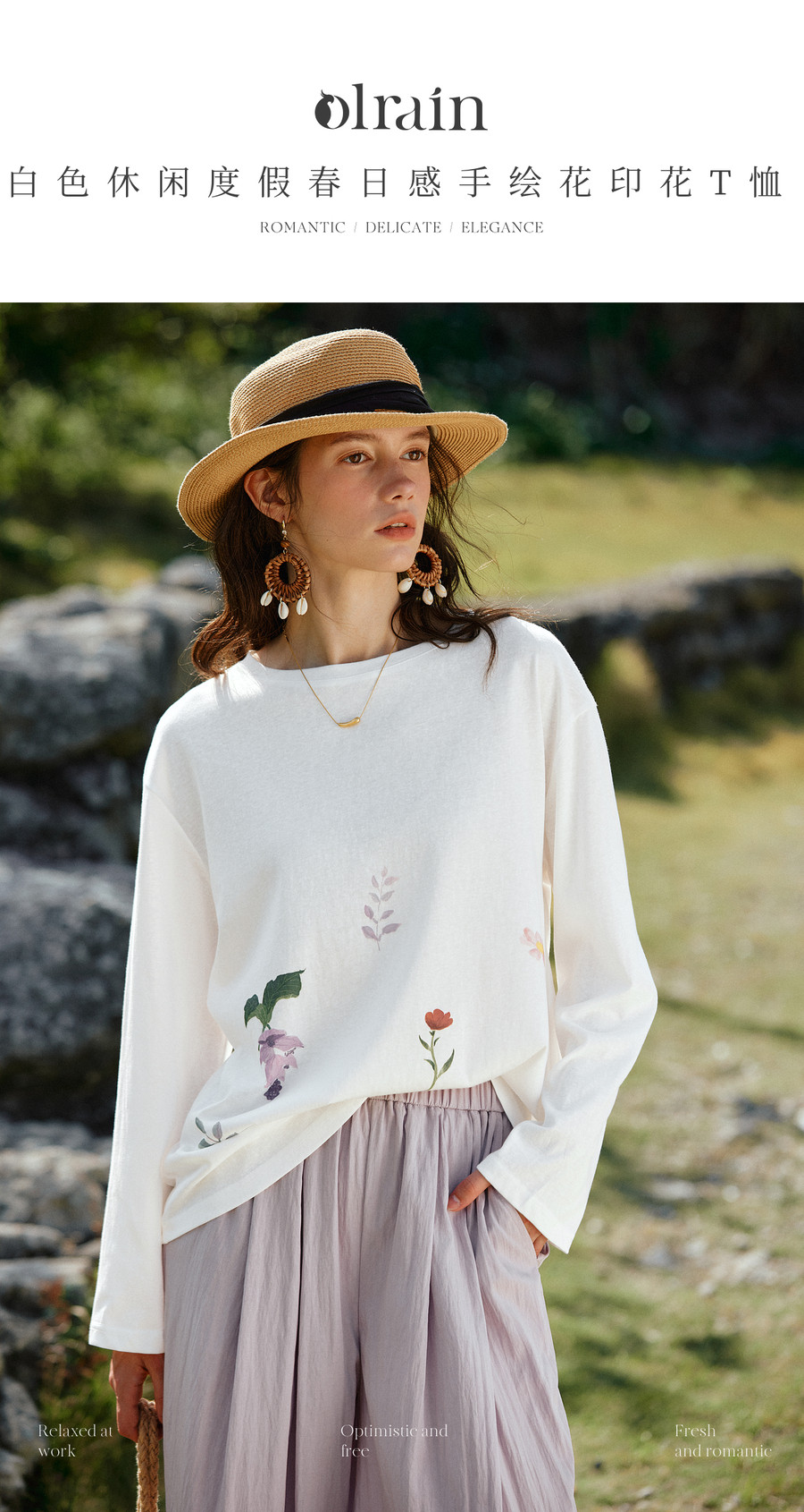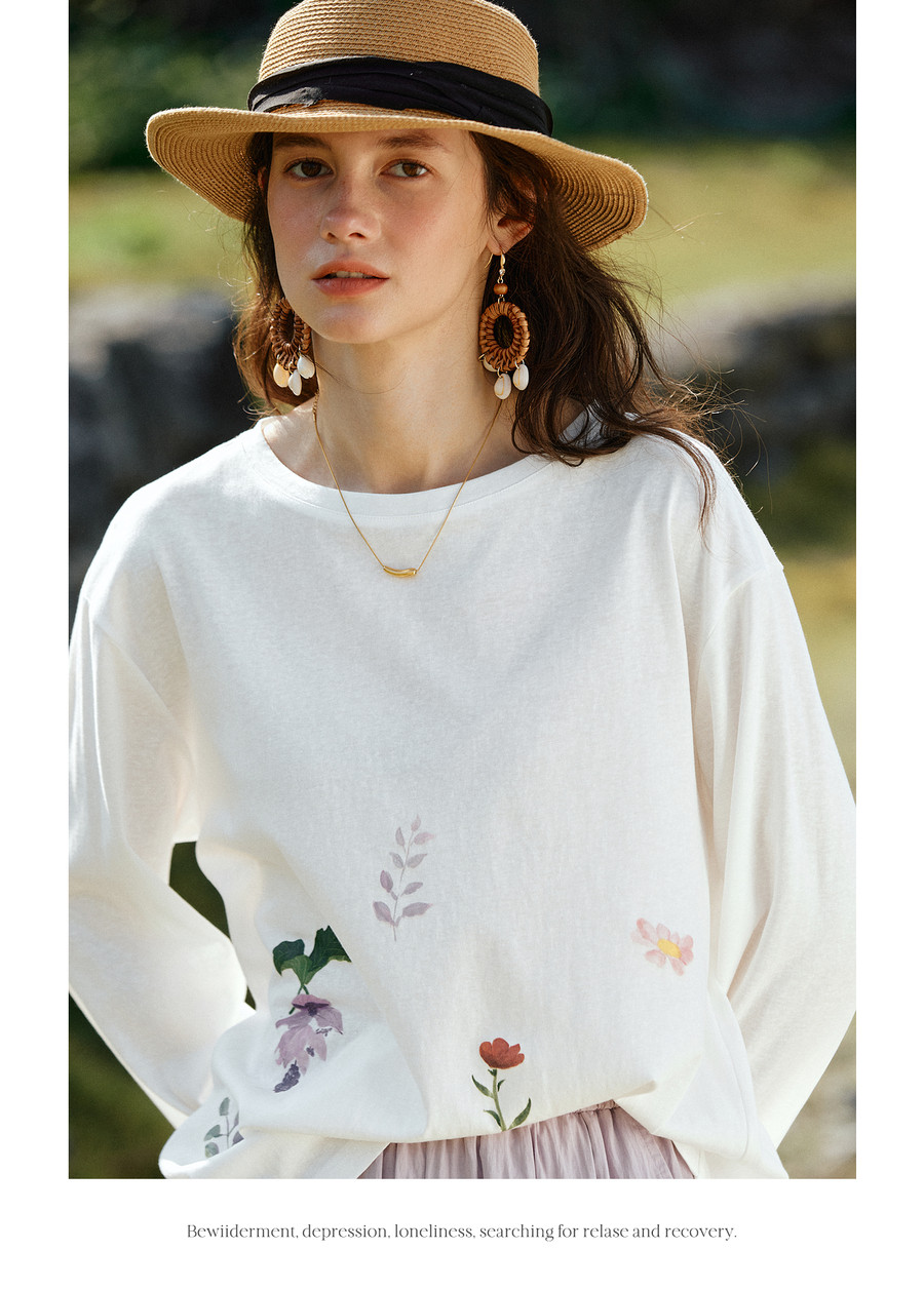OLrain欧芮儿2026新款春白色休闲度假春日感手绘花印花长袖T恤女