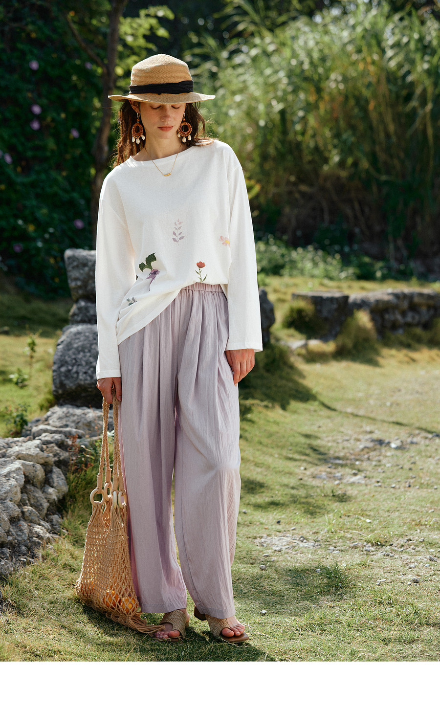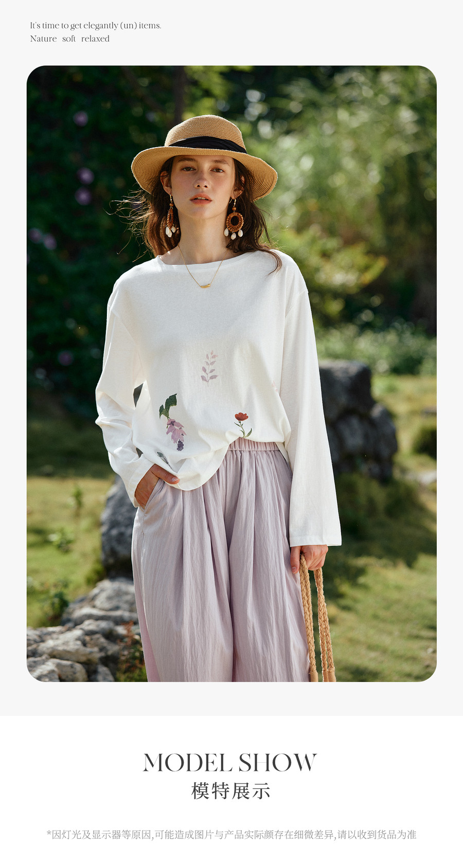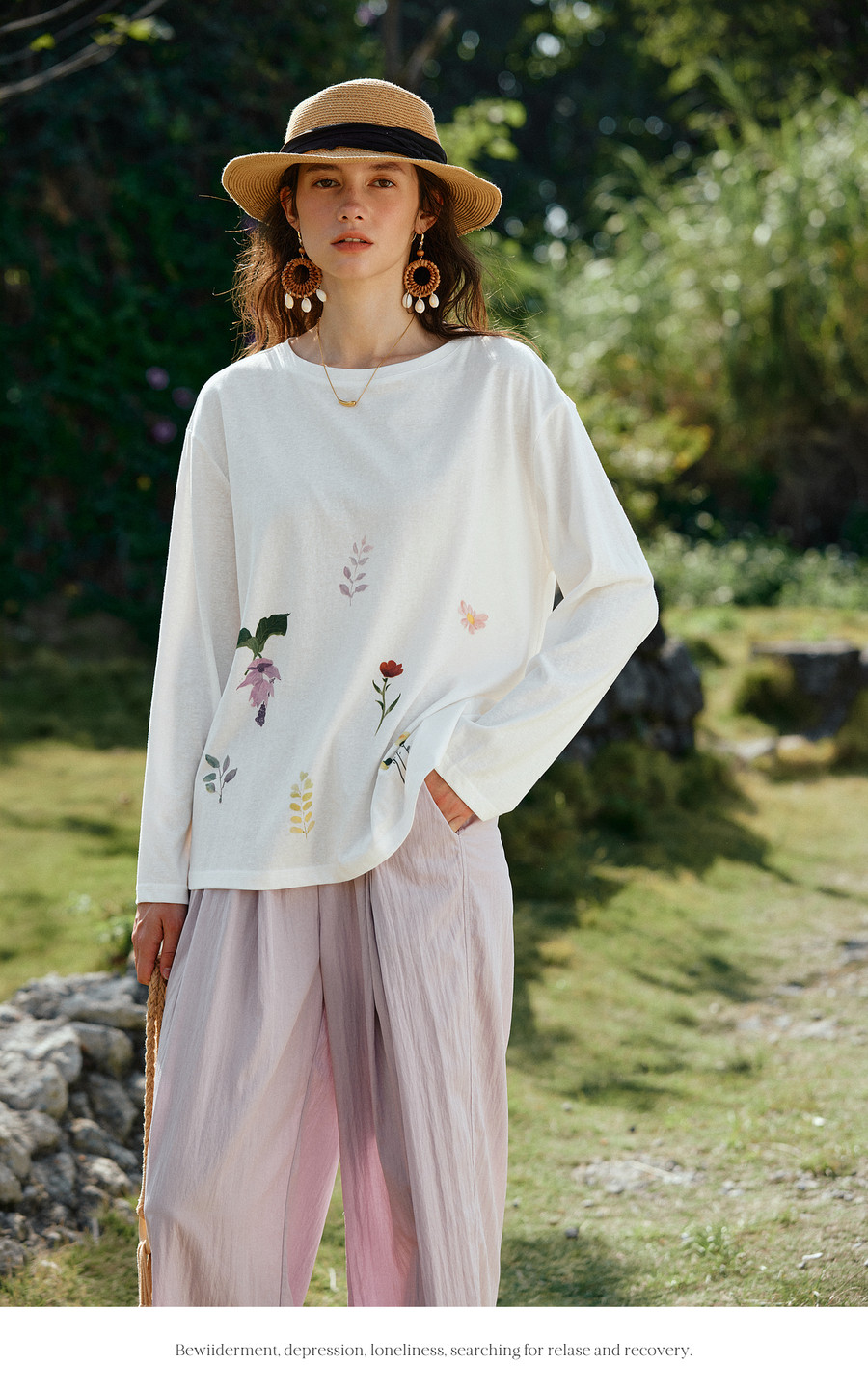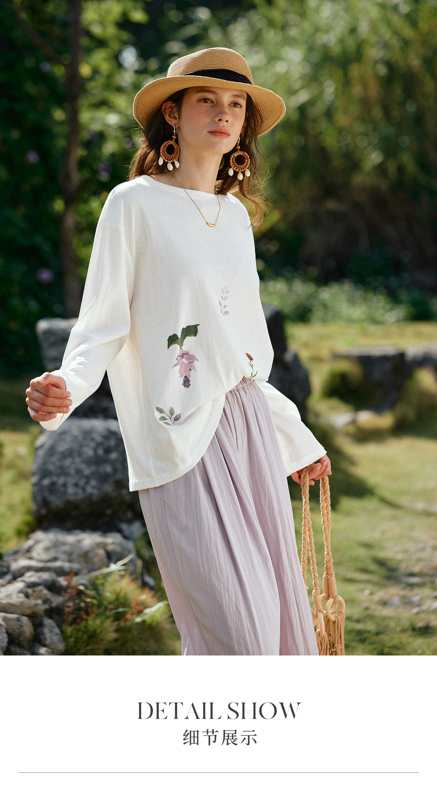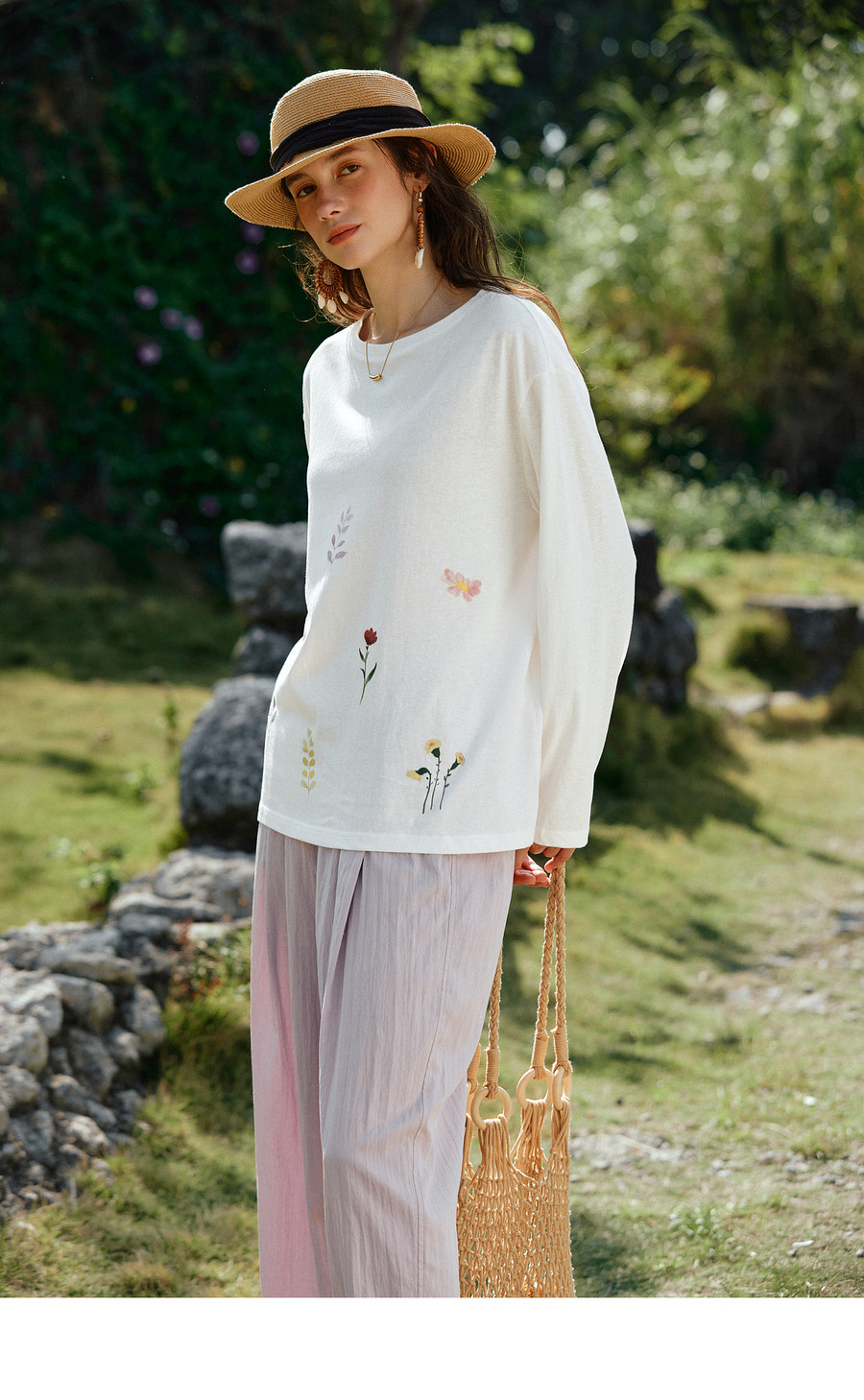 OLrain欧芮儿2026新款春白色休闲度假春日感手绘花印花长袖T恤女
