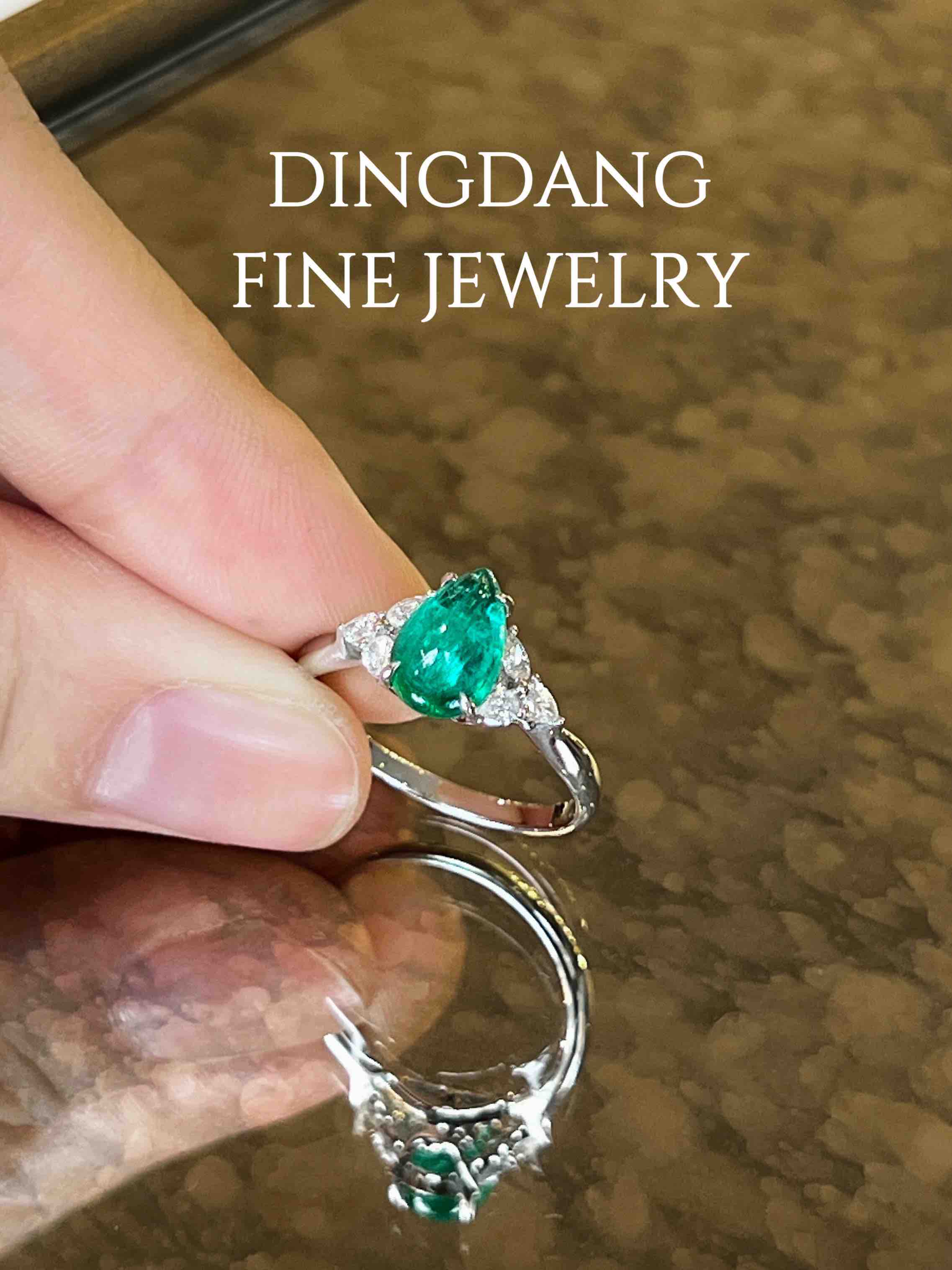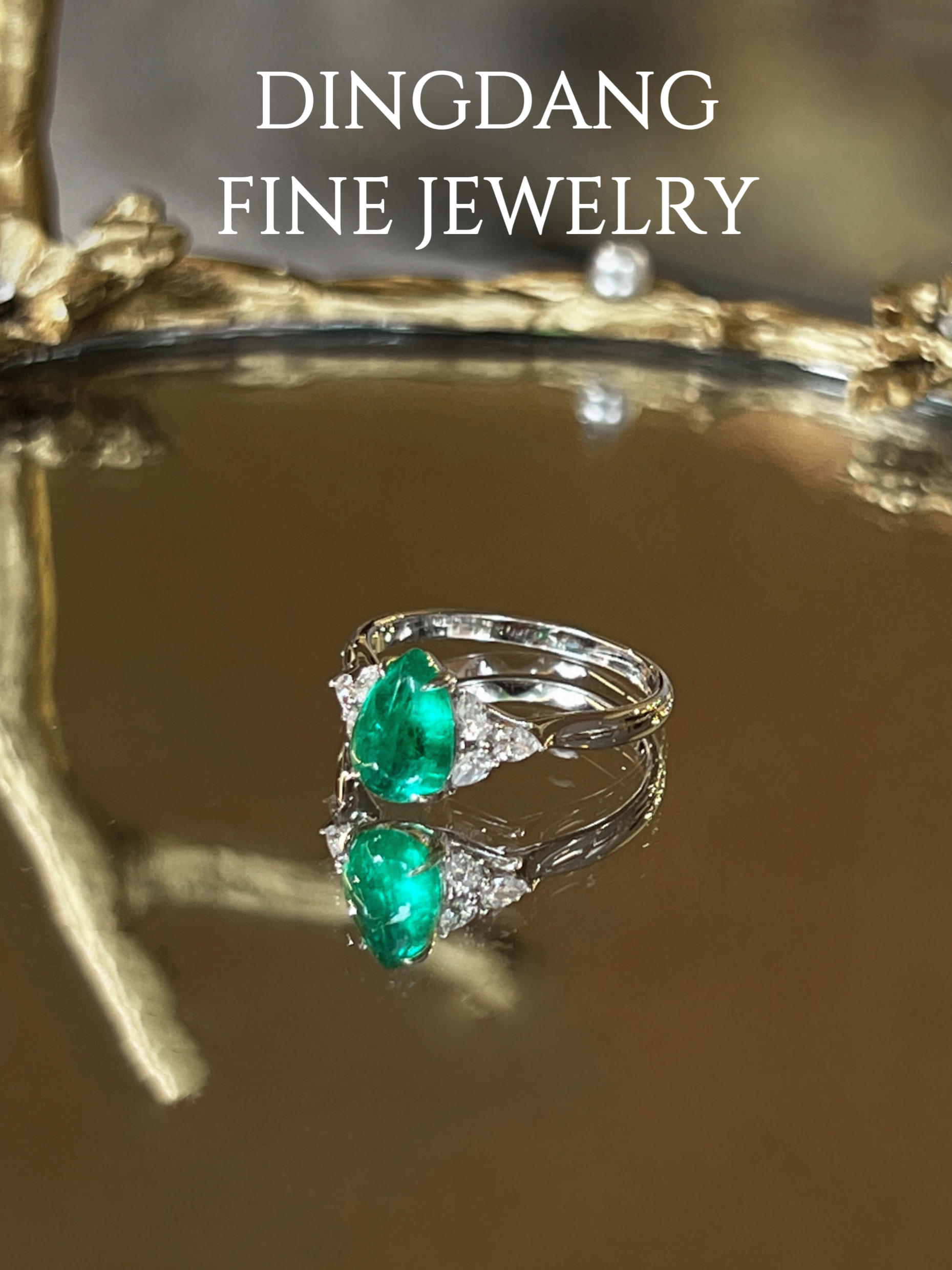 戒指主石为1.76ct 哥伦比亚木佐祖母绿,颜色浓郁,微油,水滴形切割大方镶嵌,周围以个性人设计,特别凸显宝石的镶嵌,华丽却不落俗套,既柔美又充满力量感