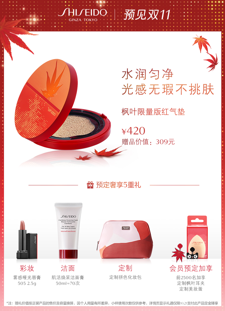 【双11抢先加购】资生堂随肌应变限量版枫叶智能气垫粉底液 遮瑕JPY带授权招加盟代理