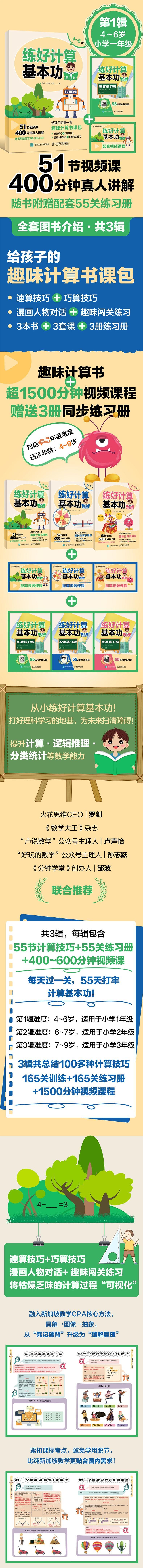 计算是一项基本的数学能力,是学习数学和其他学科的重要基础。但是很多孩子存在计算功底比较薄弱、数感欠缺、算法和算理不明、轻视口算和估算、计算速度慢、粗心大意等问题。本套书共总结了100多种计算技巧,分为两大类型:一类是速算技巧,以趣味性的对话形式讲解运算思维,再以图解形式演算过程,总结出各种实用的方法模型,方便孩子学习和记忆;另一类是巧算技巧,分步讲解不同算式的处理方式,让孩子建立数感,学会如何将复杂的计算简单化,帮助孩子提高计算速度,提升计算准确率。本套书共3辑,每辑均包含55节内容(3辑共165节)。每节都配有不同类型的趣味闯关练习,帮助孩子有针对性地强化巩固学习效果。本书为第1辑,适合4~6岁的孩子使用,能够帮助孩子认识100以内数字的加减法,掌握凑十法、破十法、平十法、分五法、加减抵消法等多种运算技巧,帮孩子将所学知识融会贯通,更好地激发孩子学习数学的兴趣!同时本书还配有同步练习册(......
