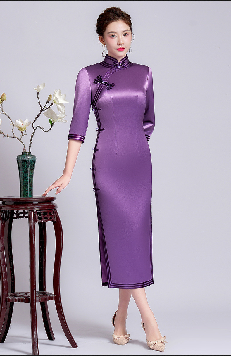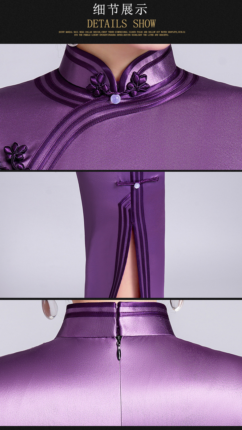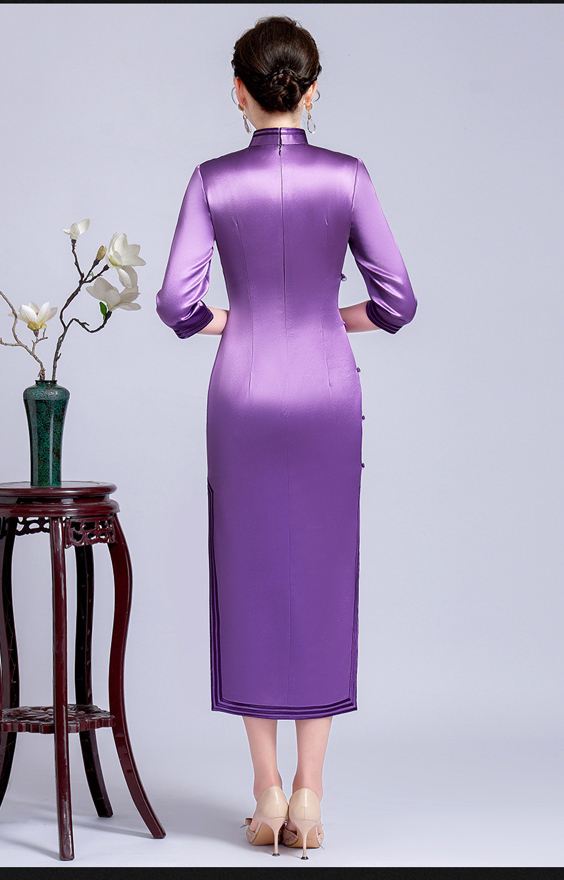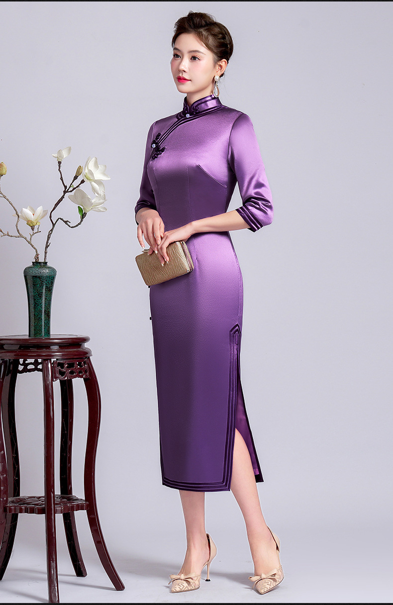 【丹凤朝阳】紫色斜开叉长款年轻款演出旗袍YD90