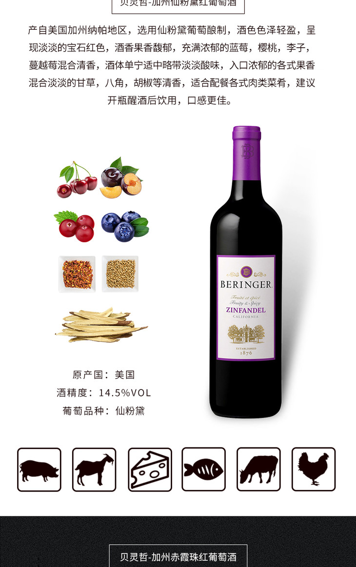【积分兑换专用】美国原瓶进口 贝灵哲红仙芬黛 Beringer Red Zinfandel 750ml