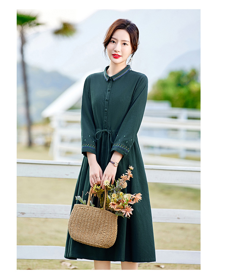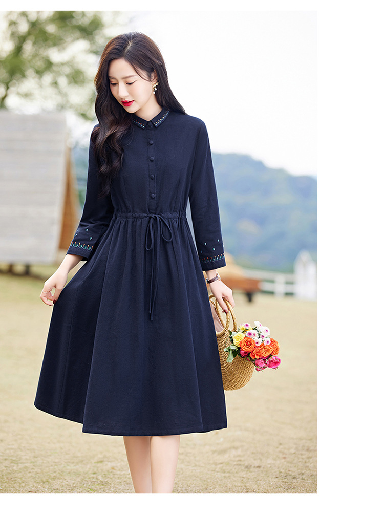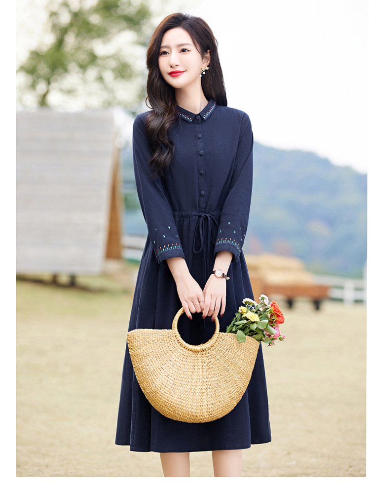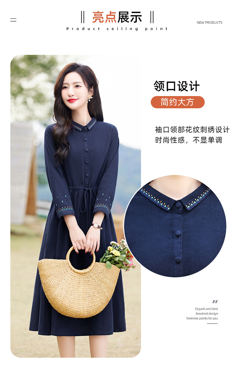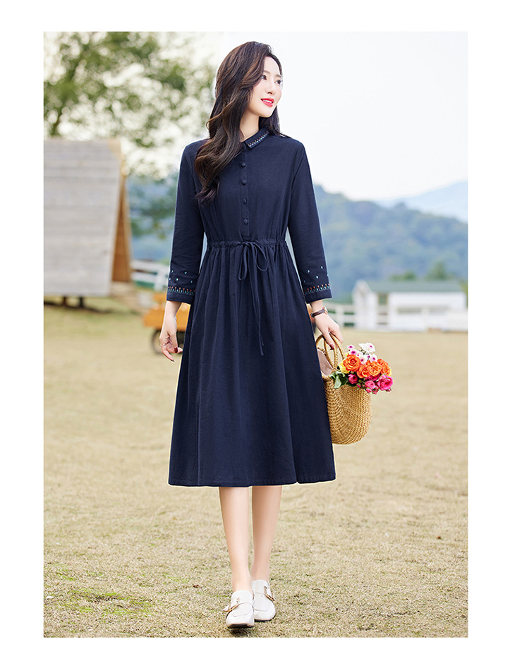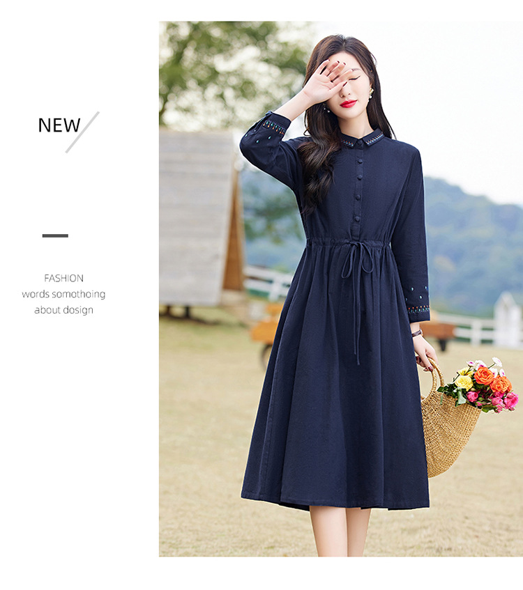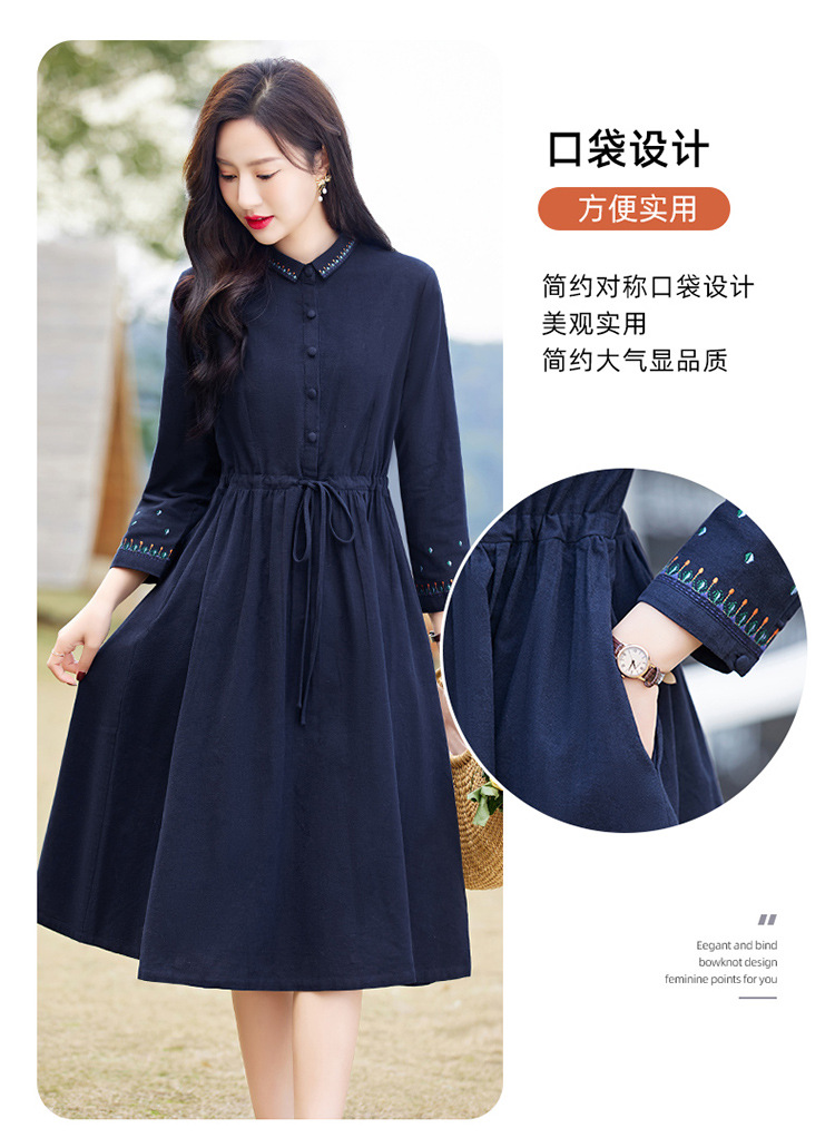 时尚简约休闲气质小翻领棉麻文艺刺绣长袖连衣裙HR-WN22169