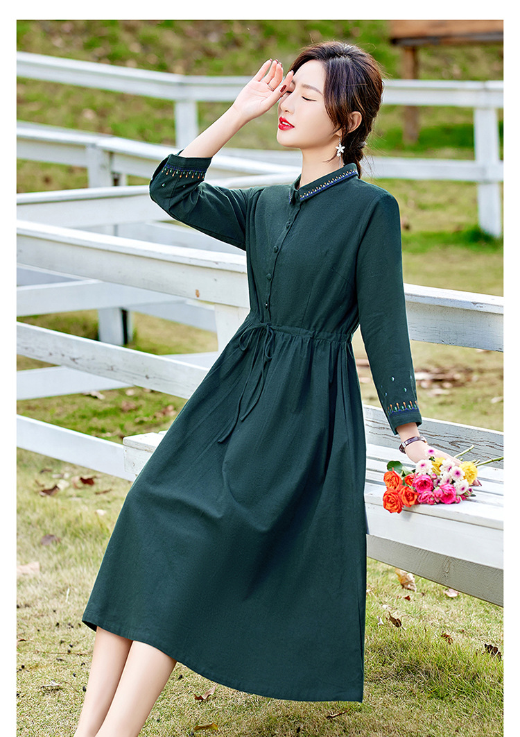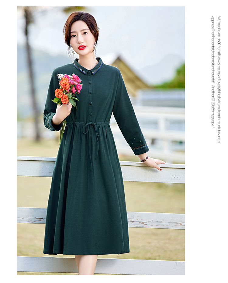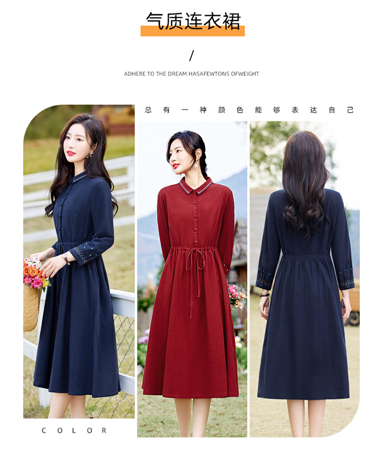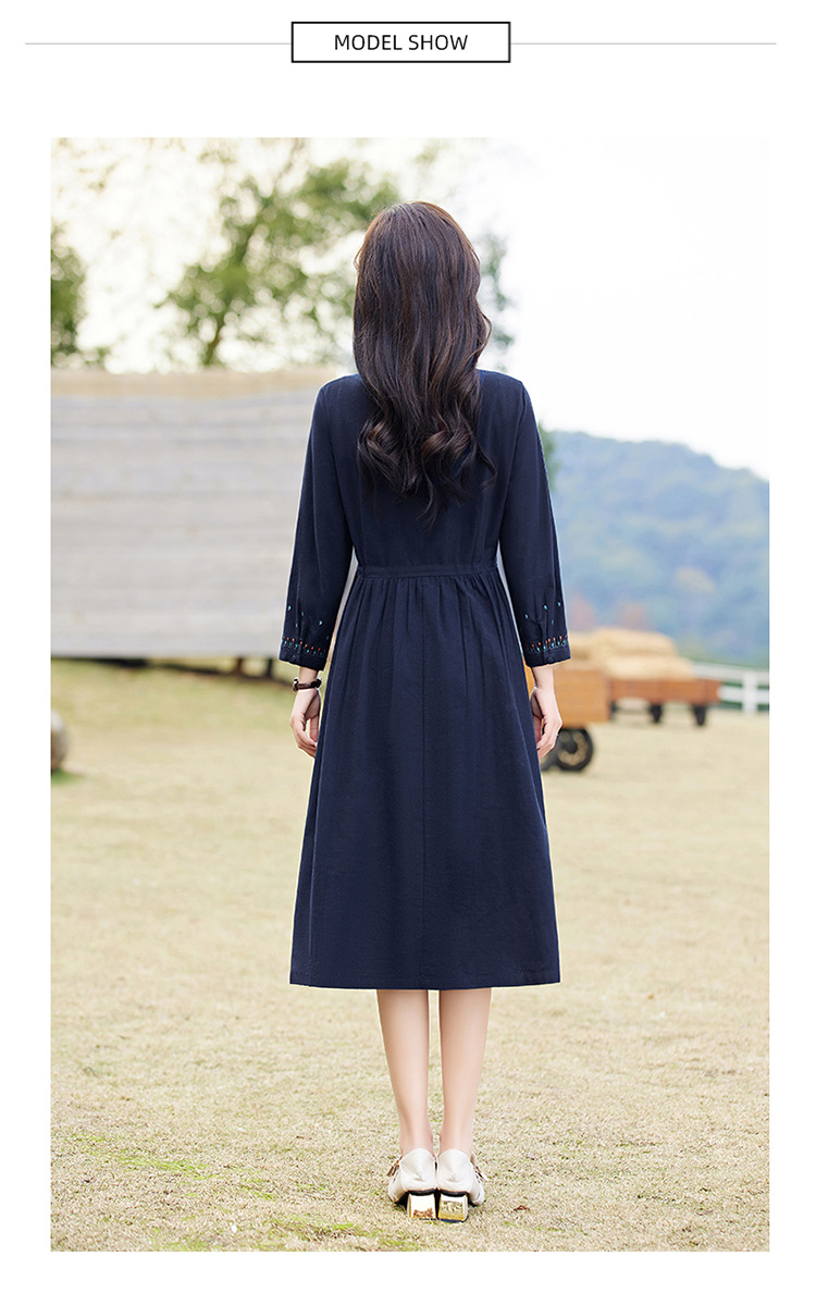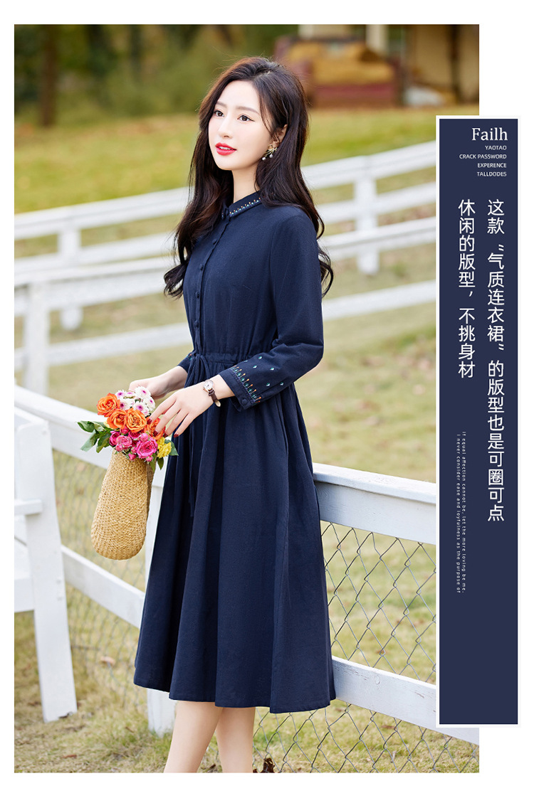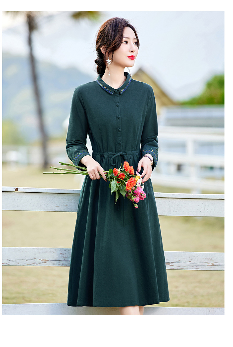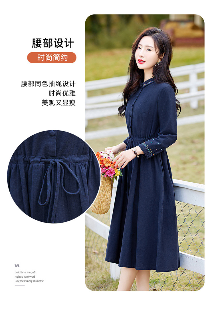 时尚简约休闲气质小翻领棉麻文艺刺绣长袖连衣裙HR-WN22169