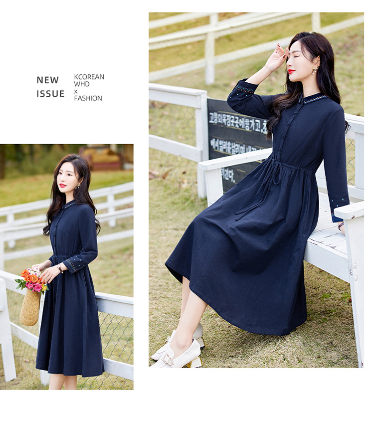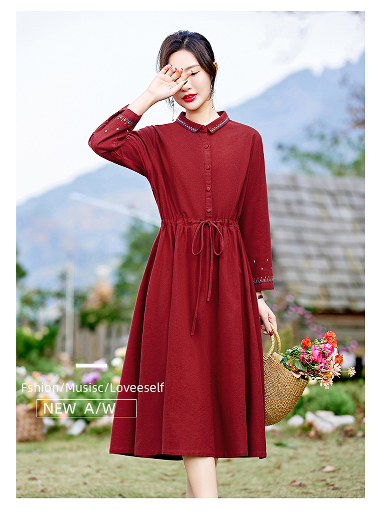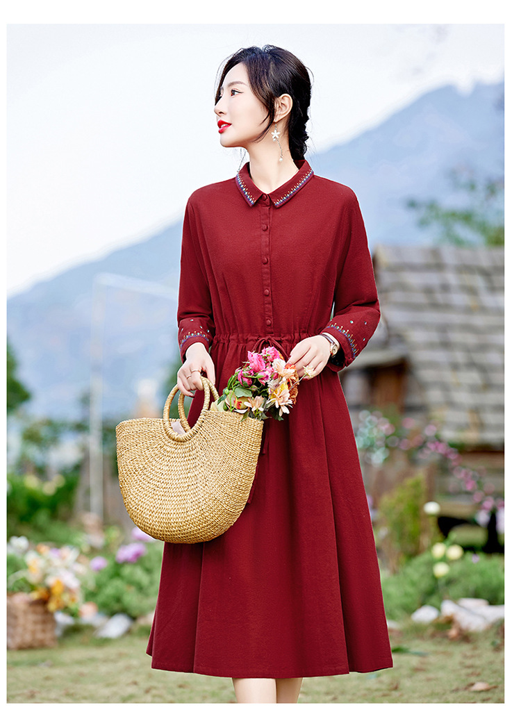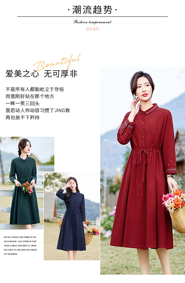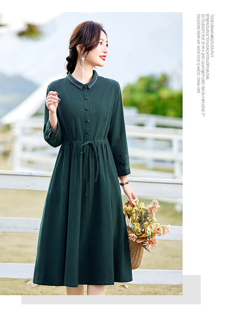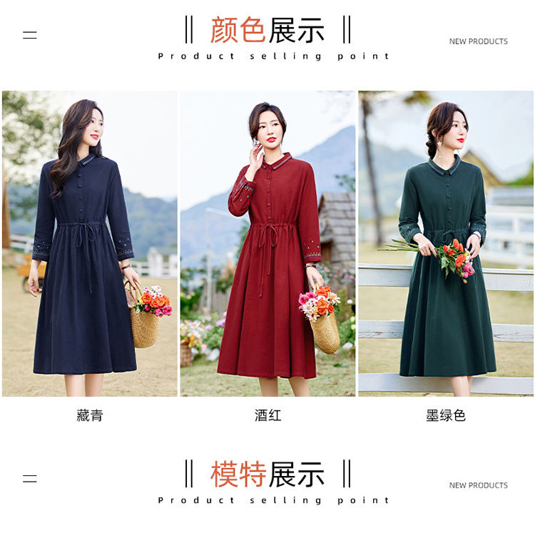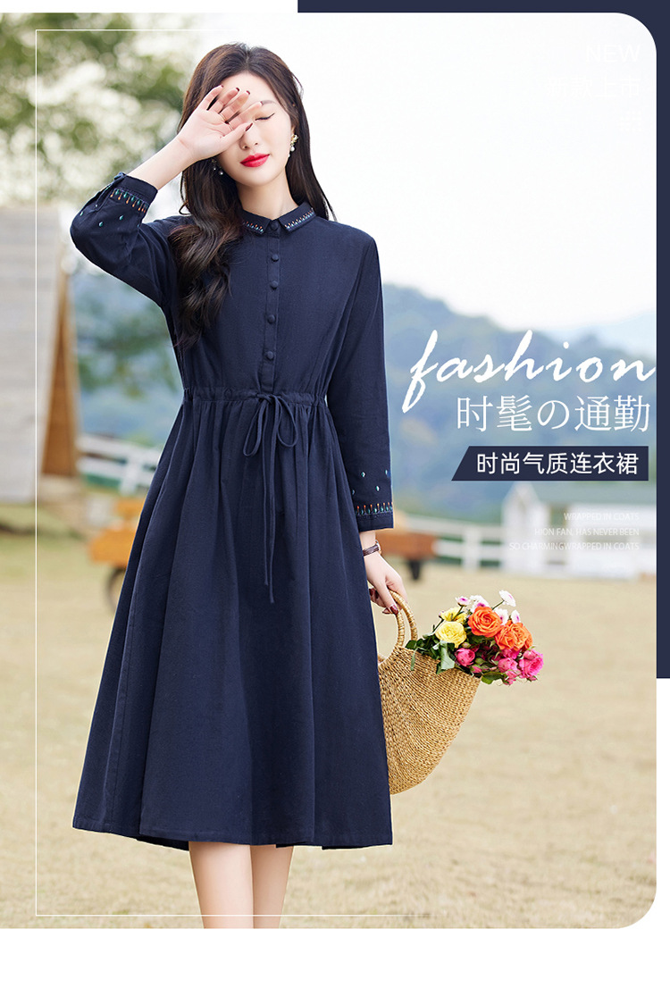 时尚简约休闲气质小翻领棉麻文艺刺绣长袖连衣裙HR-WN22169