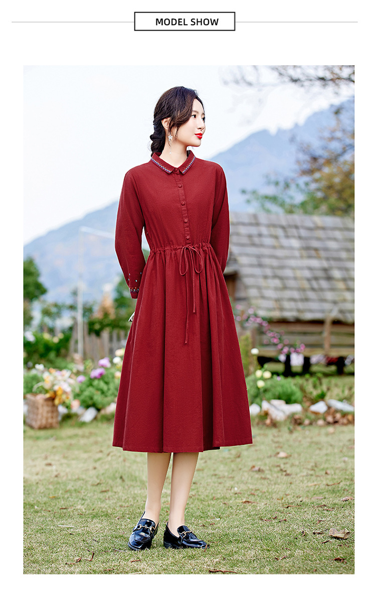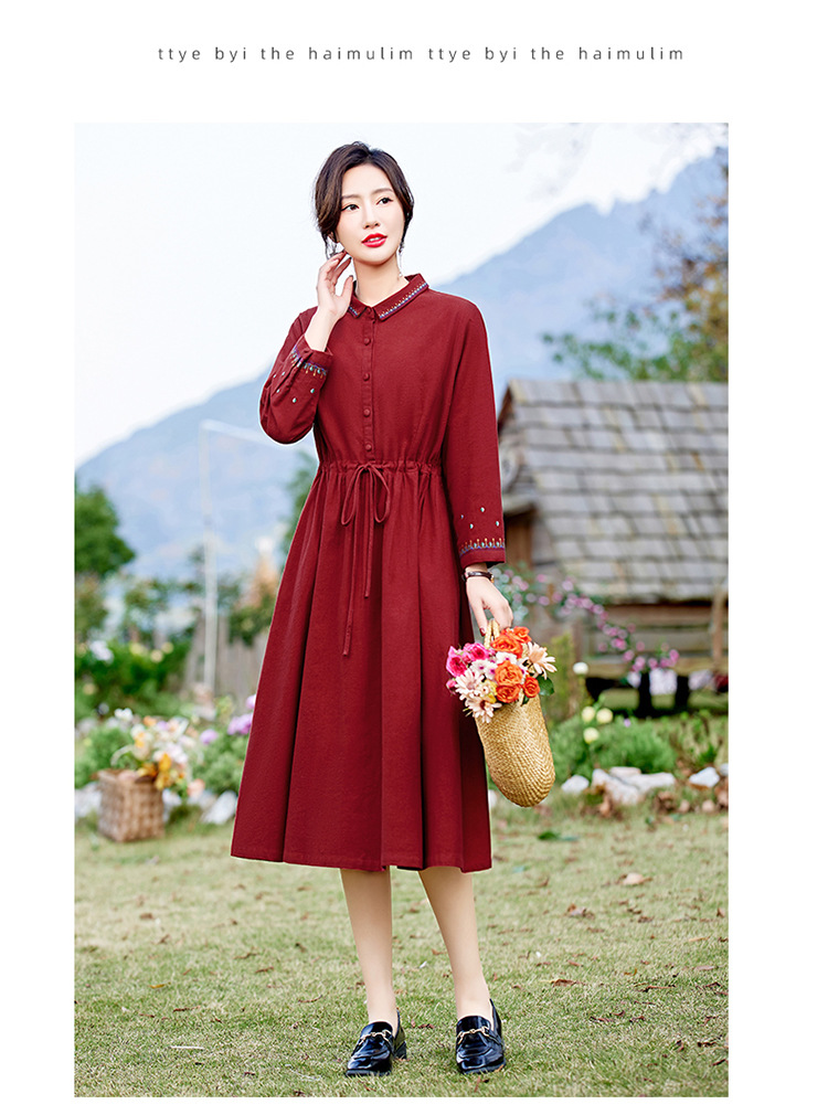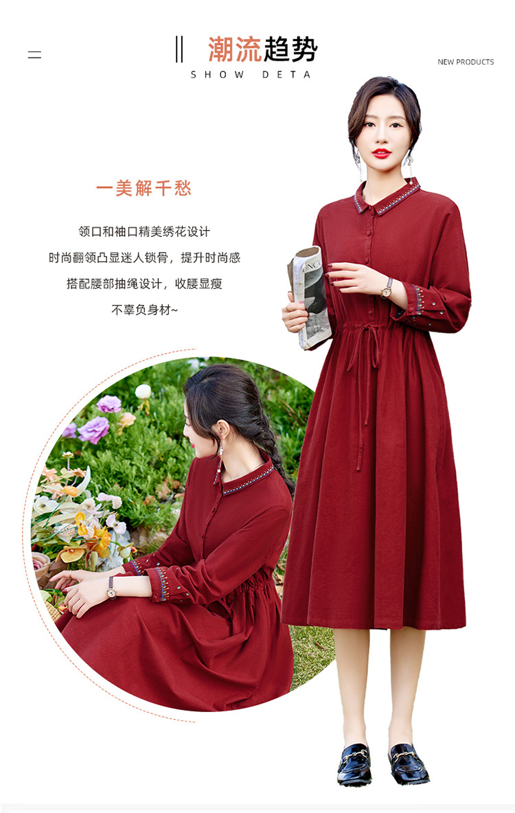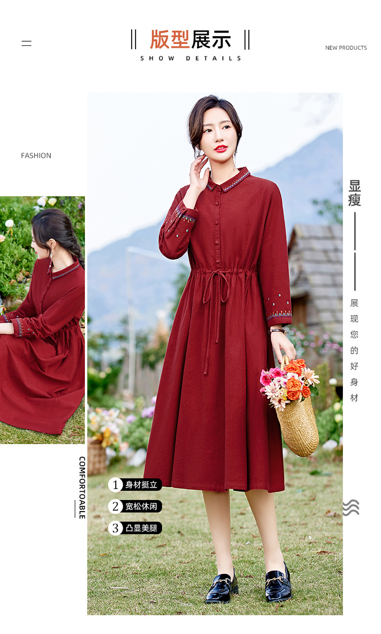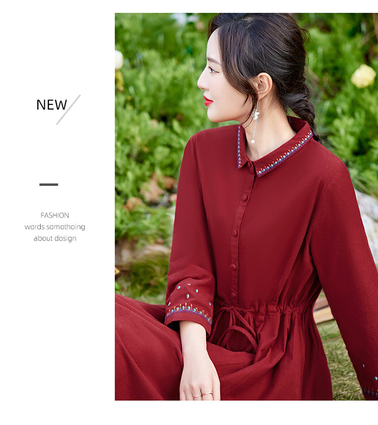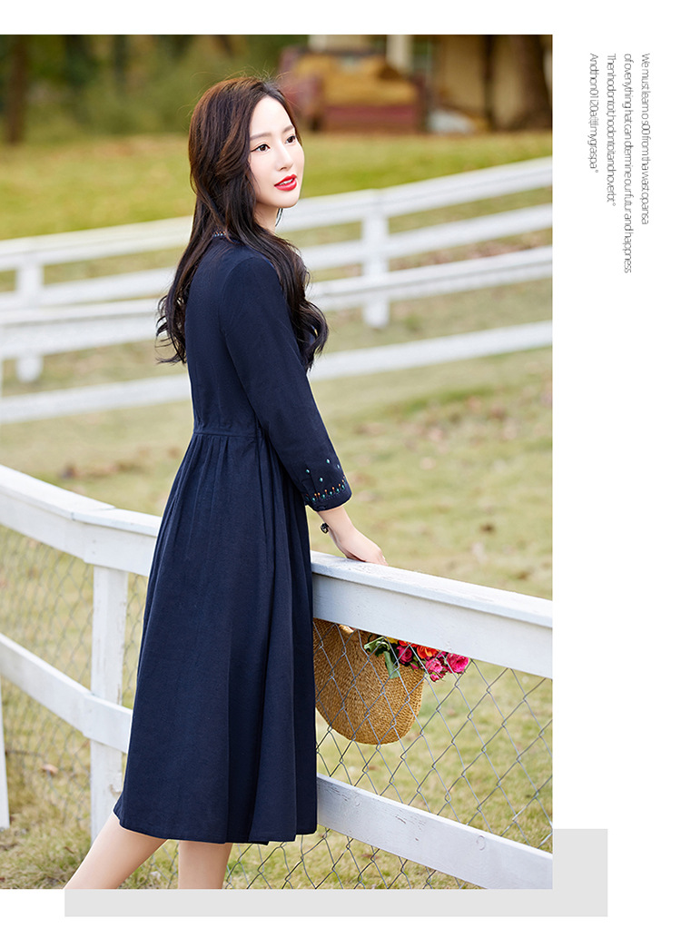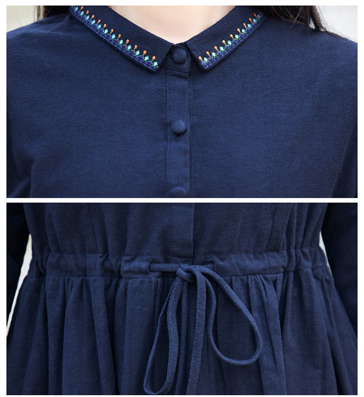 时尚简约休闲气质小翻领棉麻文艺刺绣长袖连衣裙HR-WN22169