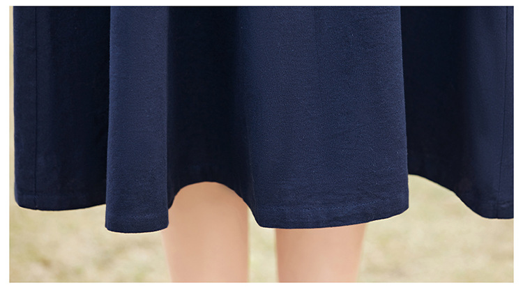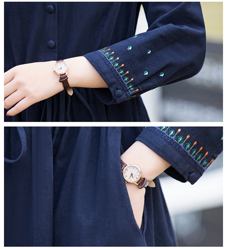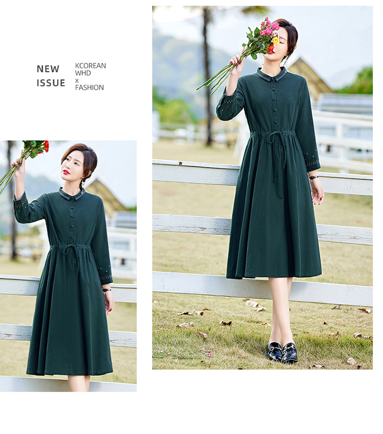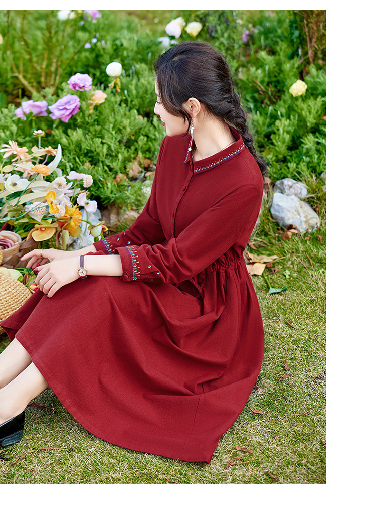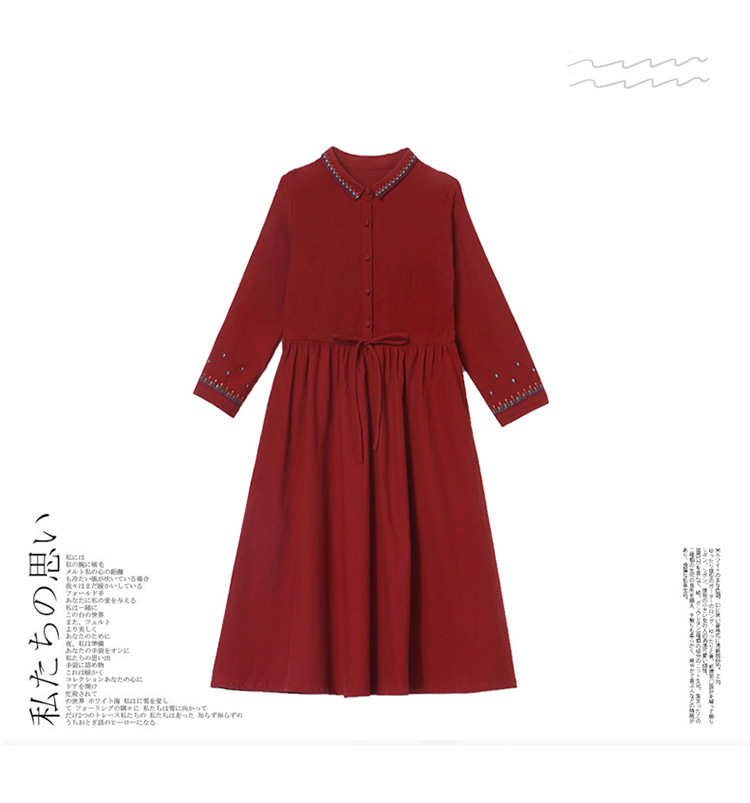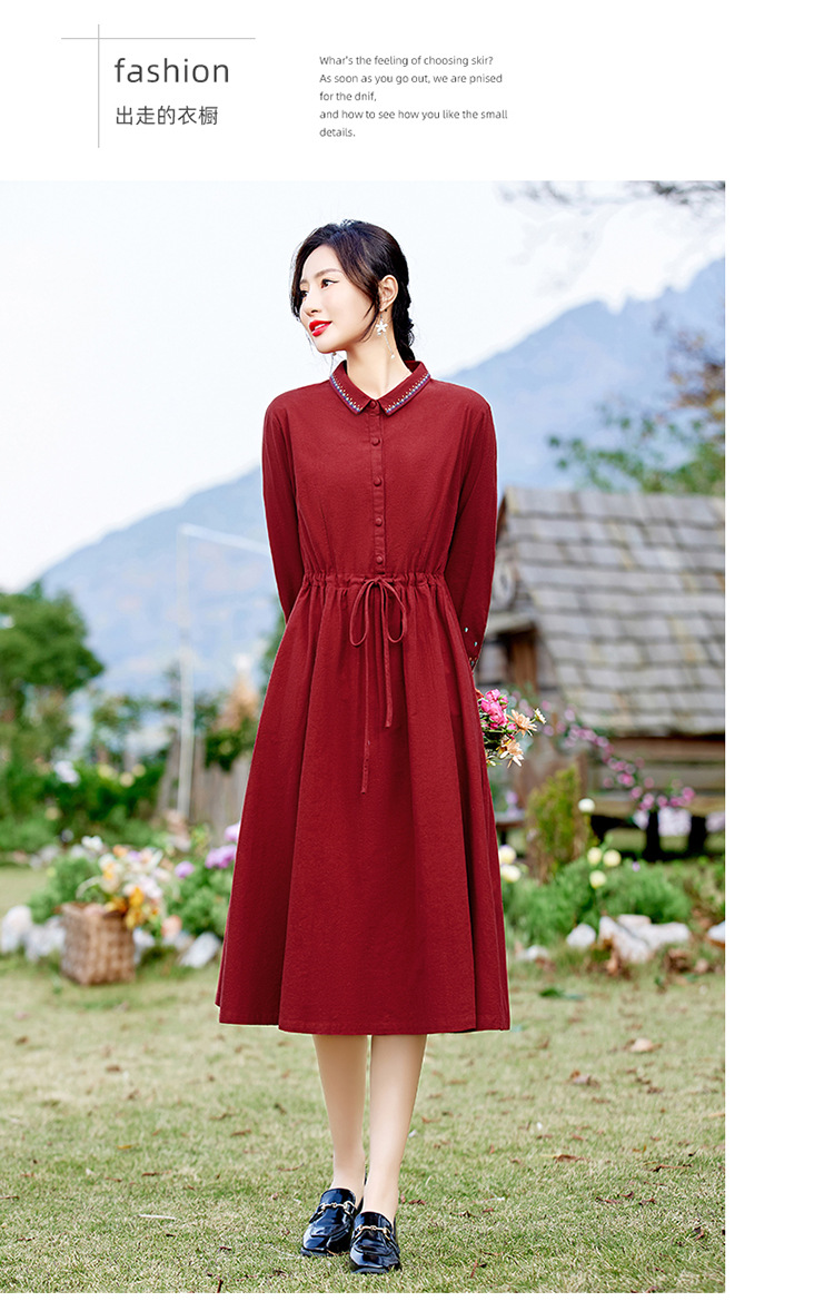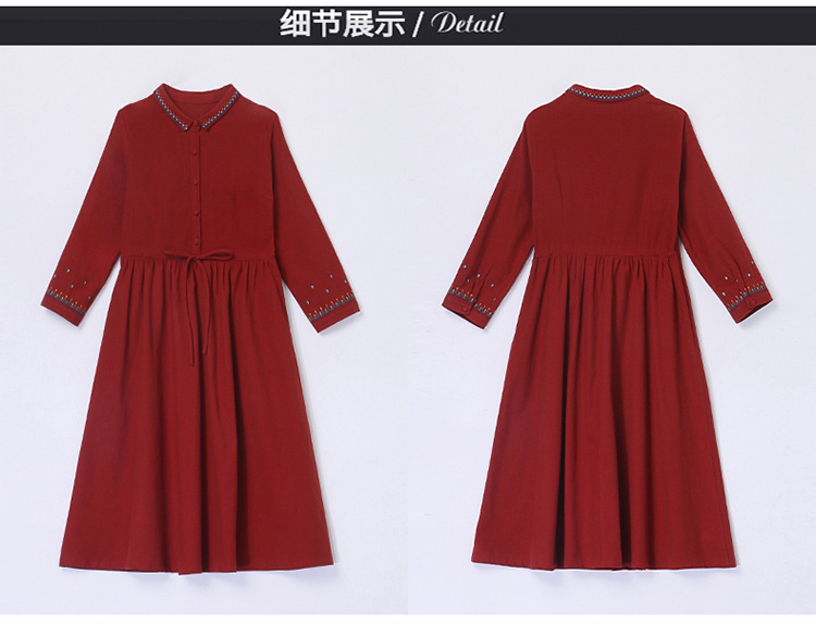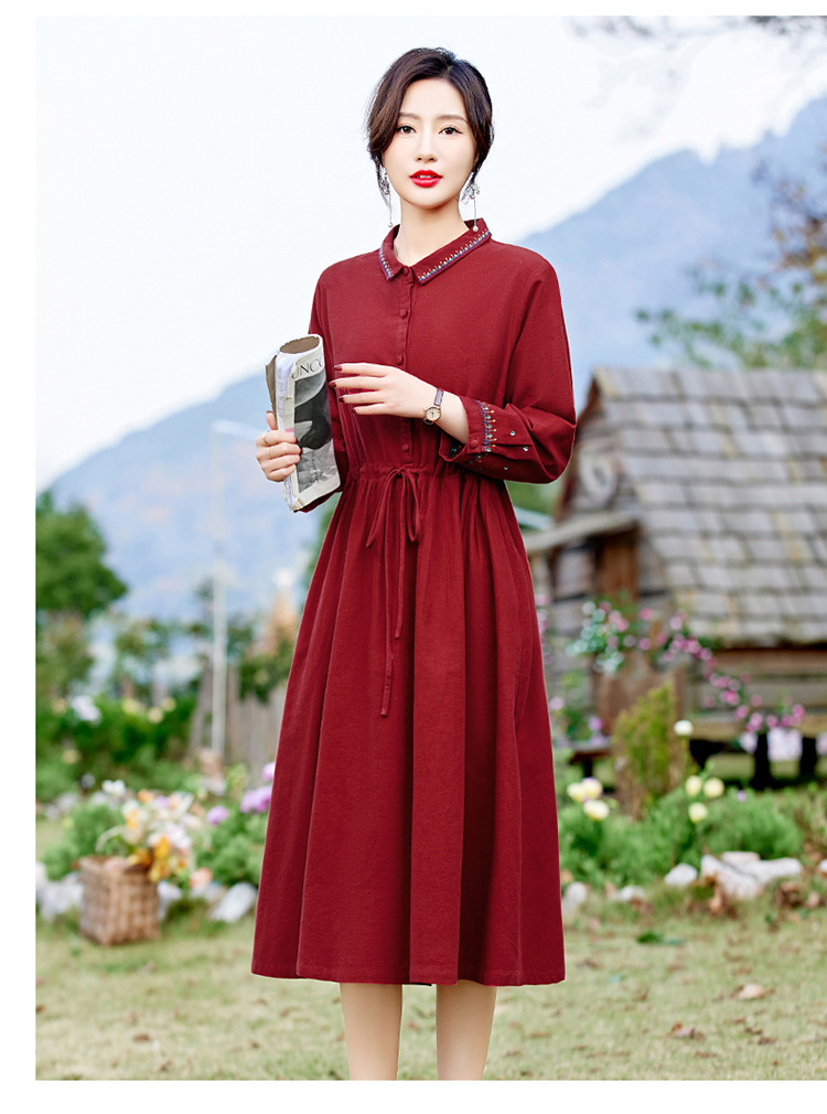 时尚简约休闲气质小翻领棉麻文艺刺绣长袖连衣裙HR-WN22169