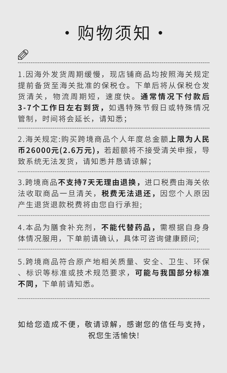 【注意事项】:您通过本平台购买的所有跨境商品等同于境外购买,仅限个人自用,不得进行二次销售。