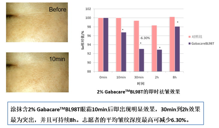 经华熙生物研究院证实,2%的GABA涂抹眼周10分钟后,就有明显的细纹改善效果。