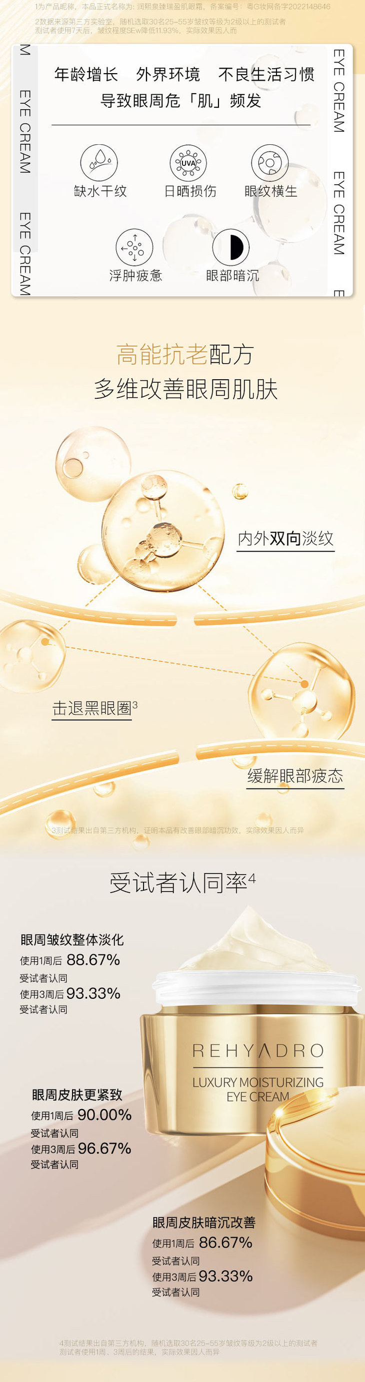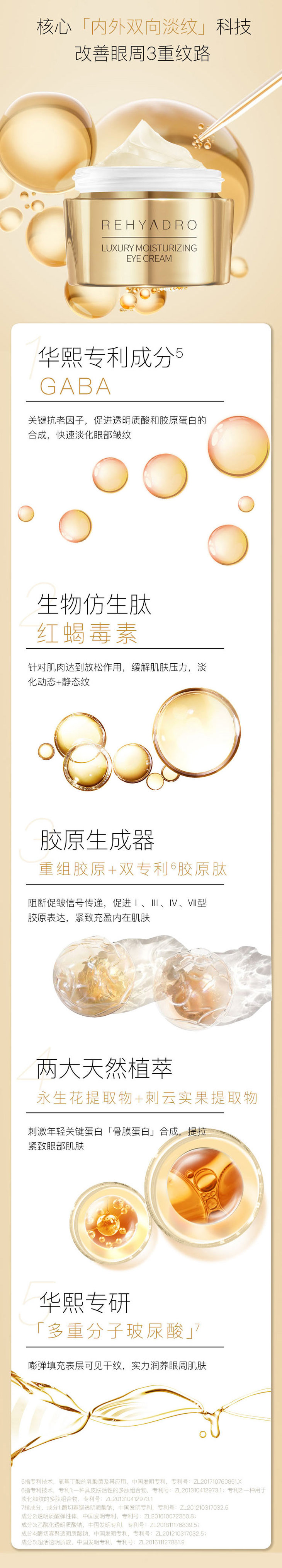 针对这些问题,润熙泉金熨斗眼霜特别添加了华熙生物专利成分GABA+贵比黄金的肽中之王红蝎肽来应对。