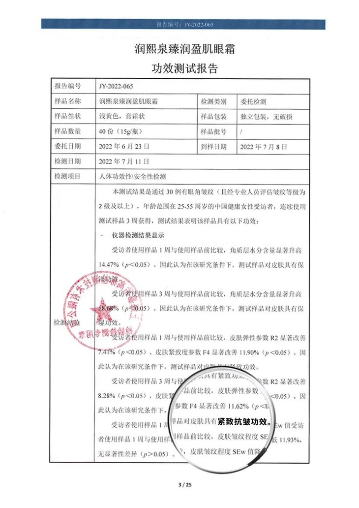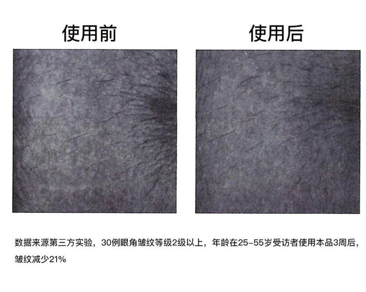 30例眼角皱纹等级2级以上,年龄在25-55岁受访者使用本品1周和3周后,眼部皱纹程度减少了21%。