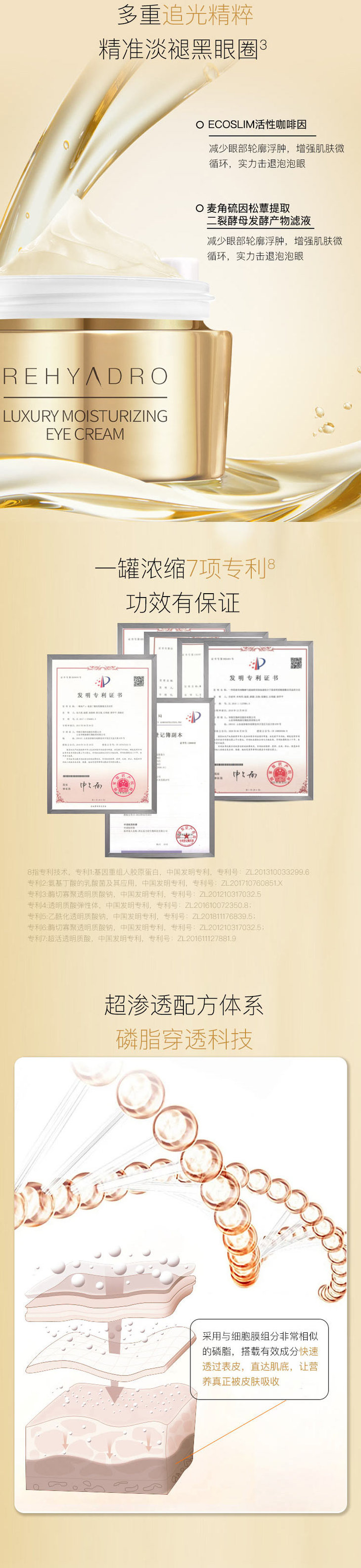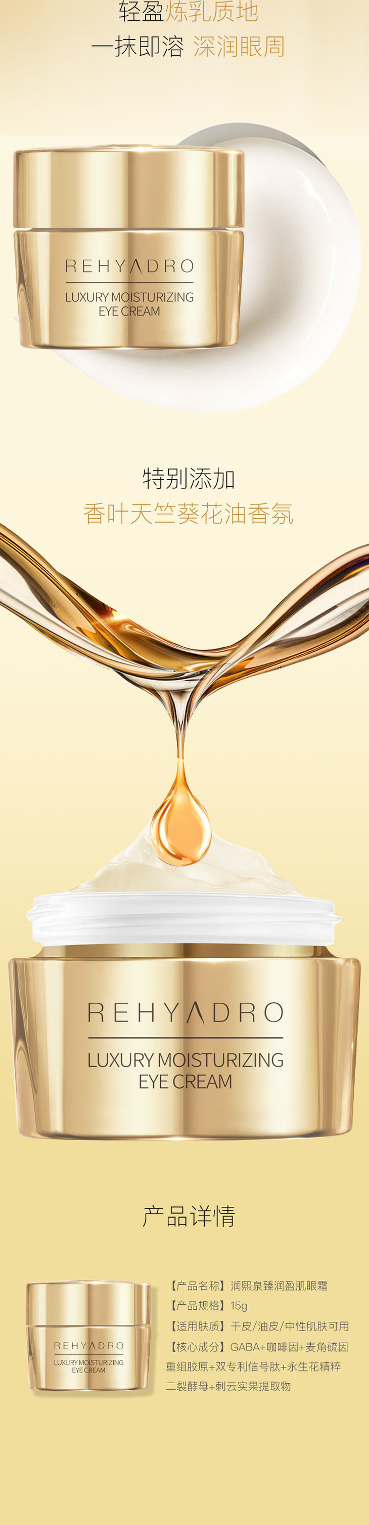 这款润熙泉金熨斗眼霜特别添加了3重追光精粹:咖啡因+麦角硫因松蕈提取物+二裂酵母发酵产物滤液,帮你焕亮眼周。
