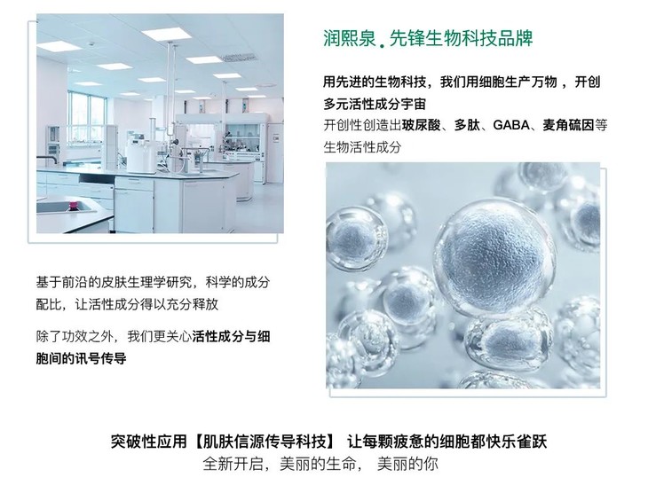 润熙泉定位于合成生物,集结了面部年轻化、发酵生物、功效临床研究等专业实验室,开创性的创造出玻尿酸、多肽、GABA、麦角硫因等生物活性成分。