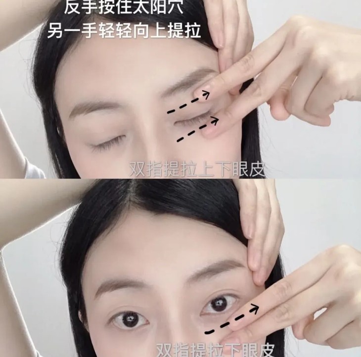 Step3:一只手反手按住太阳穴,另一只手用手指轻轻向后提拉眼周皮肤5-10次