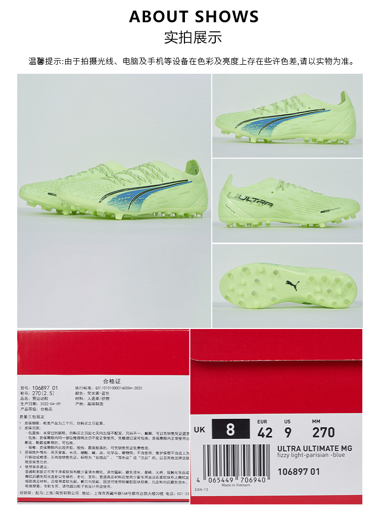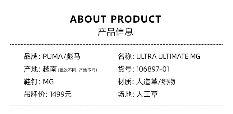 SFS彪马Puma正品ULTRA ULTIMATE 高端MG短钉人草足球鞋106897-01