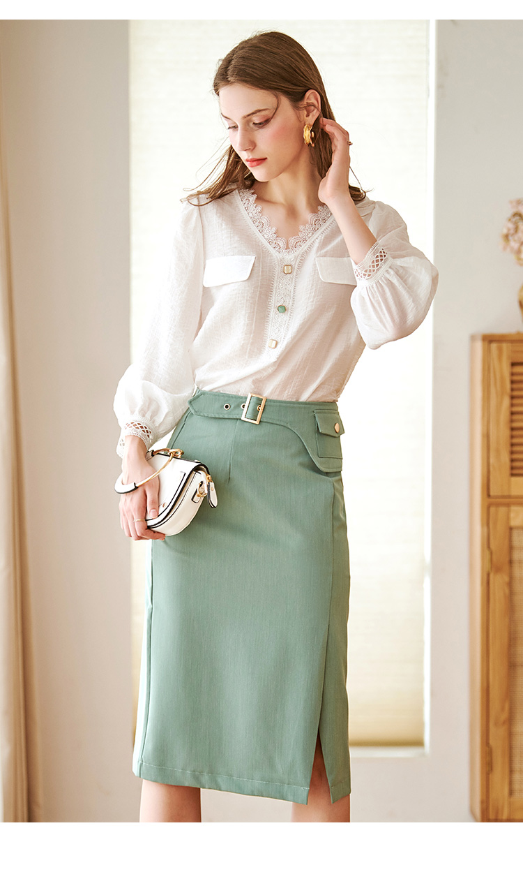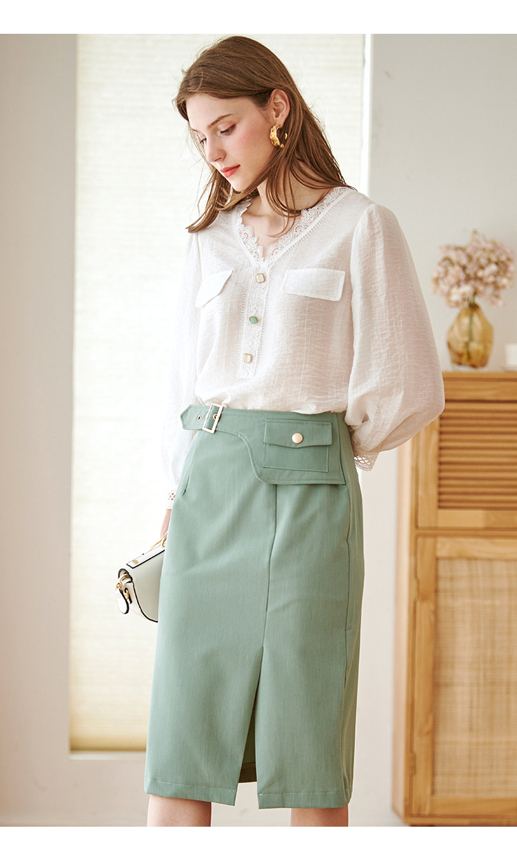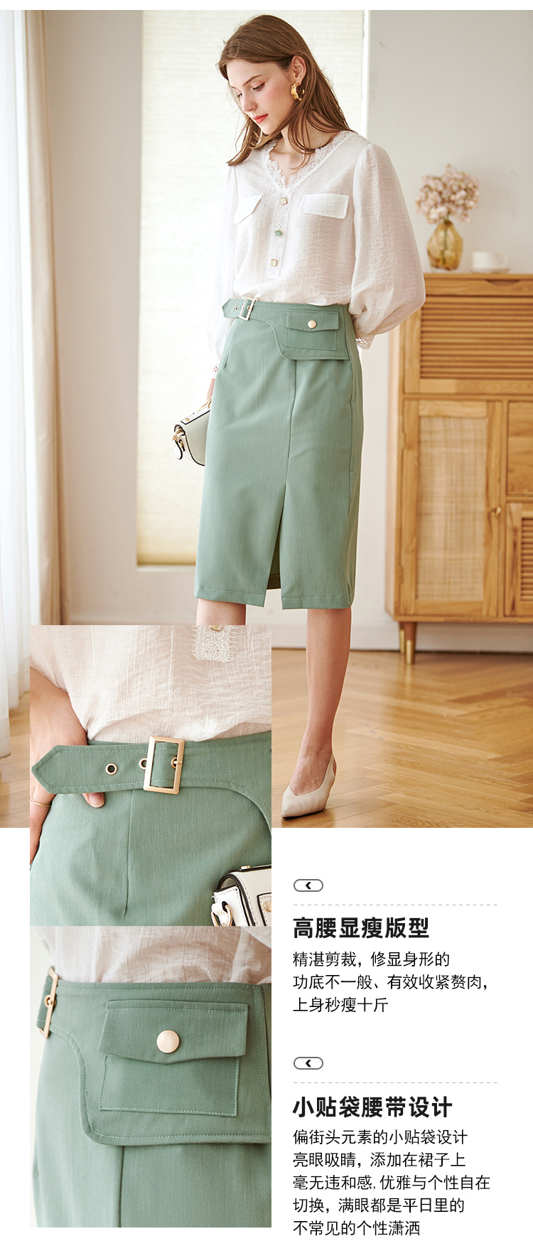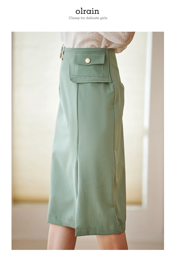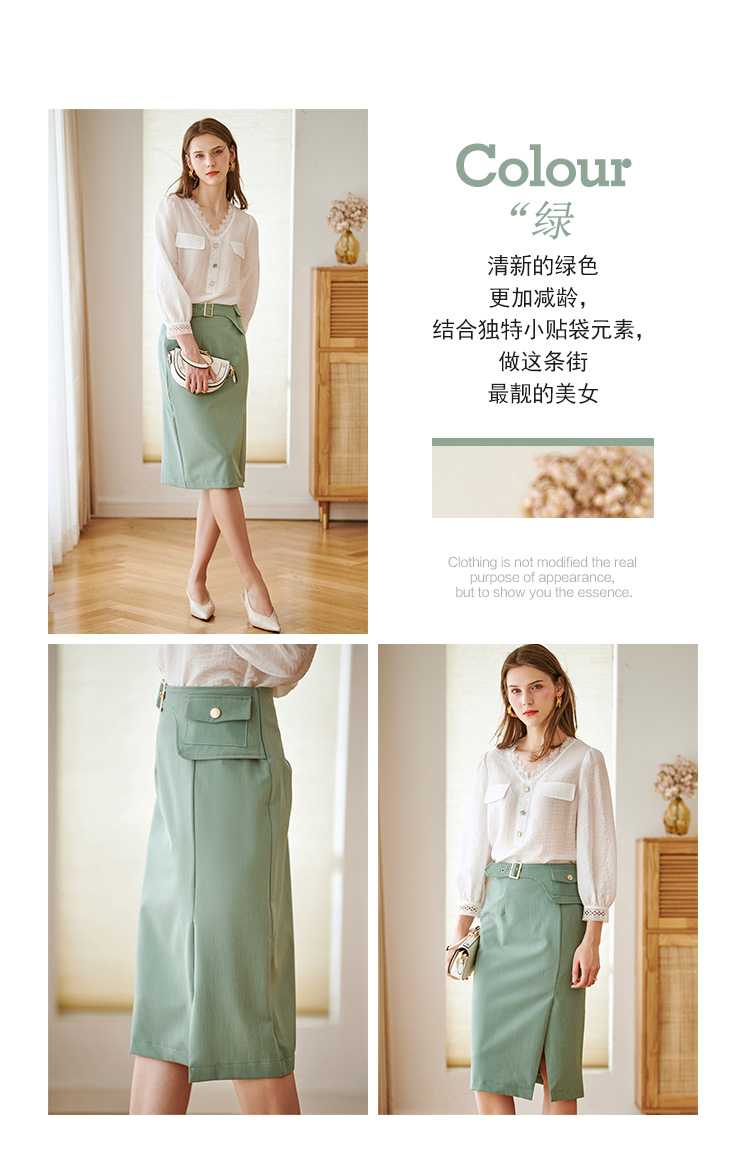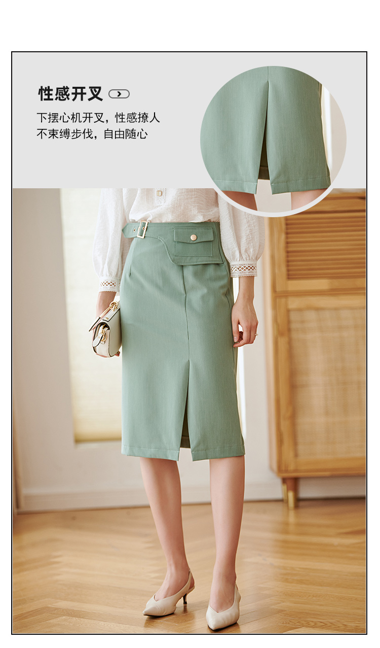 欧芮儿绿色半身裙中长款女高腰显瘦2022新款春装轻熟风开叉A字裙