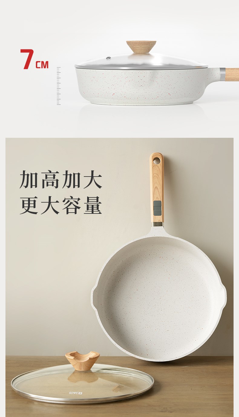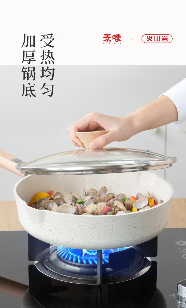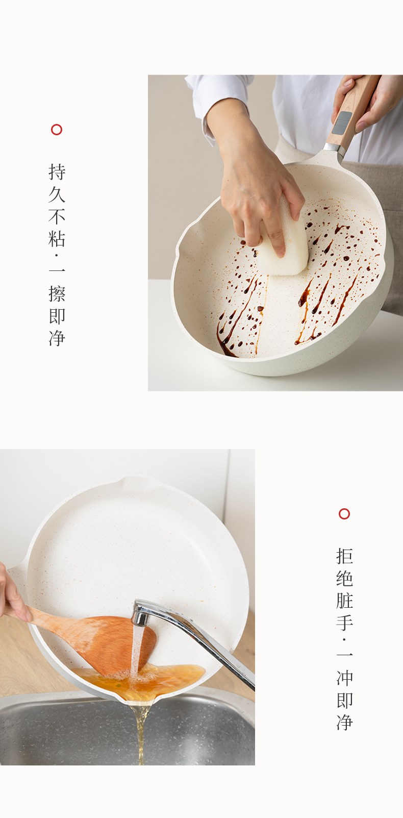 【持久不沾】火山岩小白锅 送:锅盖+榉木铲+5 分食筷+海绵擦3个 家用煎炒多功能 高颜值不粘锅 素味 包邮