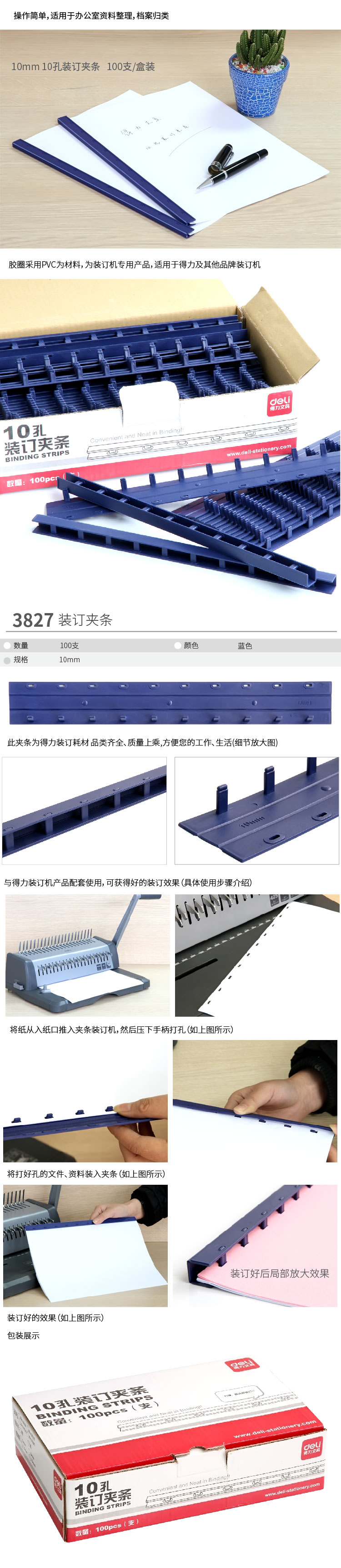 得力3827-10孔装订夹条(黑)300*10mm(100支/盒) 商品图2