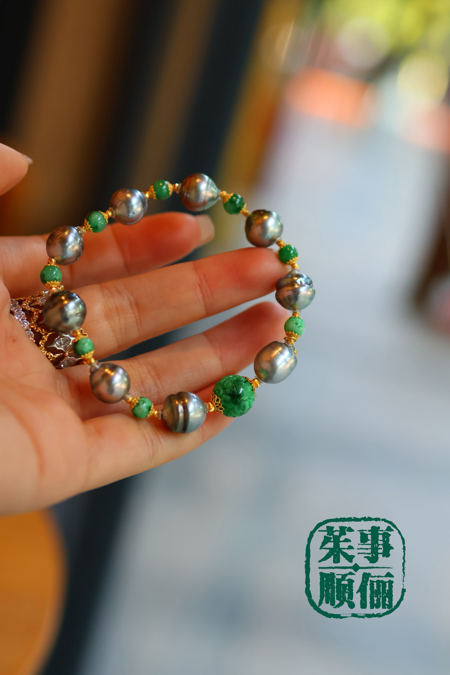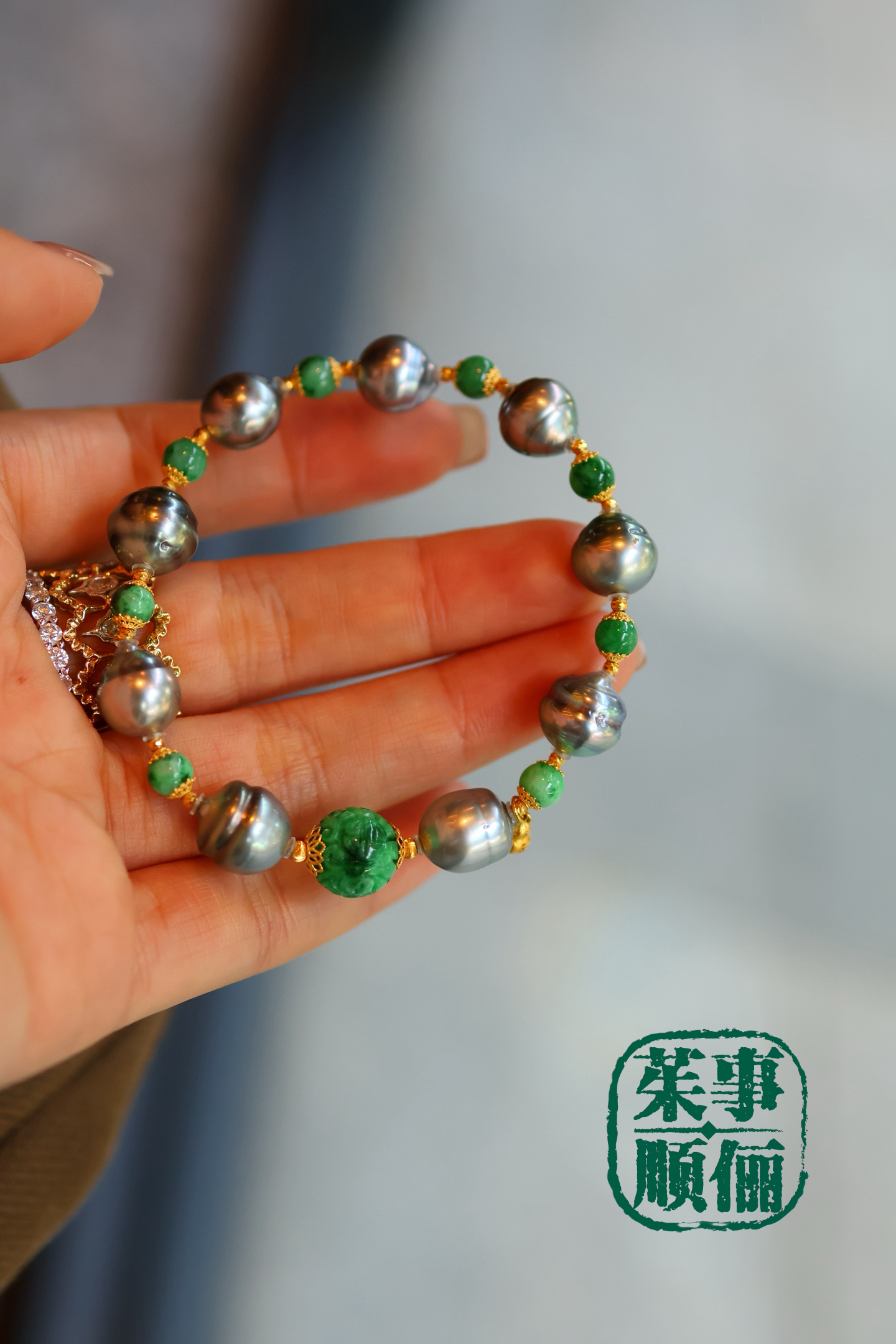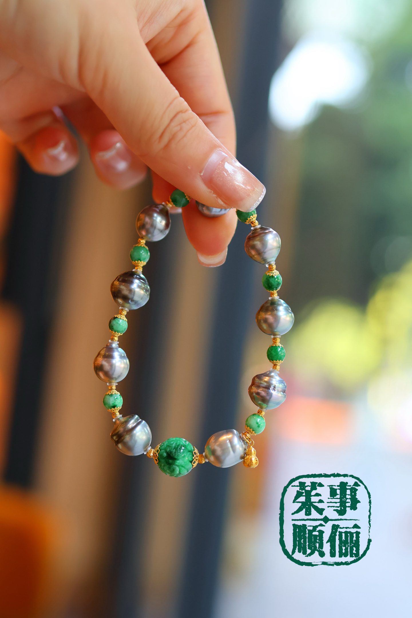 【茱事顺俪】18k黄金翡翠大溪地螺纹珍珠手链