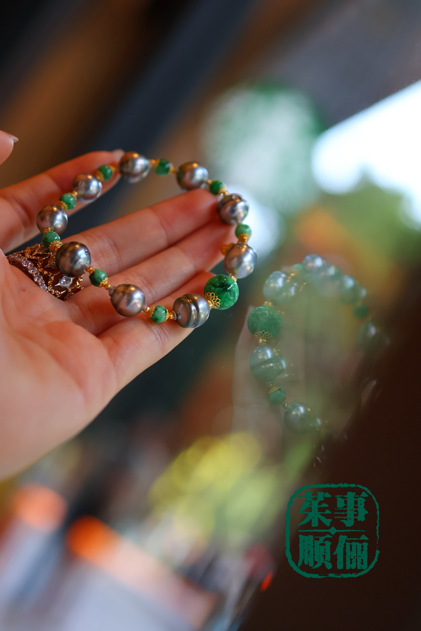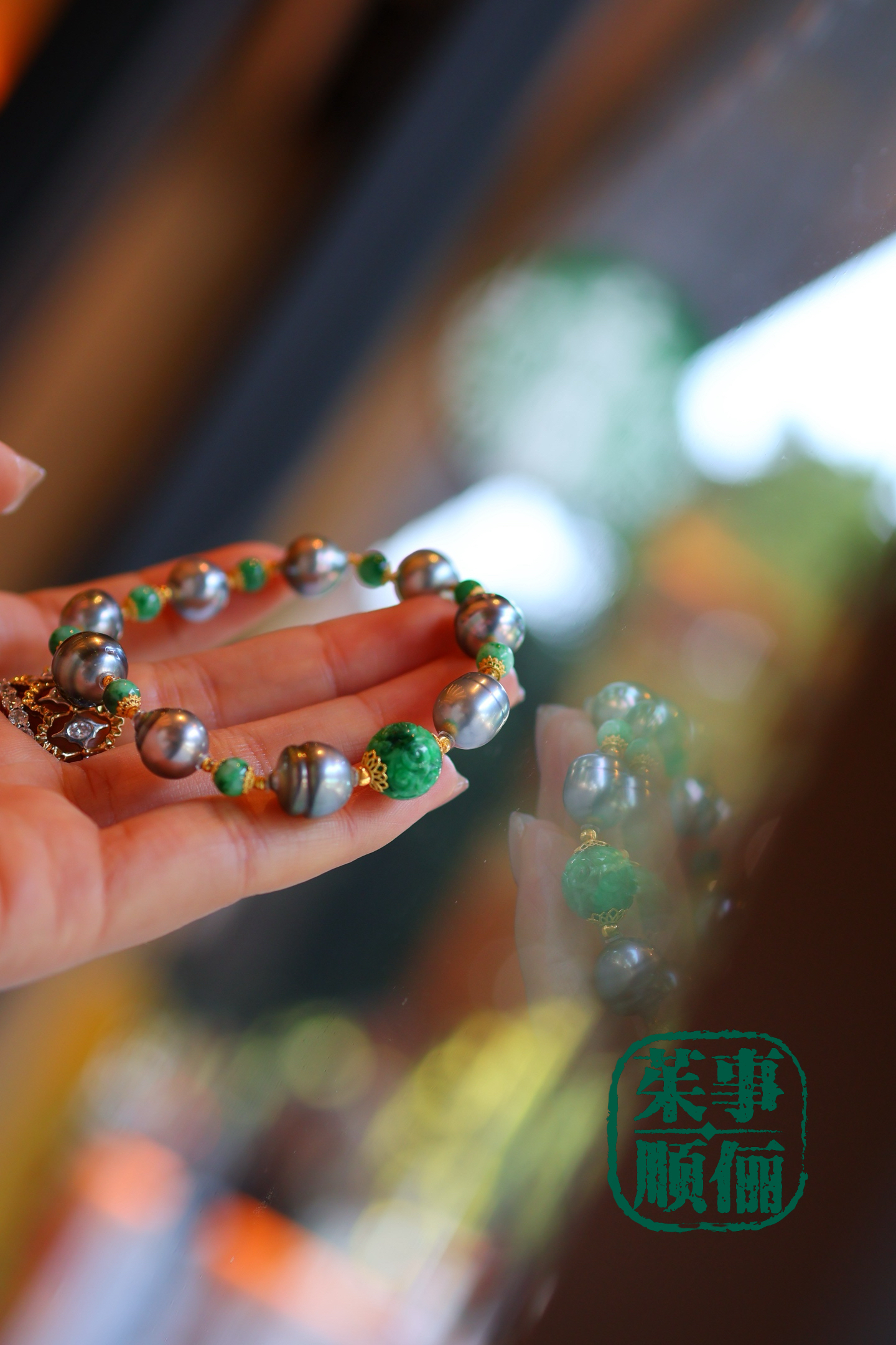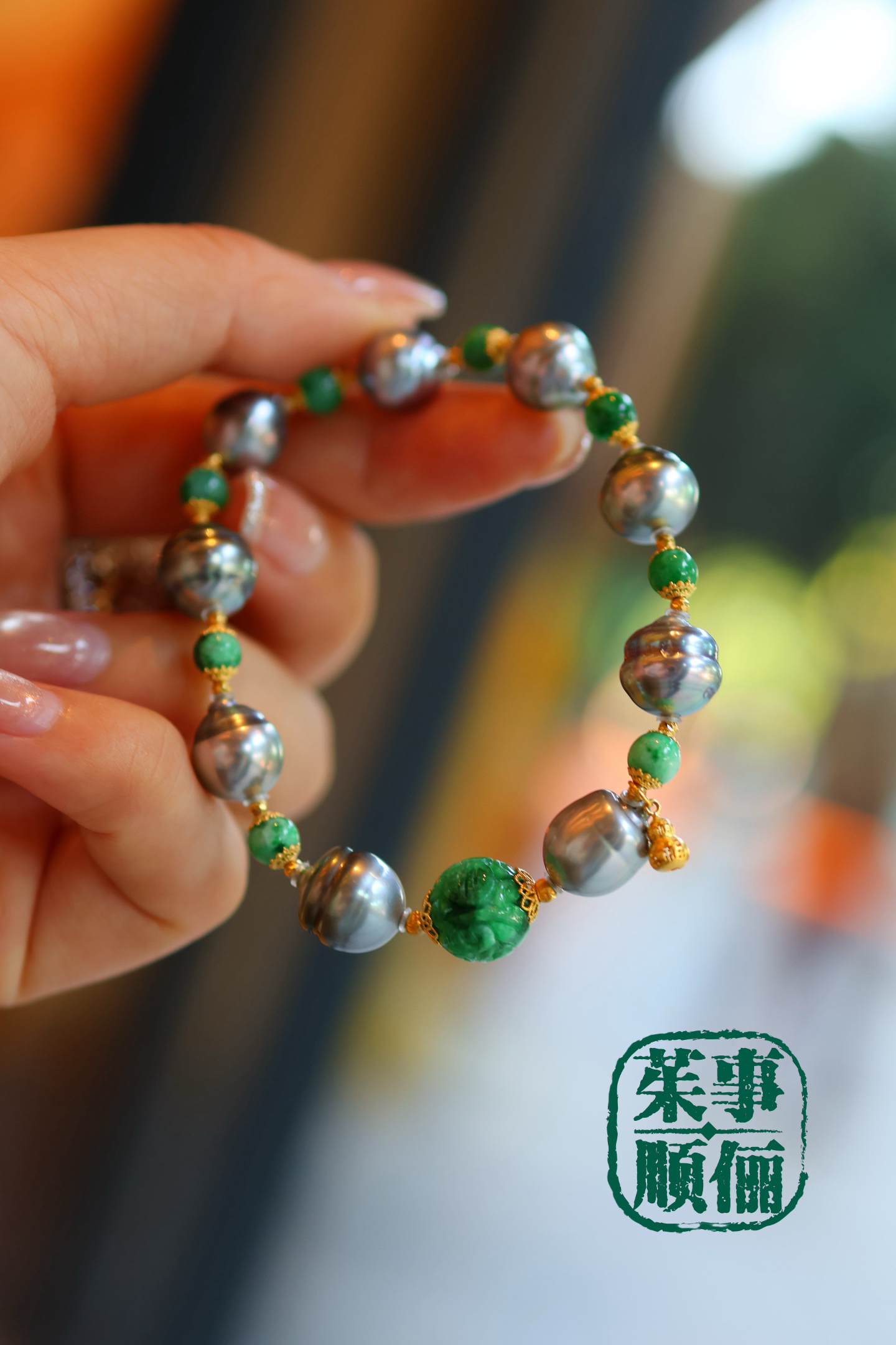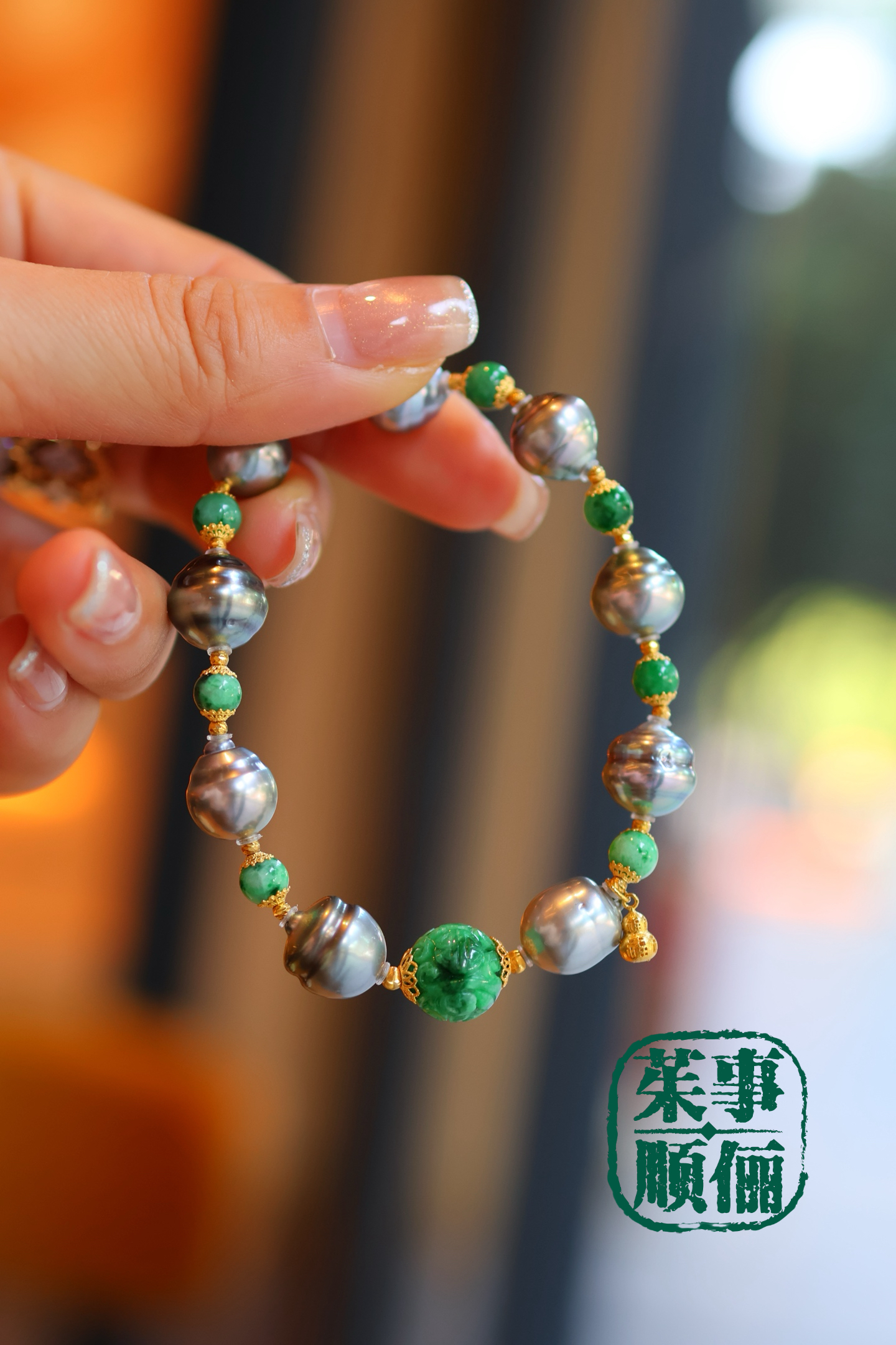 【茱事顺俪】18k黄金翡翠大溪地螺纹珍珠手链