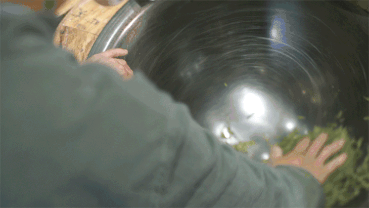 所有采摘好的鲜茶,要第一时间放入晾筛中摊放, 通常需要六至十小时,让其自然萎凋。 这一程序,叫“摊青”。 摊青结束后,要马不停蹄地开始杀青 杀青后,放于阴凉处进行薄摊回潮,约40~60分钟。 再继续放回锅中炒,除去水分,增添香气滋味。