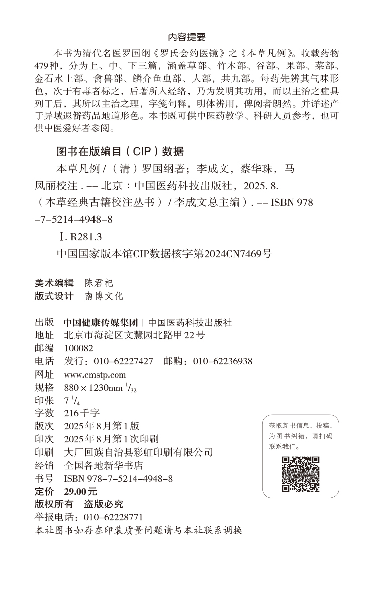 本草凡例(本草经典古籍校注丛书)(清)罗国纲著 李成文 蔡华珠 可供中医药教学 科研人员参考 9787521449488 中国医药科技出版社