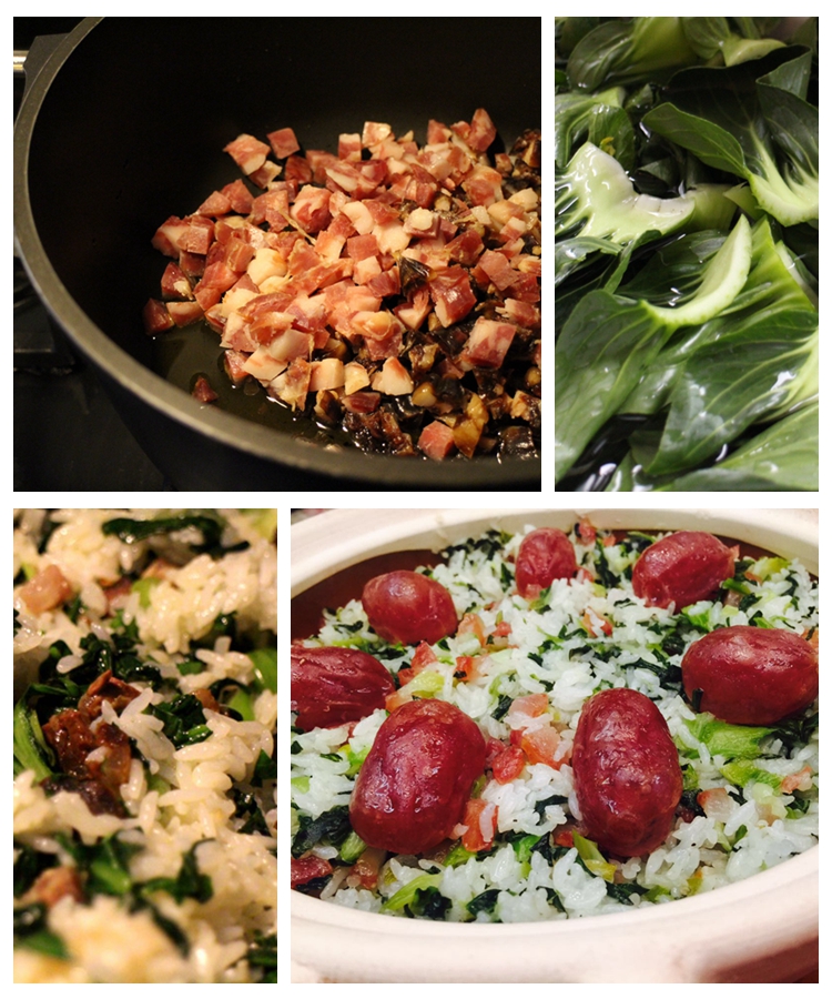 2、起油锅煸香肥膘,或者直接下一大块猪油,下青菜、香肠丁翻炒,倒入煮好的米饭,加调味料,翻拌均匀。(用电饭煲做的话,可以在米饭煮好前十分钟下炒好的青菜、肉丁)