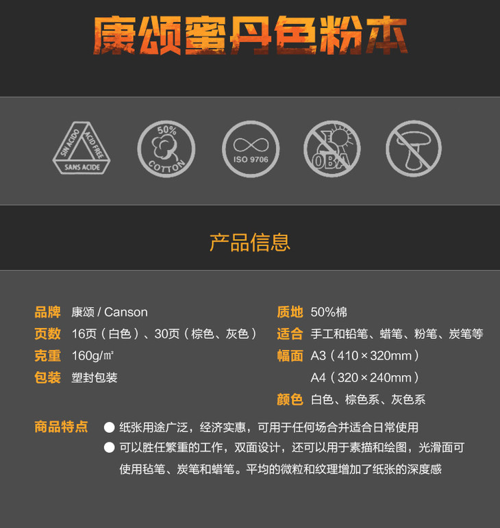 法国康颂CANSON蜜丹Mi-Teintes粉画本 色粉纸/本 粉画纸版画纸30