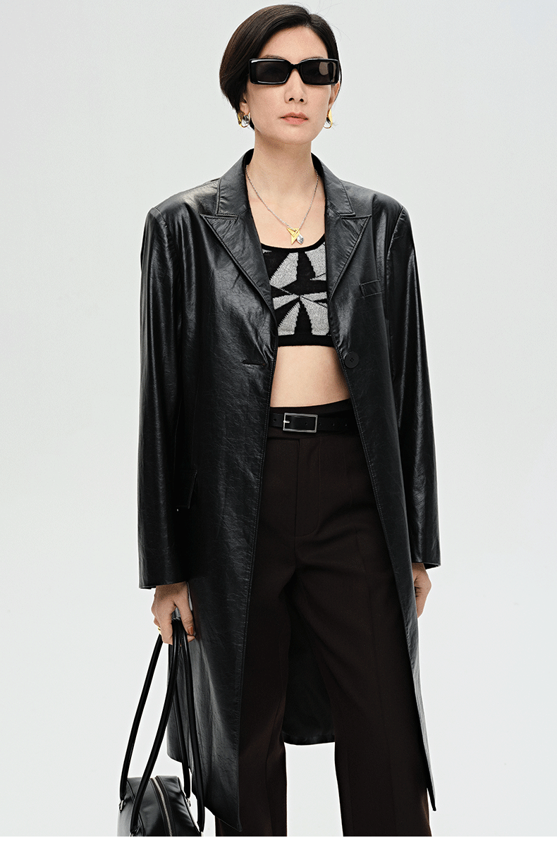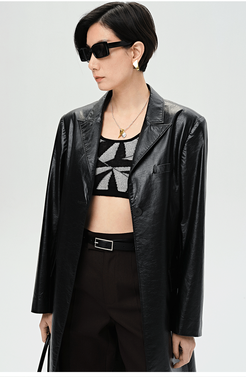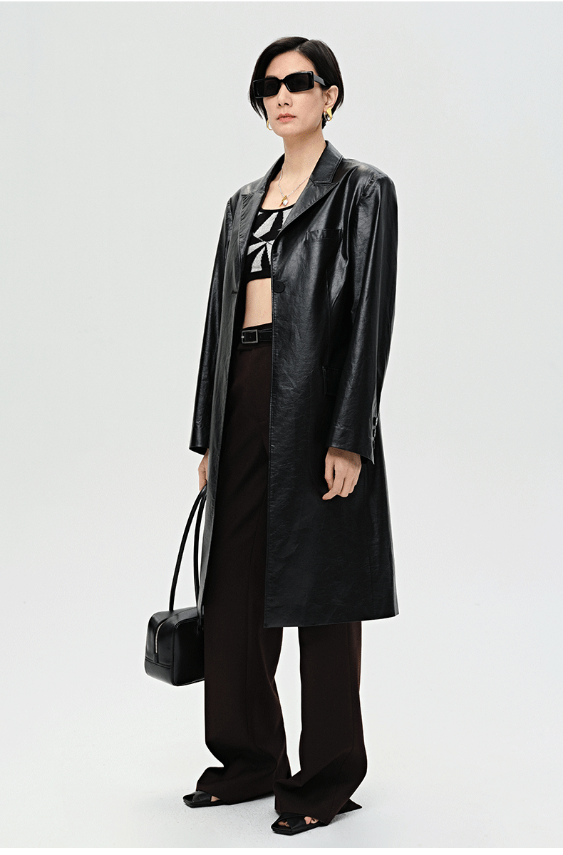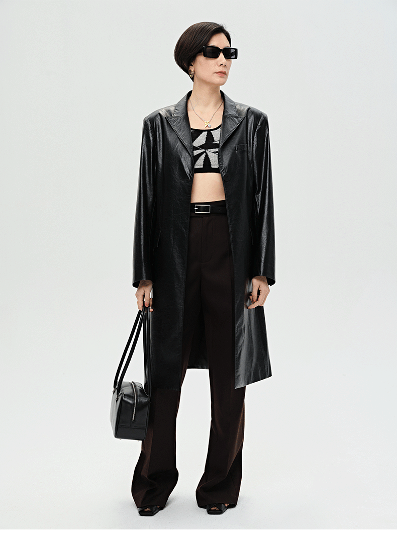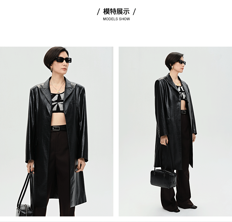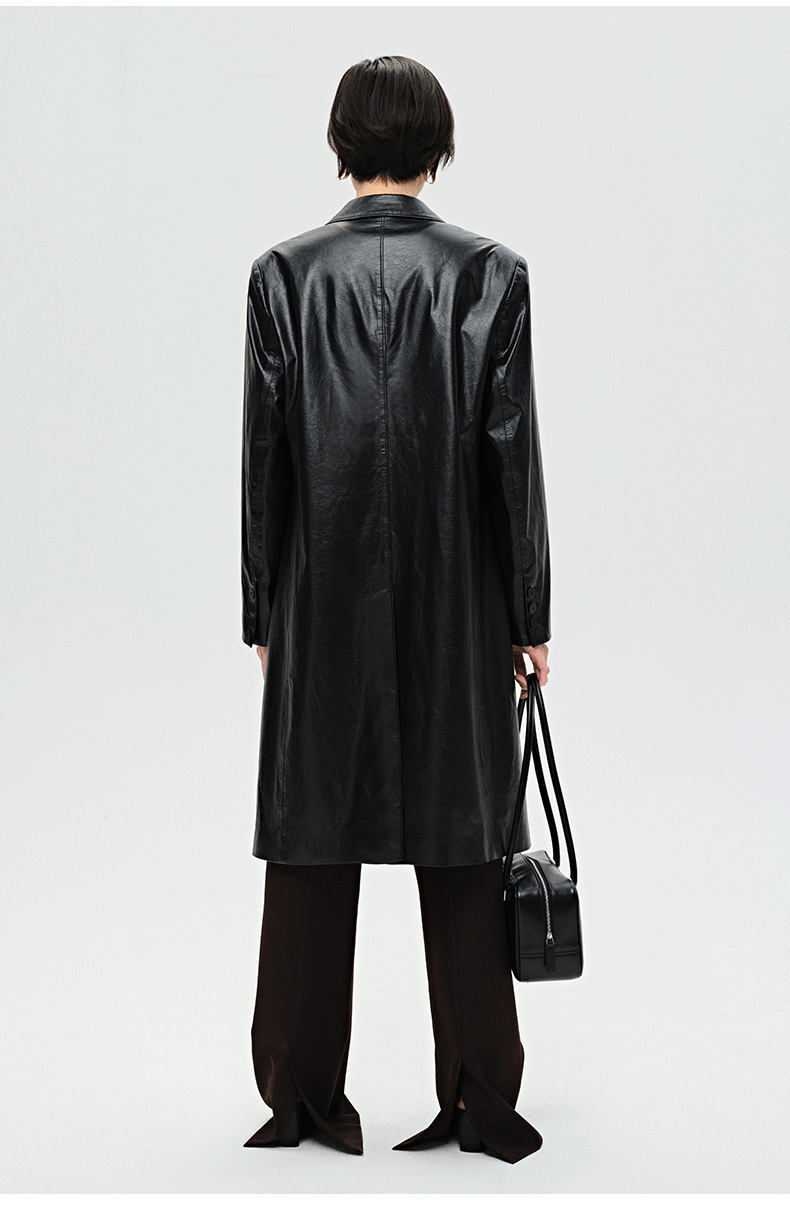 HIDEMI 黑色褶皱PU环保皮长款西装风衣皮衣