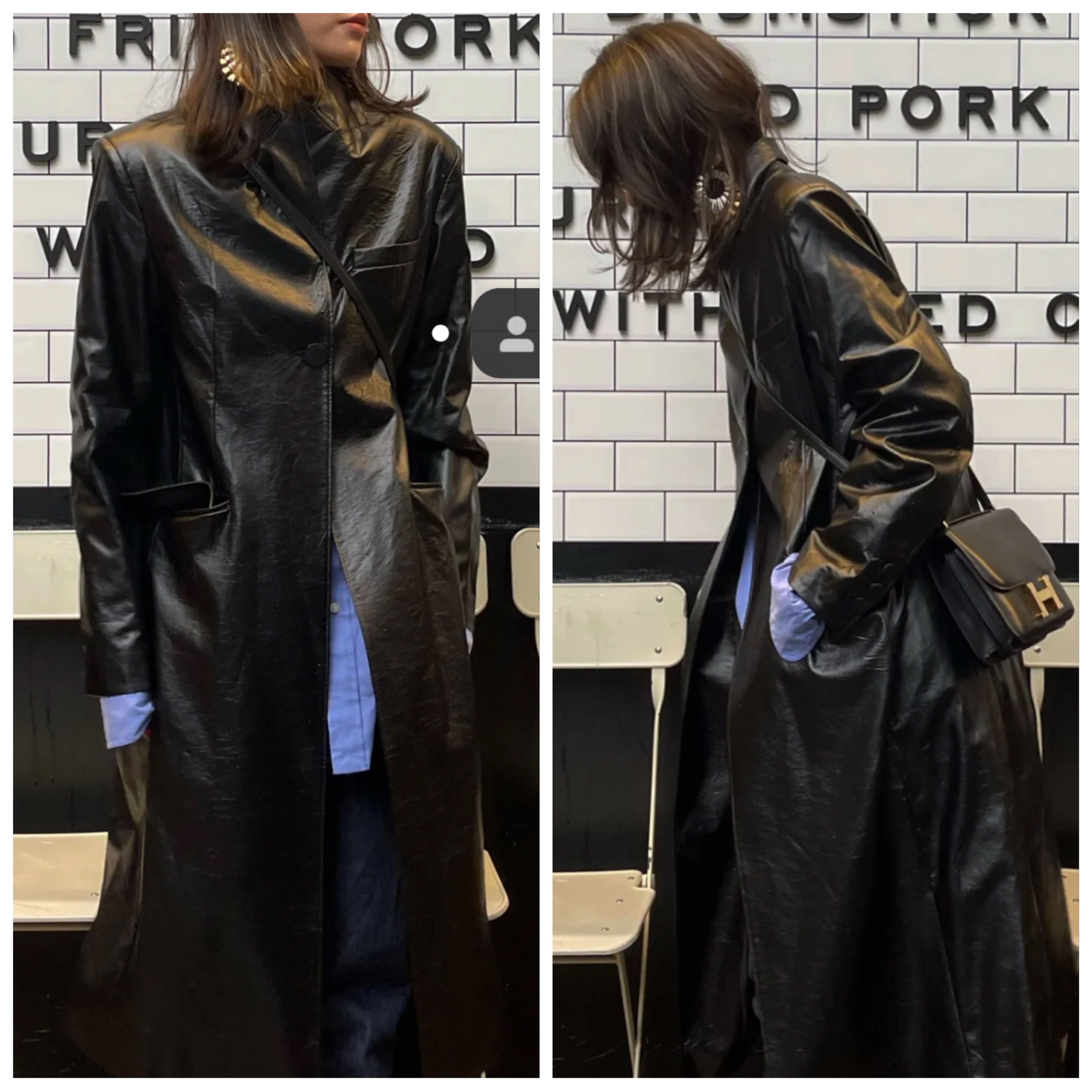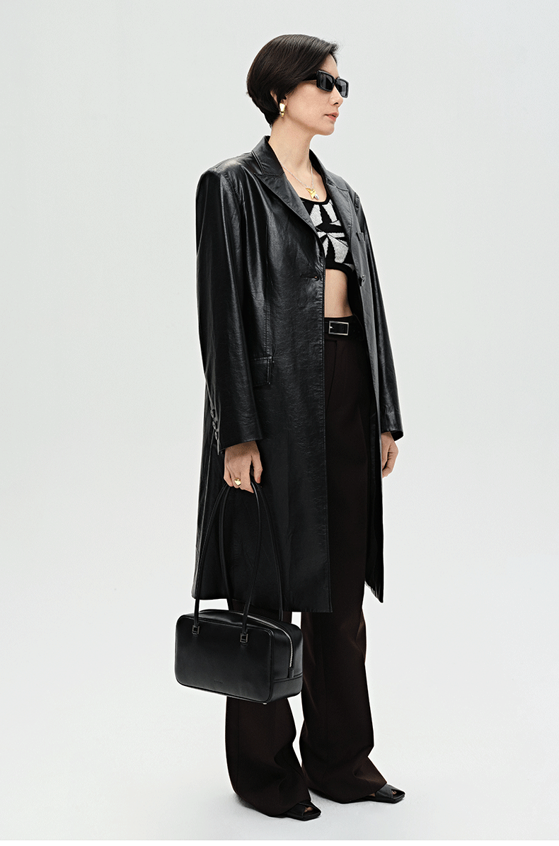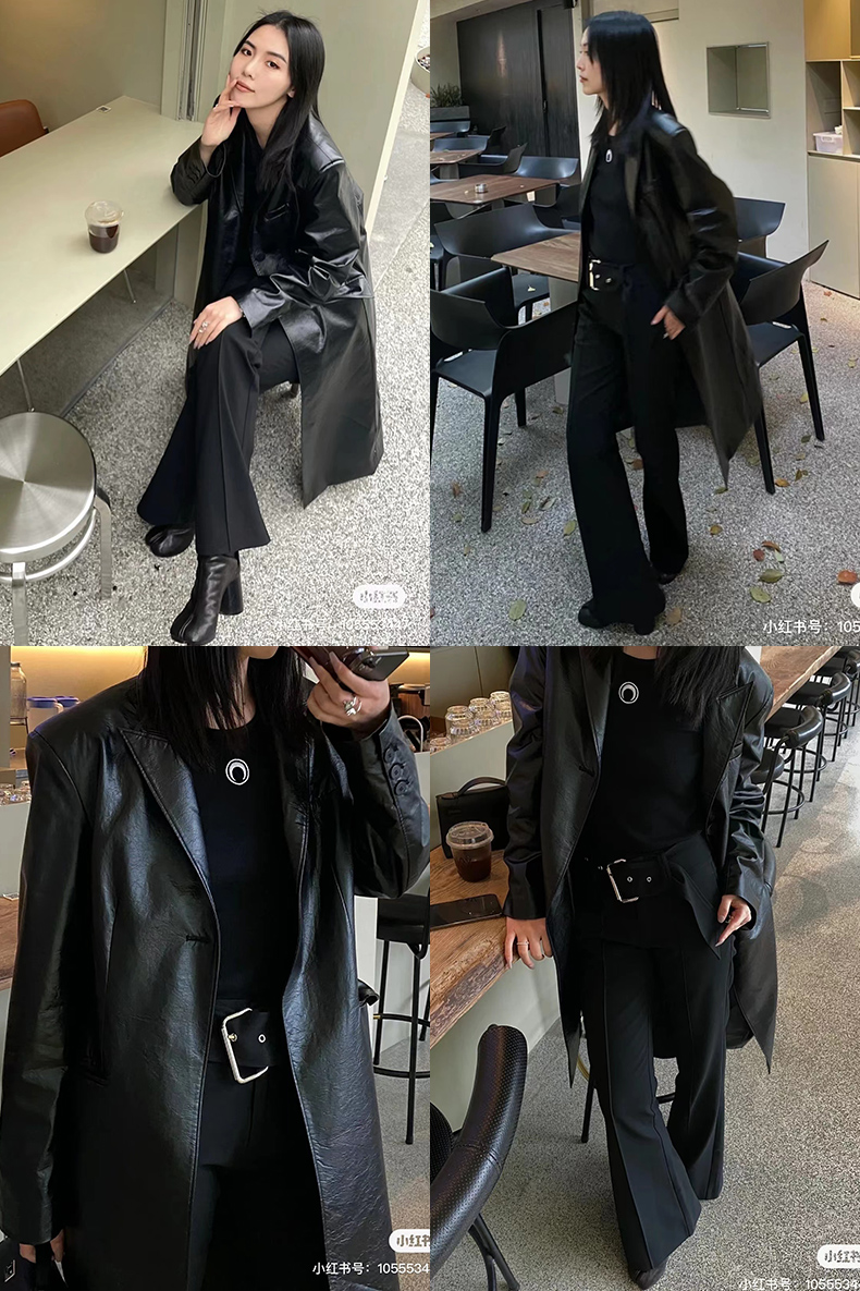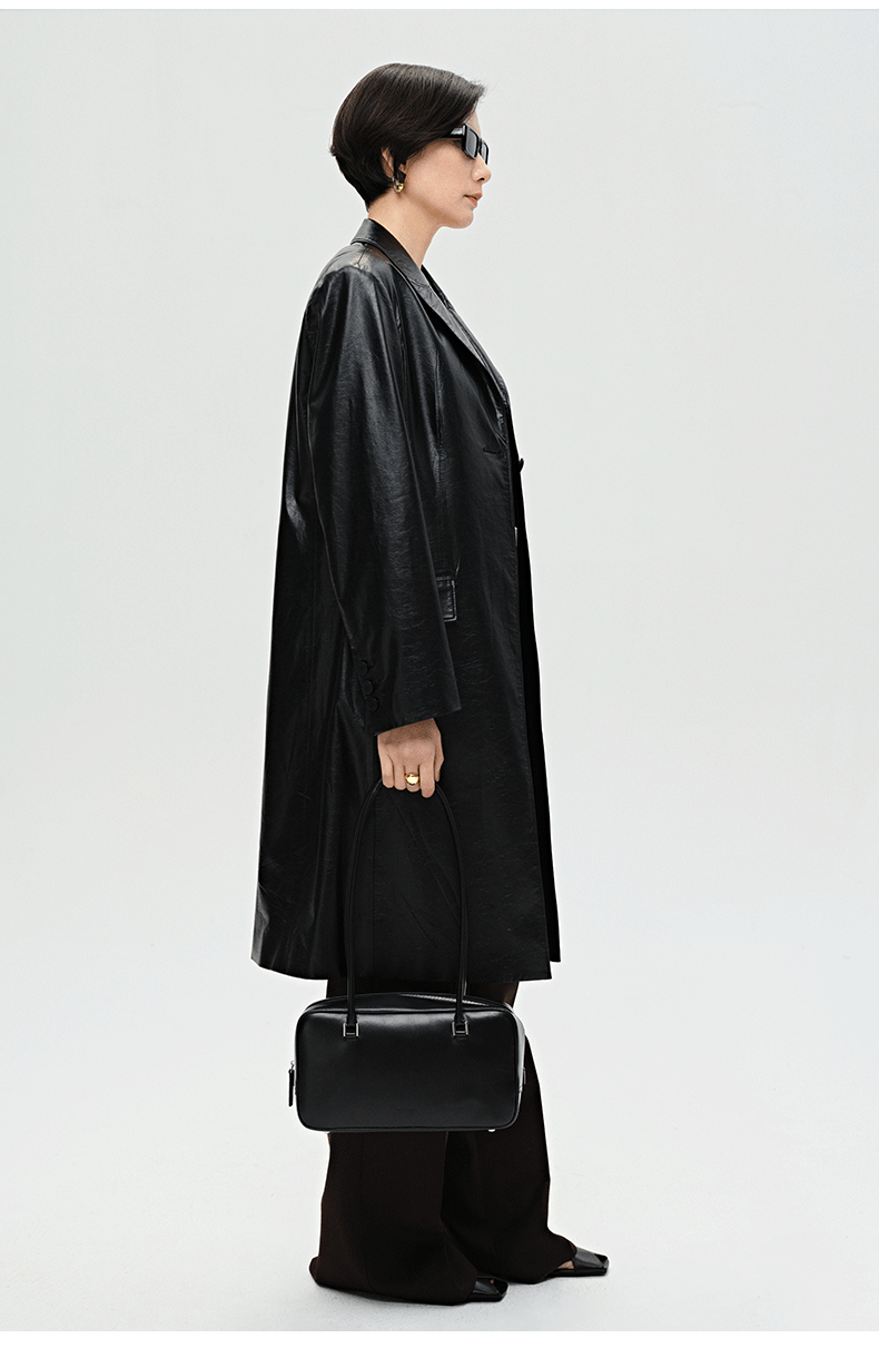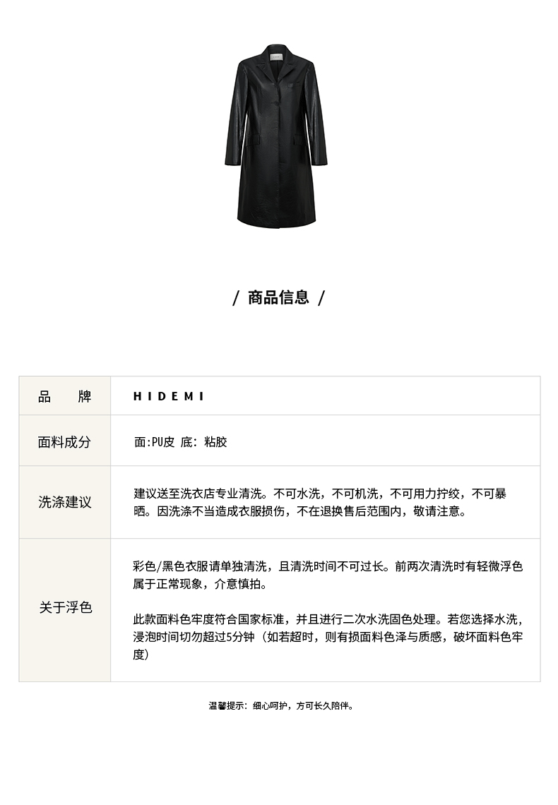 HIDEMI 黑色褶皱PU环保皮长款西装风衣皮衣