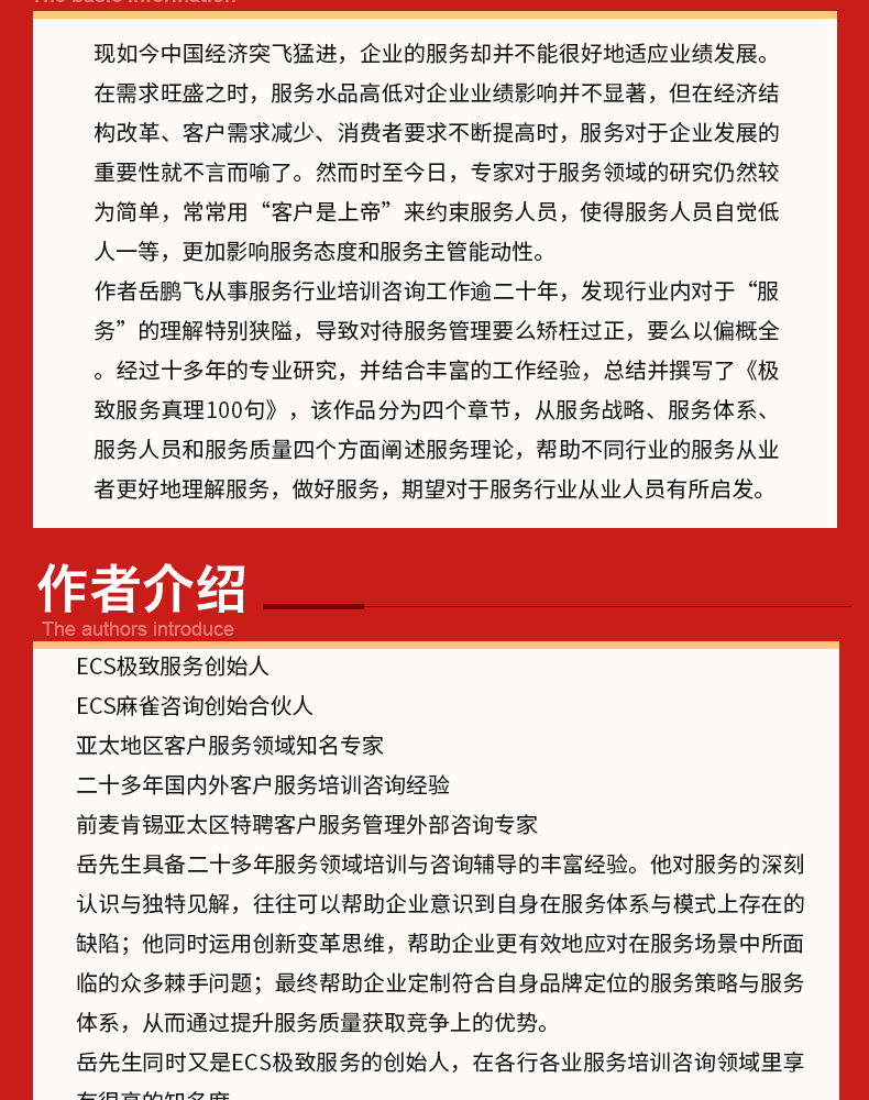 作者岳鹏飞从事服务行业培训咨询工作逾二十年,发现行业内对于“服务”的理解特别狭隘,导致对待服务管理要么矫枉过正,要么以偏概全。经过十多年的专业研究,并结合丰富的工作经验,总结并撰写了《*服务真理100句》,该作品分为四个章节,从服务战略、服务体系、服务人员和服务质量四个方面阐述服务理论,帮助不同行业的服务从业者更好地理解服务,做好服务,期望对于服务行业从业人员有所启发。
