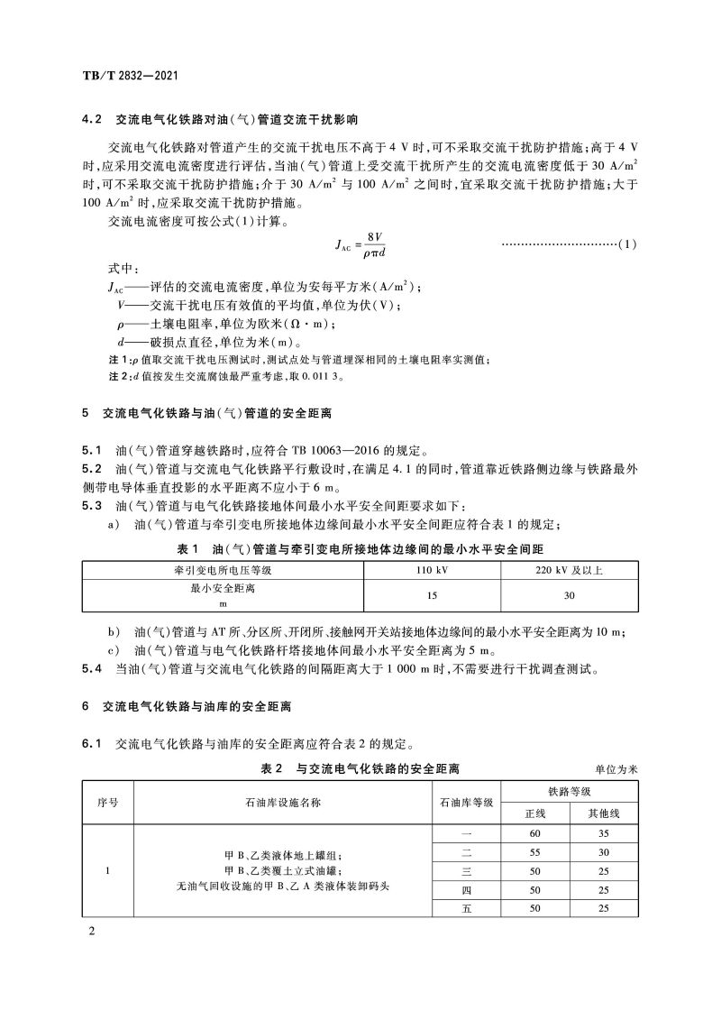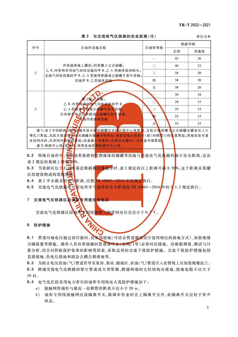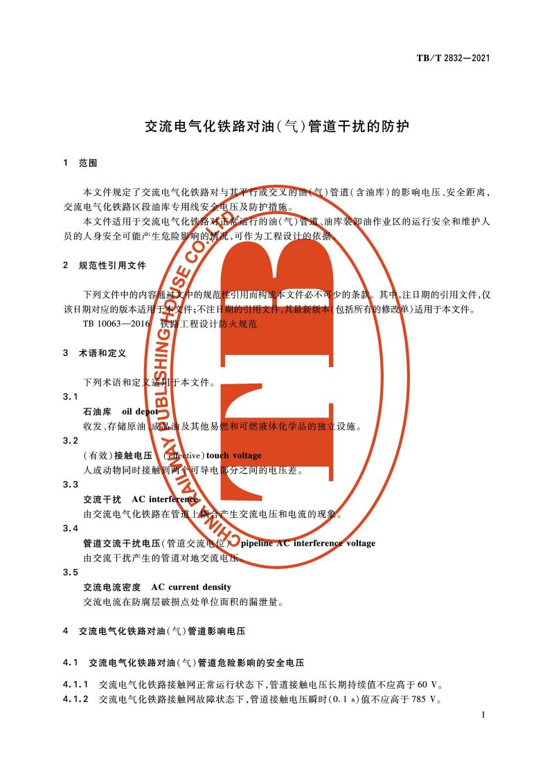 本标准为国家铁路局发布的中华人民共和国铁道行业标准,交流电气化铁路对油(气)管道干扰的防护 TB/T 2832-2021。本文件按照 GB/T 1.1—2020《标准化工作导则 第1部分:标准化文件的结构和起草规则》的规定起草。本文件代替TB/T 2832-1997《交流电气化铁道对油(气)管道(含油库)的影响容许值及防护措施》,规定了交流电气化铁路对与其平行或交叉的油(气)管道的影响电压、安全距离,交流电气化铁路区段油库专用线安全电压及防护措施。