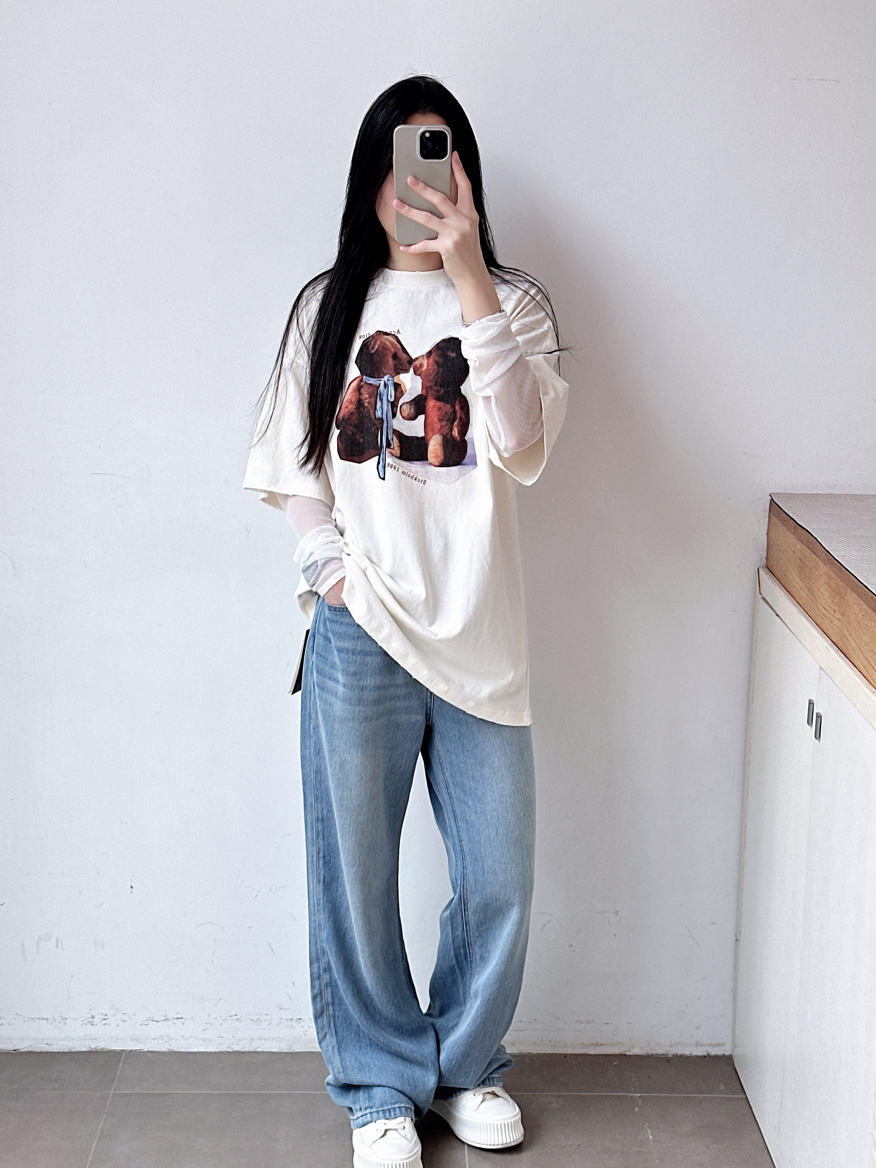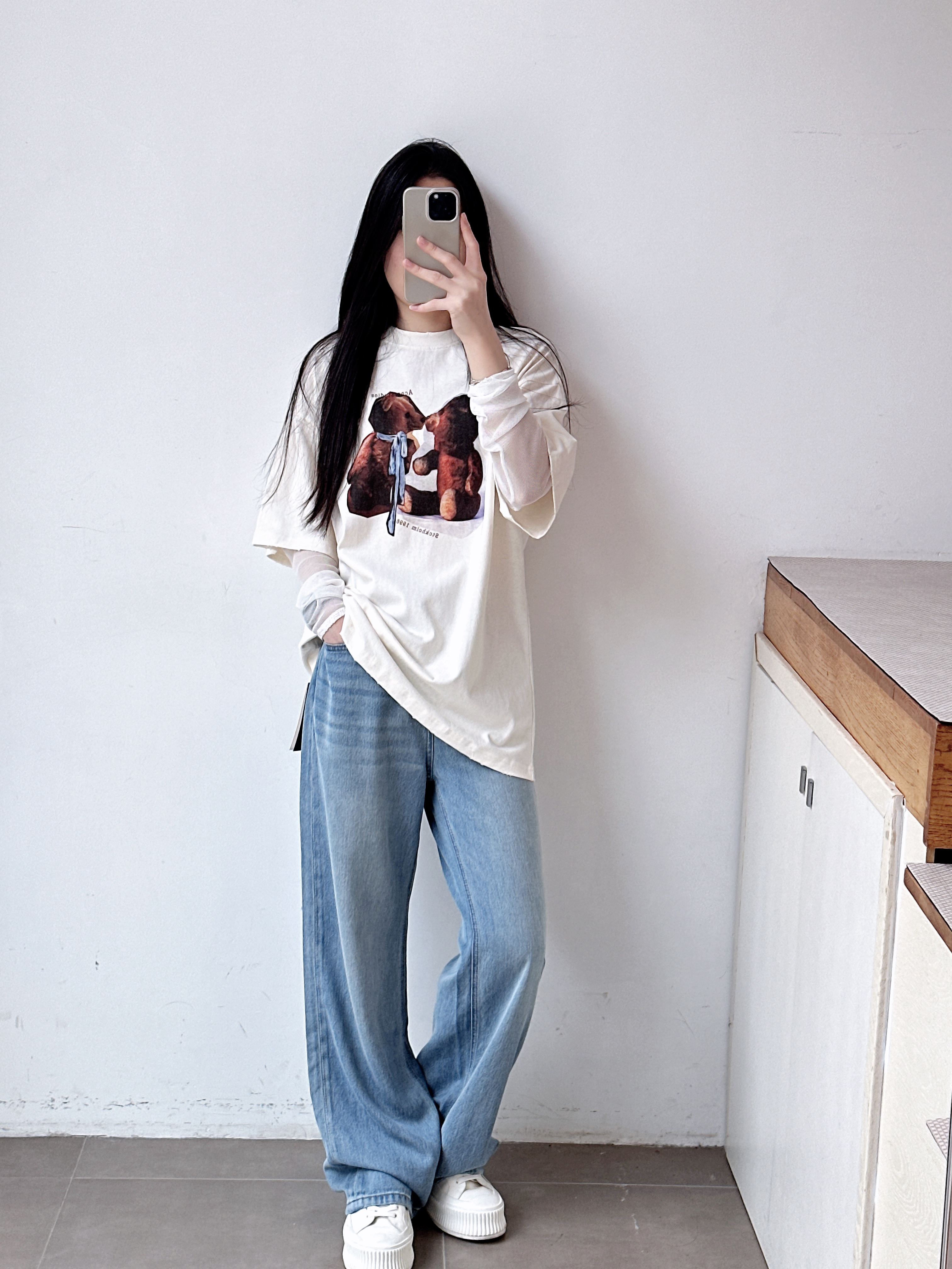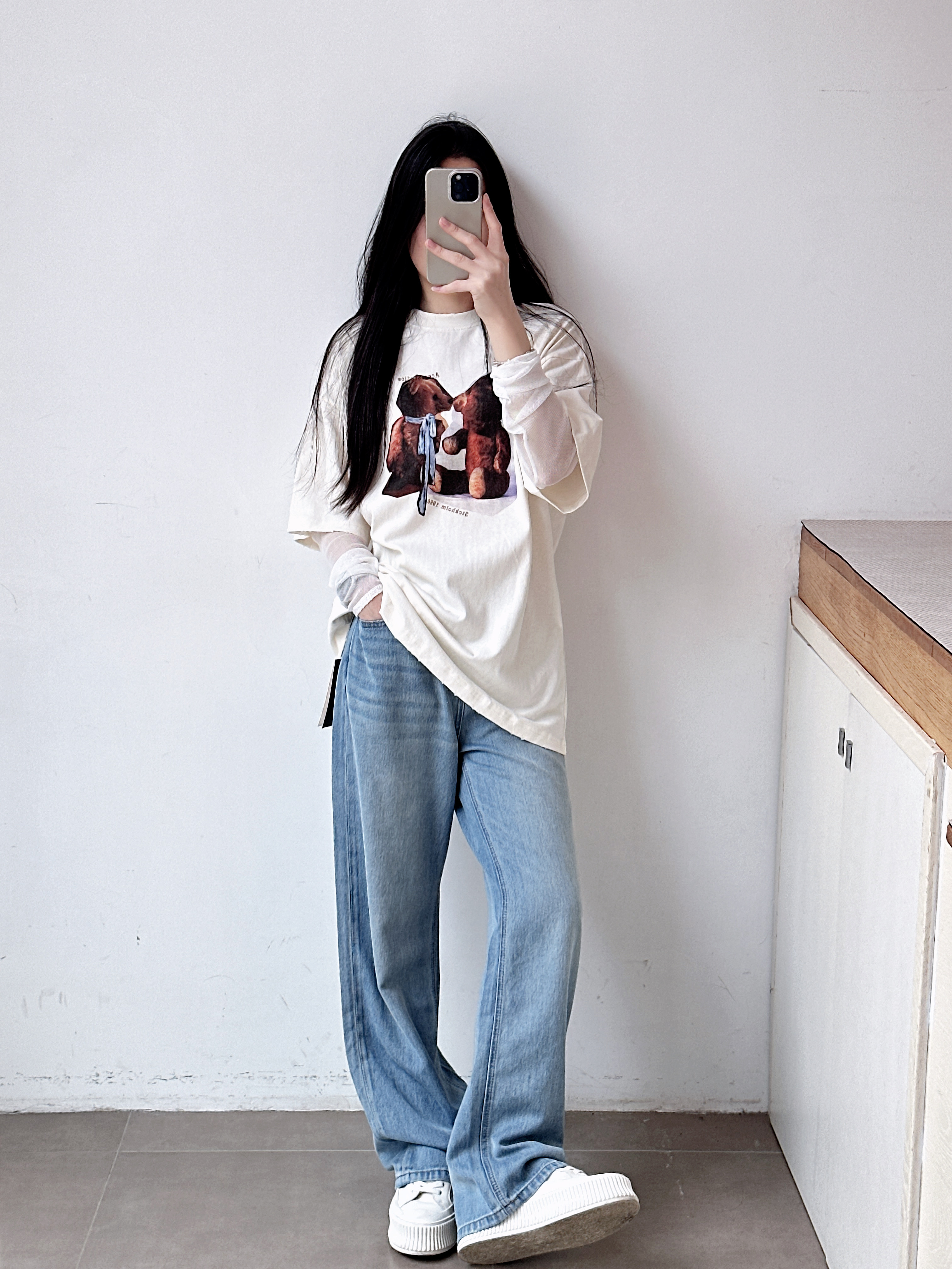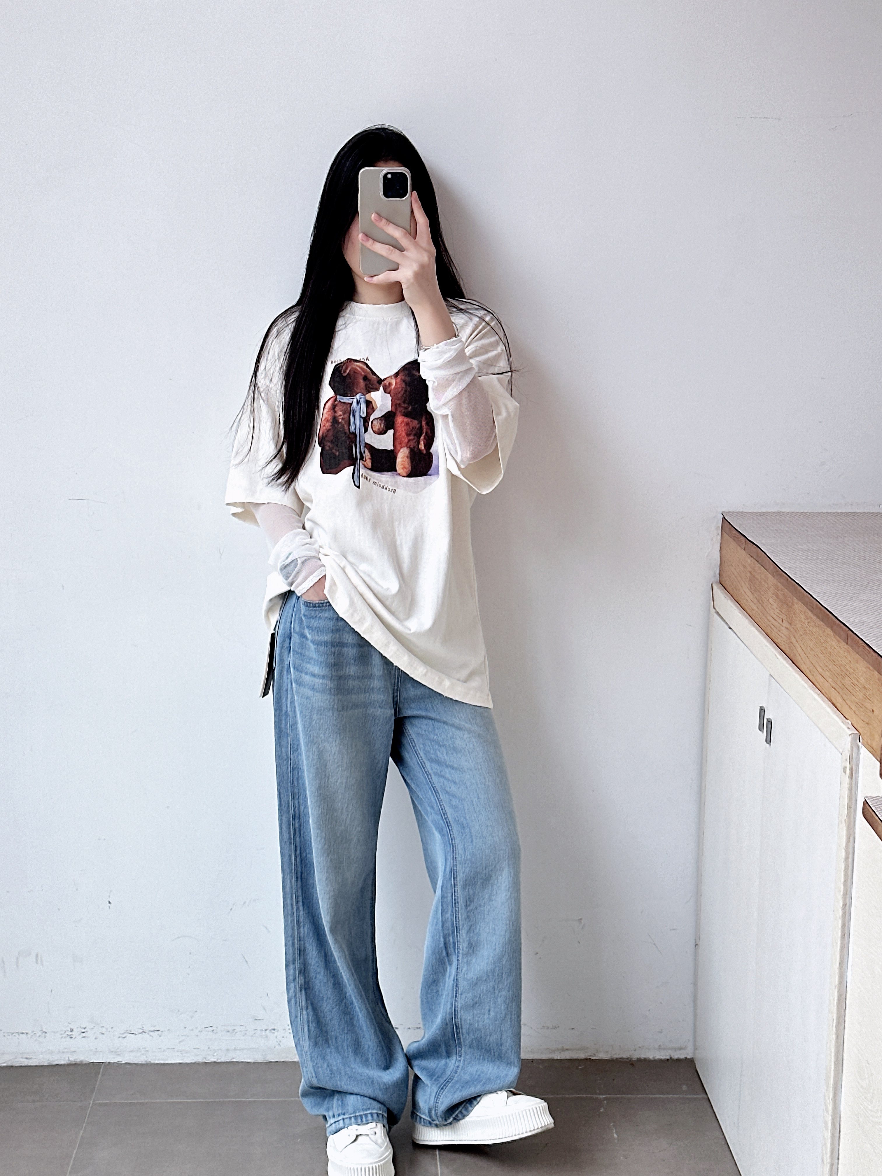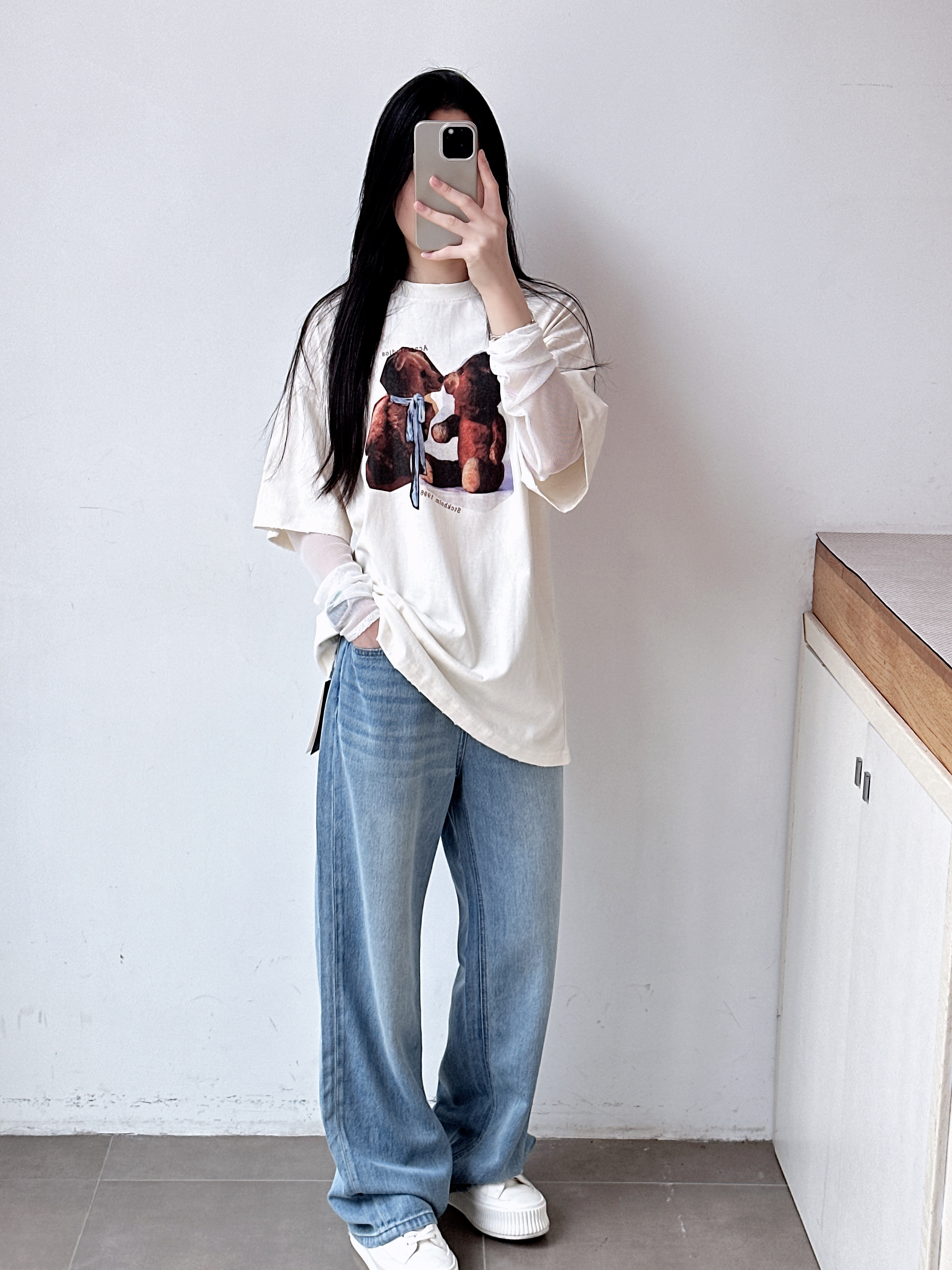 女士复古徽标印花宽松长袖T恤 假两件设计网纱拼接心机叠穿上衣